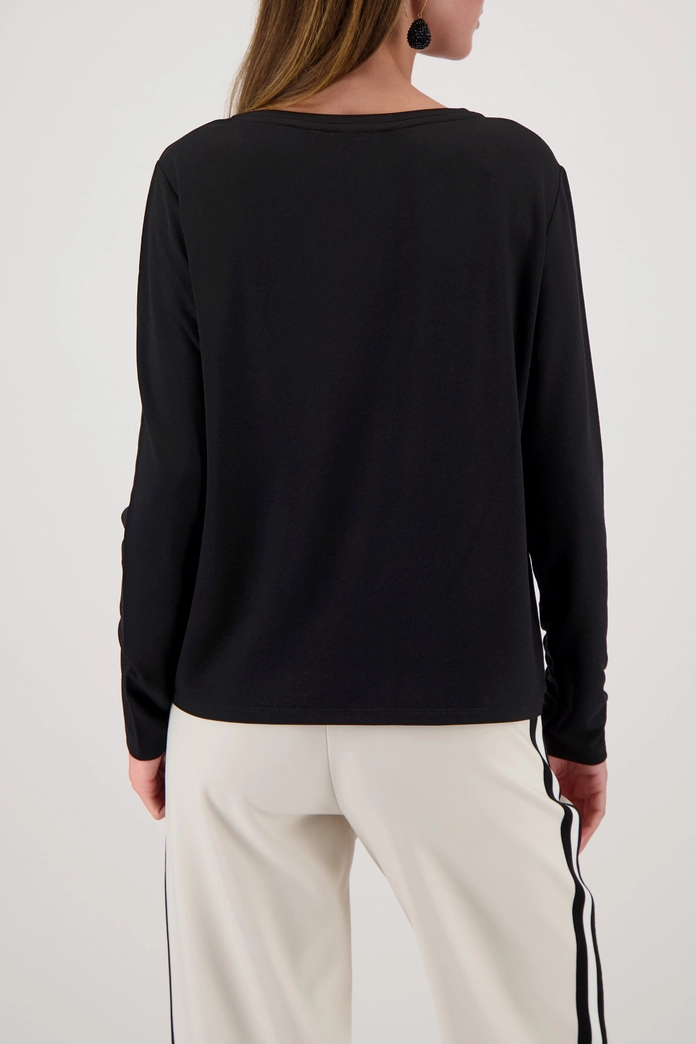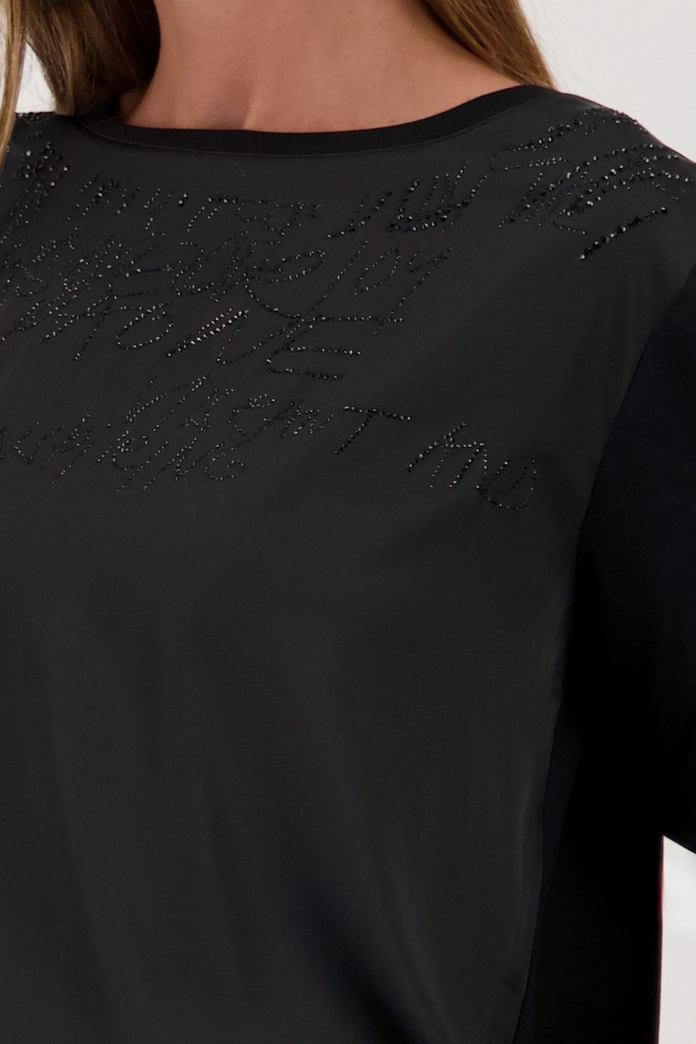 Elegantná blúzka s dlhým rukávom vyrobená zo splývavej viskózovej látky s trblietavým ozdobným nápisom.