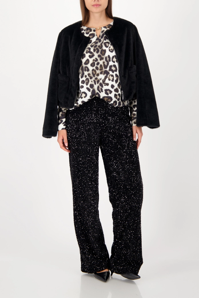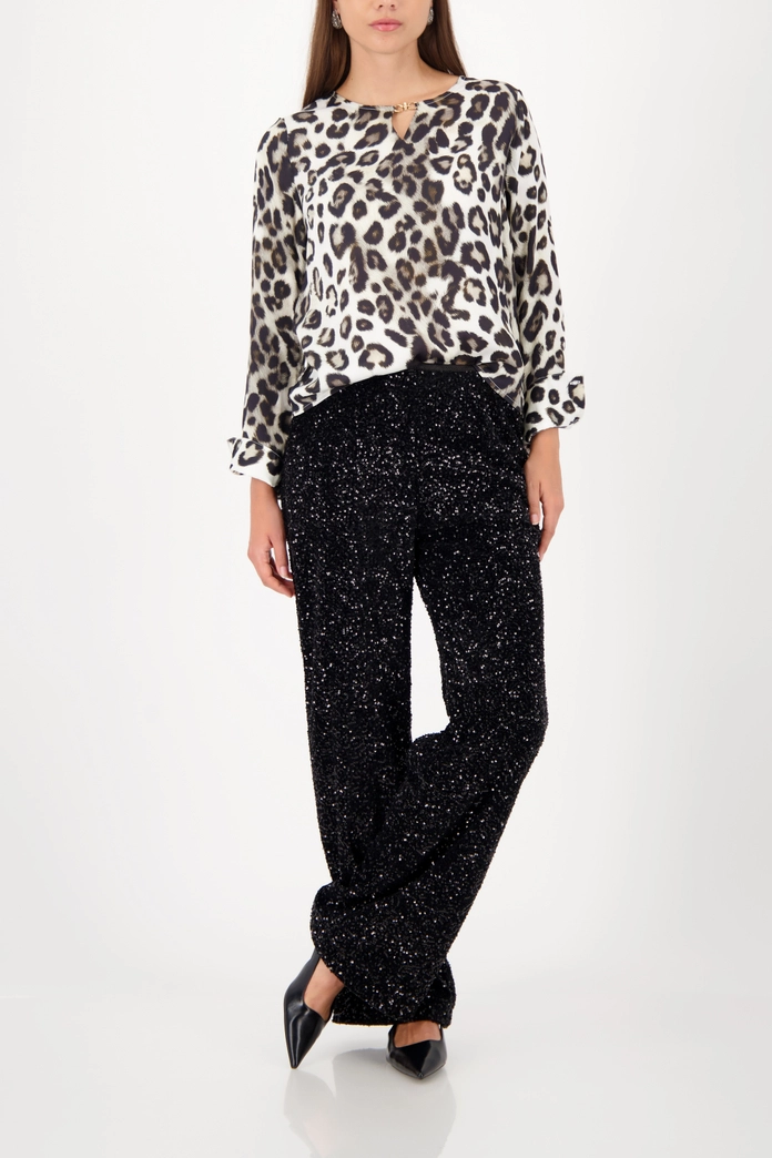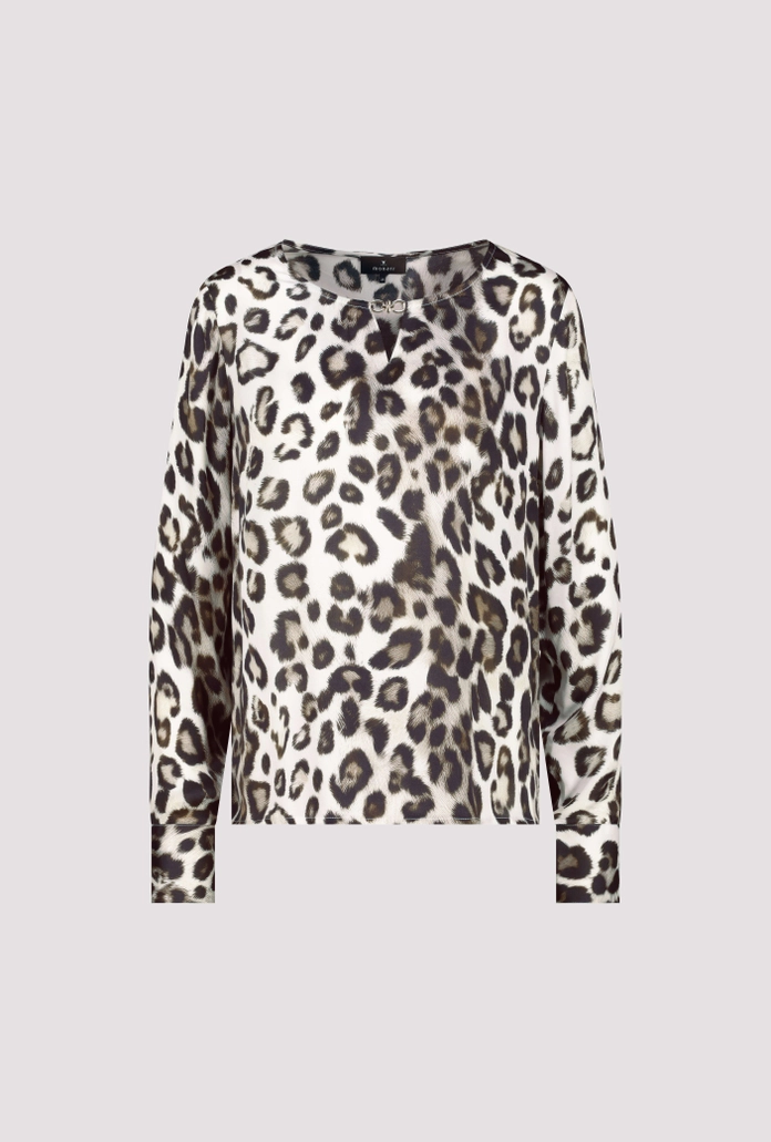 Elegantná blúzka vyrobená zo 100 % viskózy a saténu s leopardím vzorom a jemným šperkom. Ideálna na každú príležitosť.