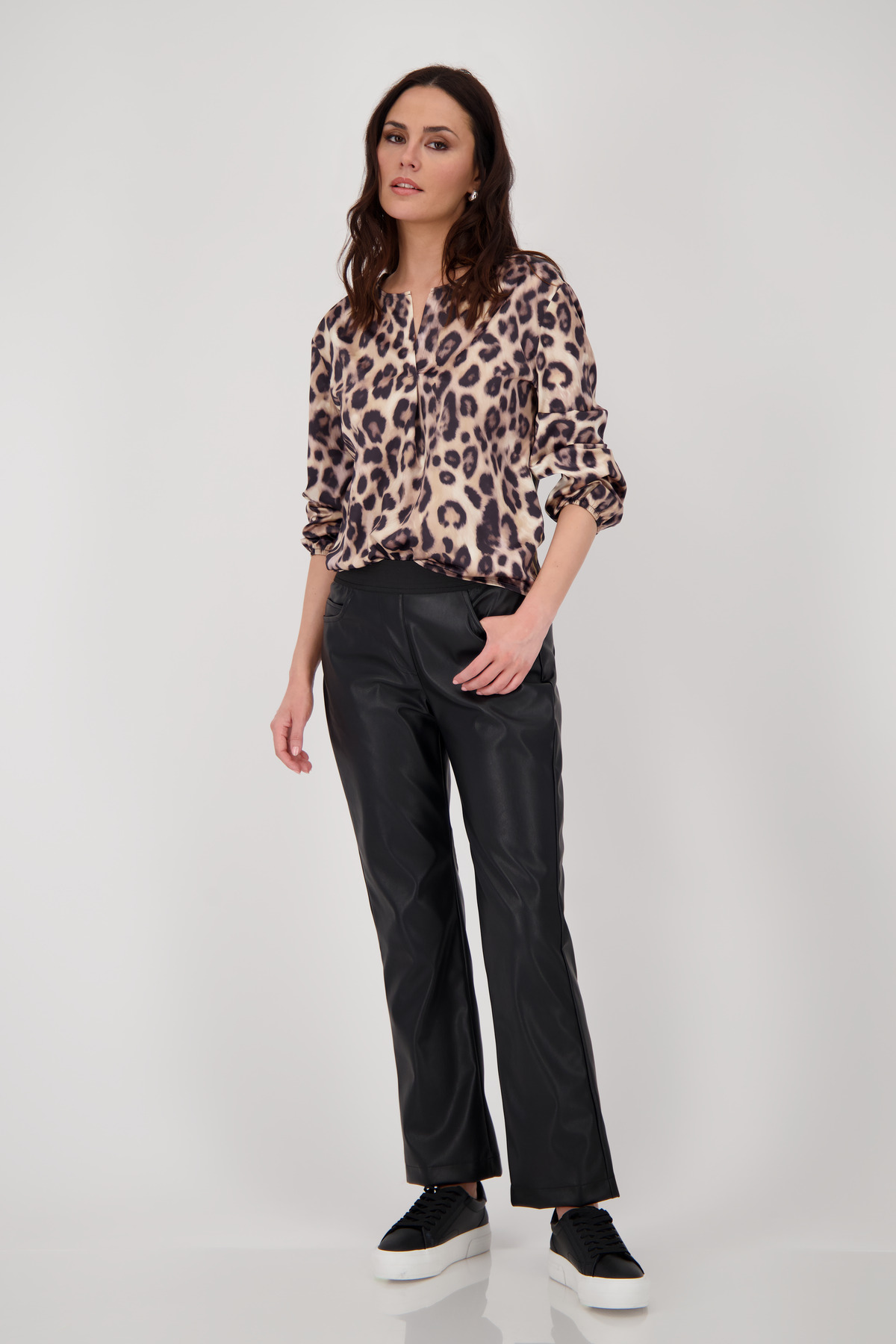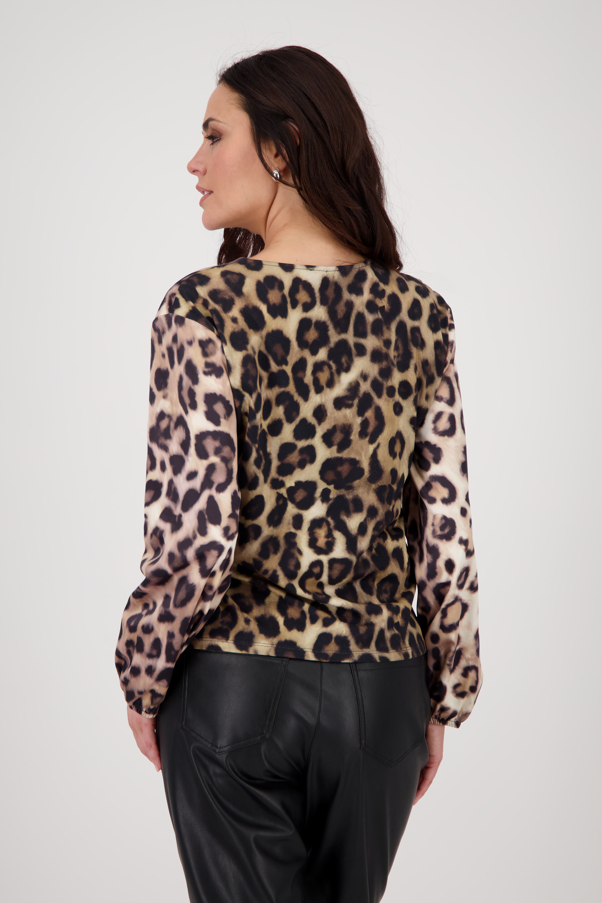 Celoplošná leopardia potlač a okrúhly výstrih s rozparkom vytvárajú štýlový, ženský a pohodlný vzhľad.