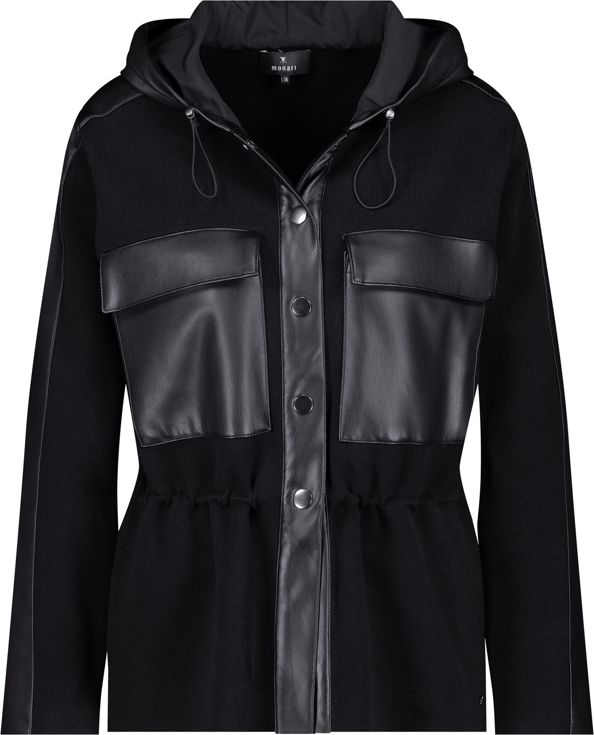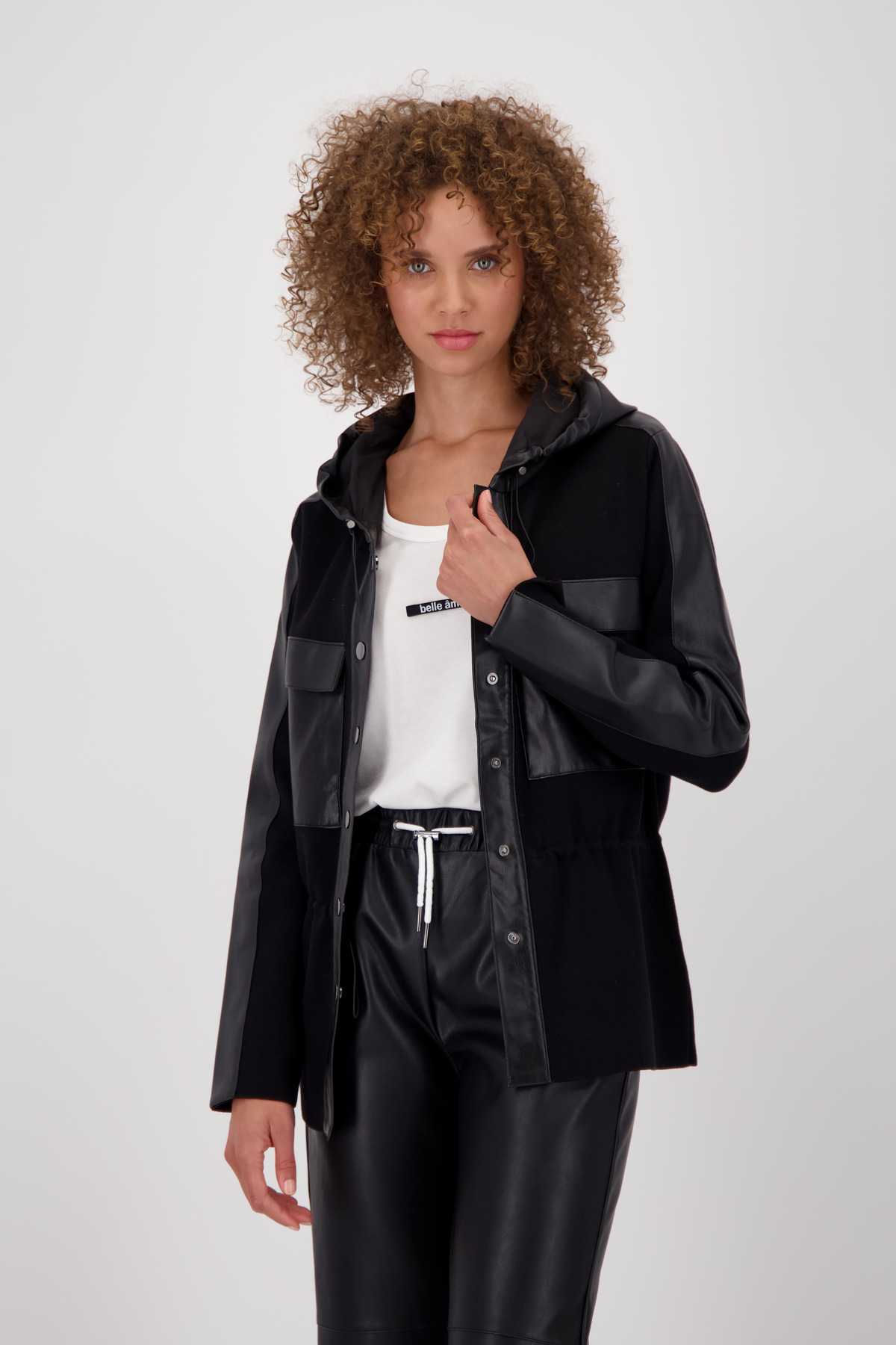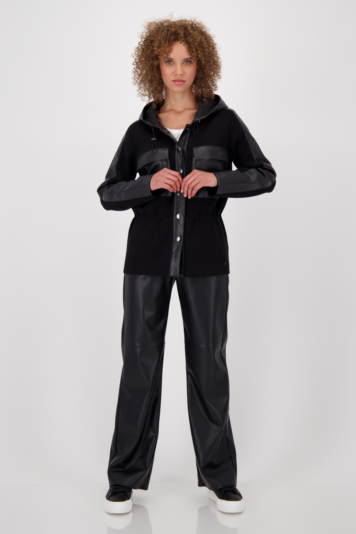 Tento štýlový kardigan s kapucňou kombinuje vysoko kvalitnú bavlnu, splývavú viskózu a elegantný kožený vzhľad.