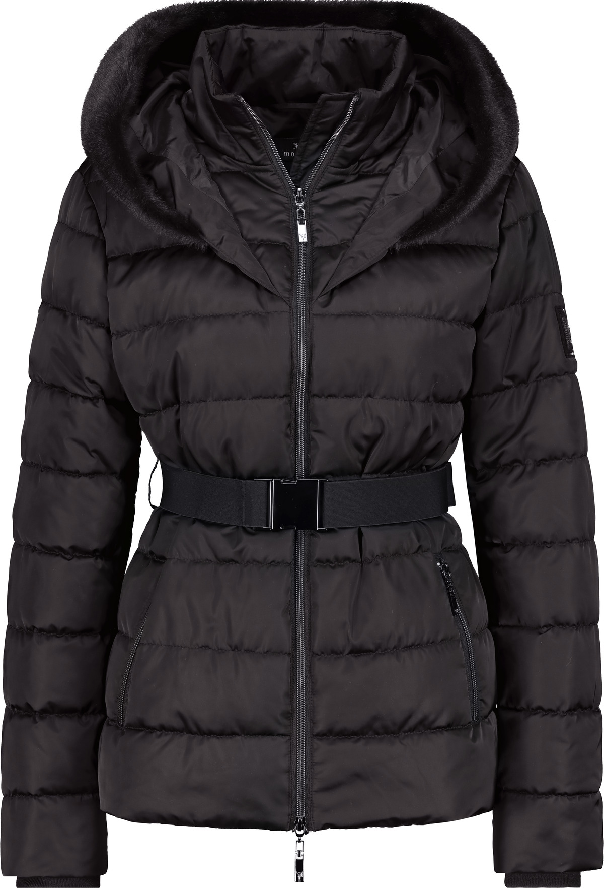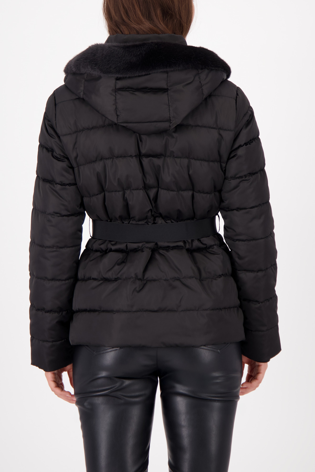Elegantná prešívaná bunda s opaskom v páse, kapucňou z umelej kožušiny a vreckami na zips – ideálna pre štýlové milovníčky módy.