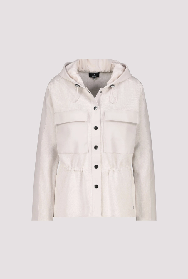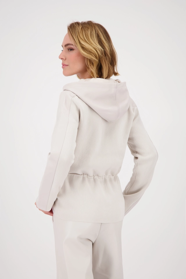 Tento štýlový kardigan s kapucňou kombinuje vysoko kvalitnú bavlnu, splývavú viskózu a elegantný kožený vzhľad.