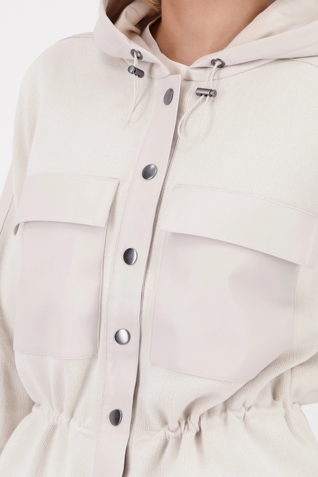 Praktické detaily, ako je elastická šnúrka na sťahovanie, vrecká s klopou a zapínanie na gombíky, dotvárajú ženský vzhľad.