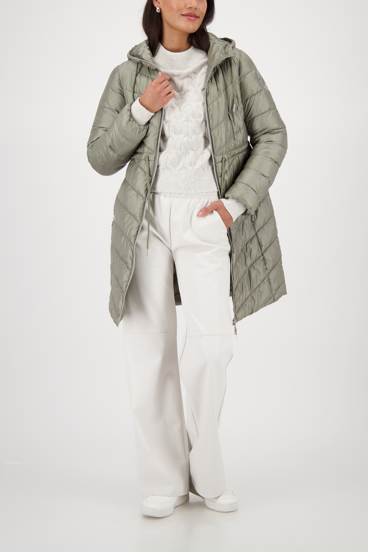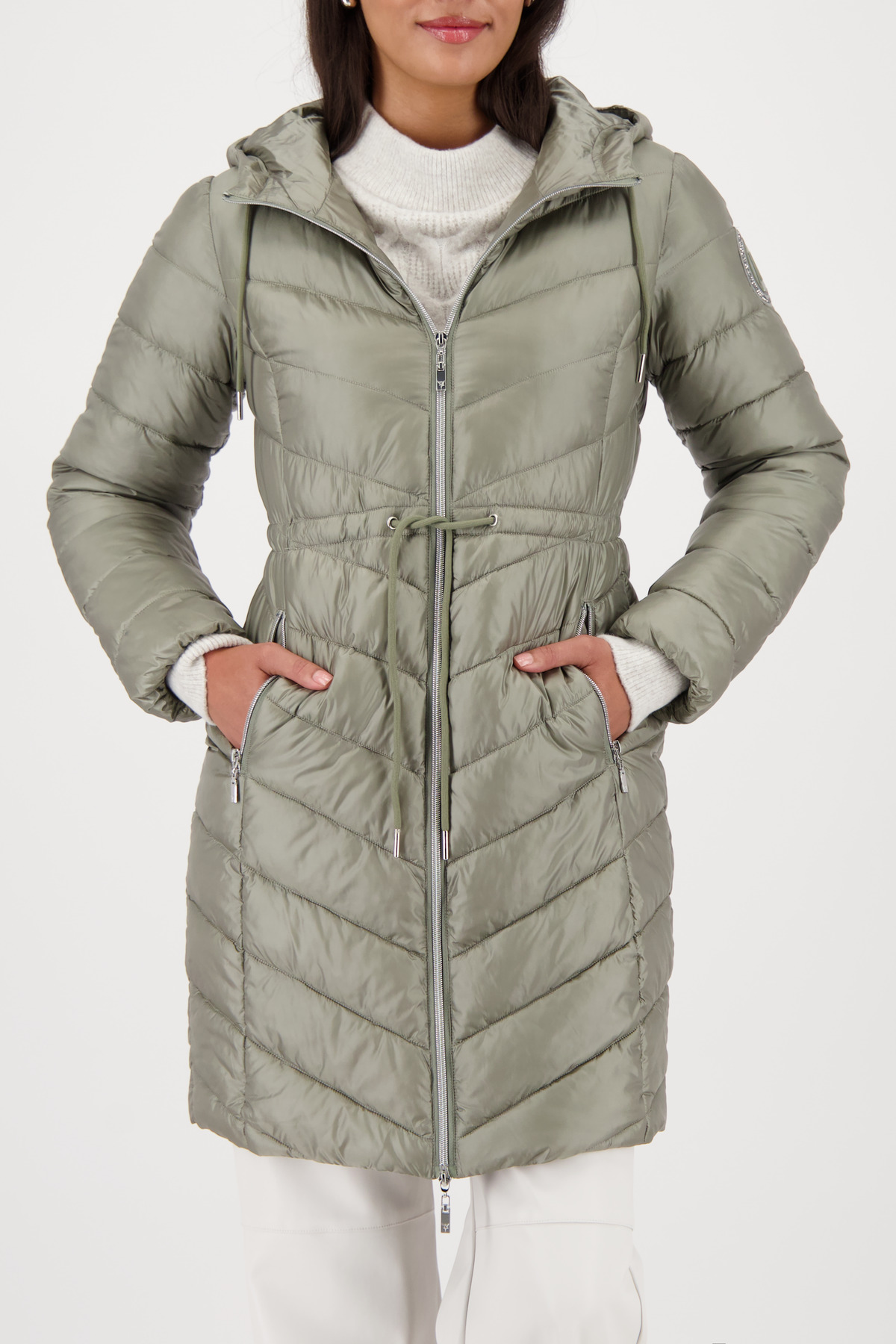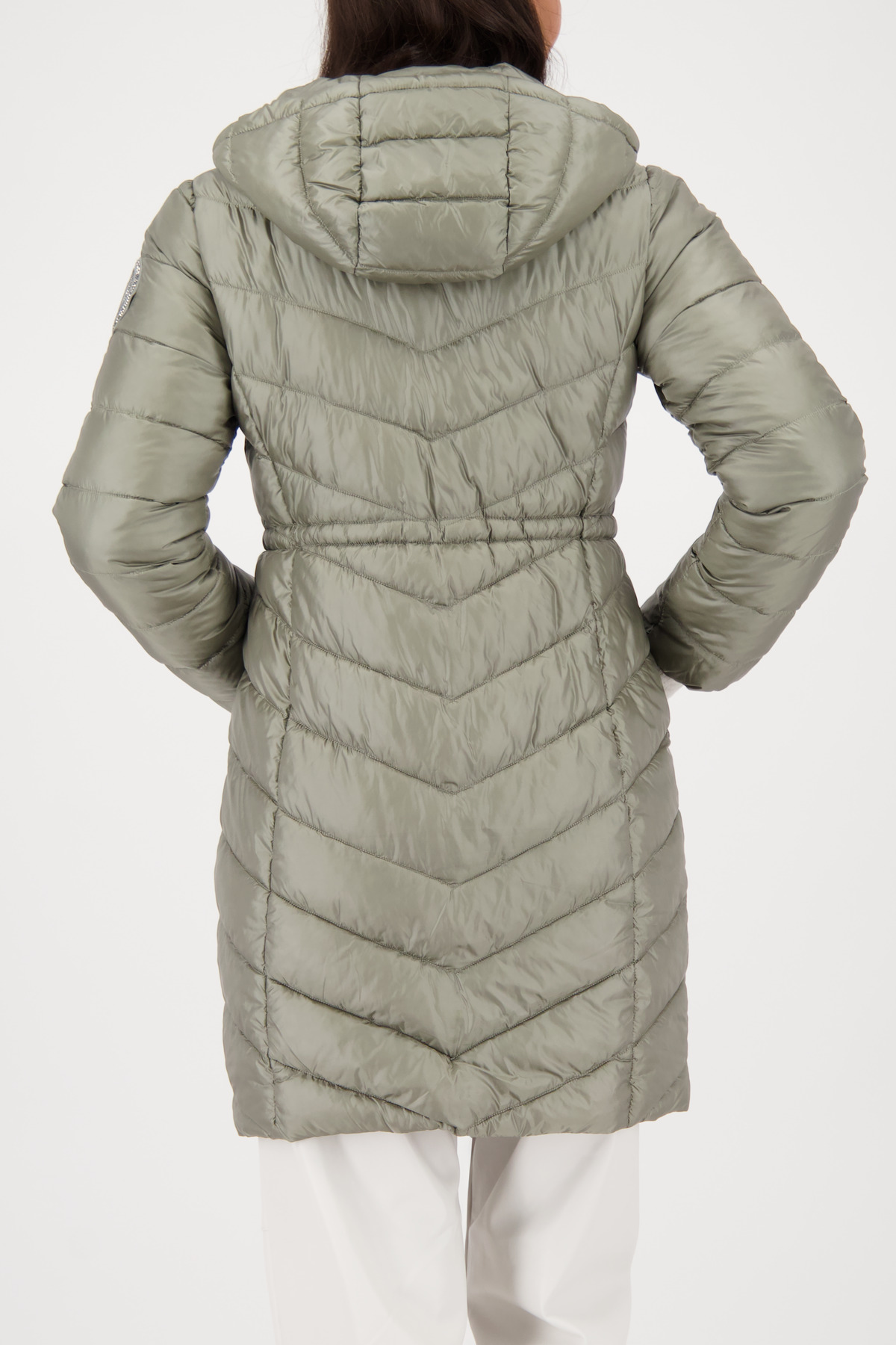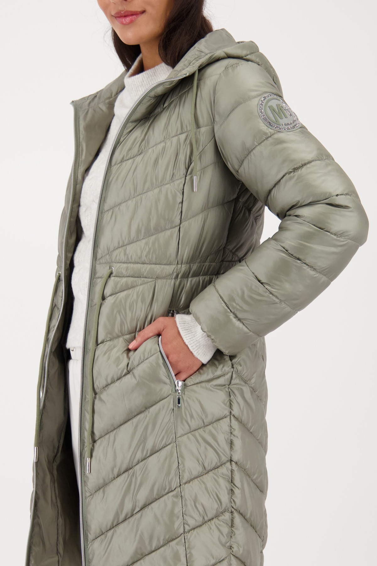 Elegantný prešívaný kabát s kapucňou, nášivkou na rukáve a praktickými vreckami – štýlový outdoorový spoločník pre sebavedomých trendsetterov.