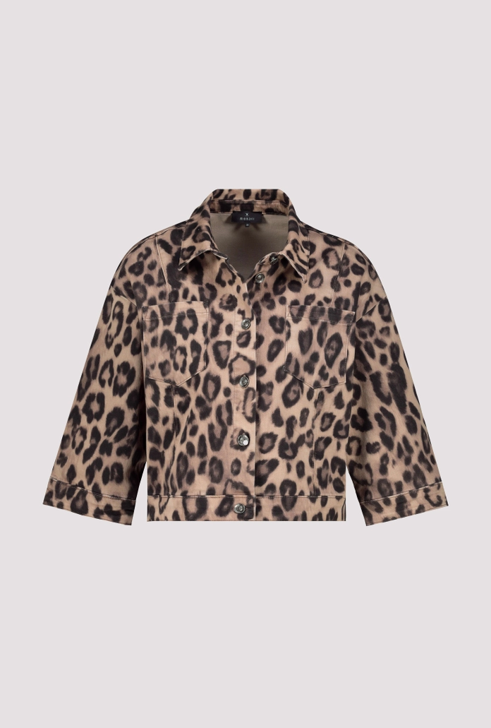 Bunda vyrobená z vysoko kvalitnej bavlnenej zmesi s elastickým materiálom a leopardím vzorom, s ¾ rukávmi a našitými náprsnými vreckami.