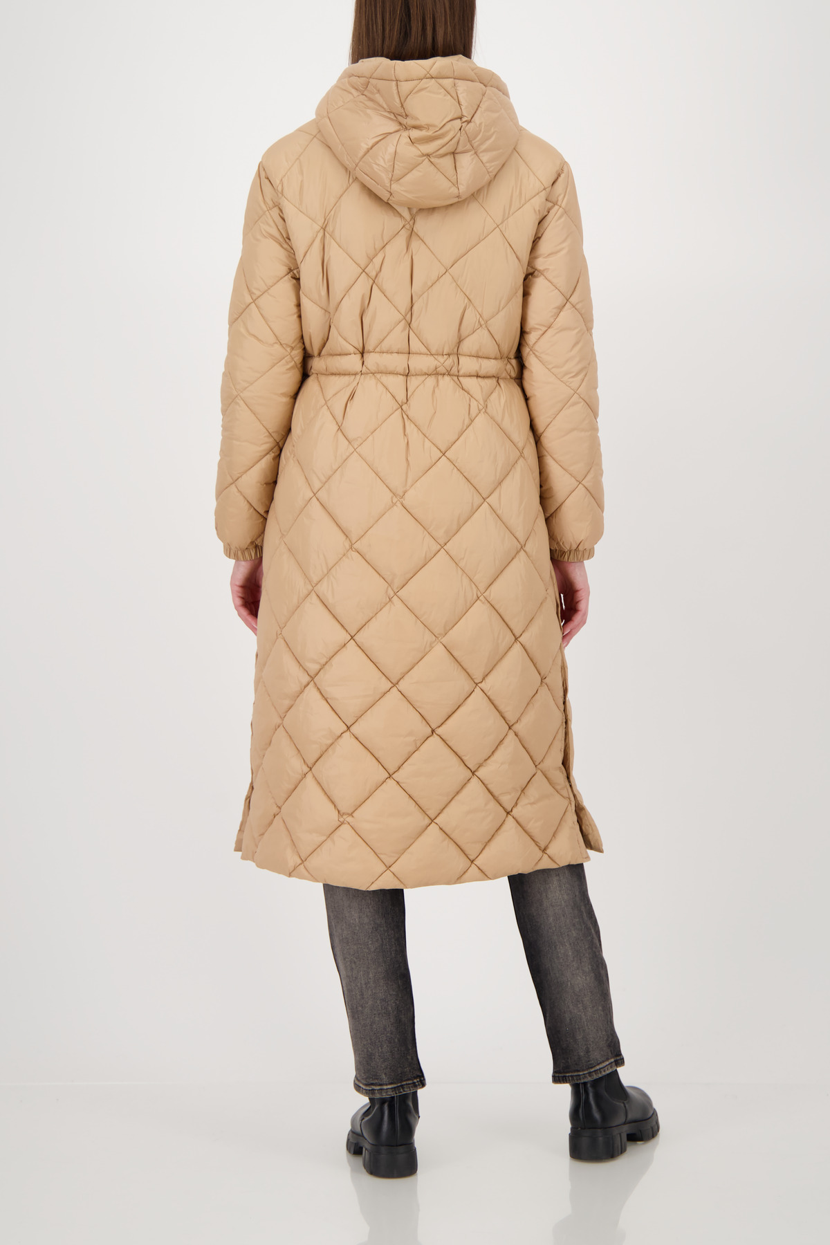 Moderný prešívaný kabát s kapucňou, elegantným zapínaním na patentný cvok a praktickými vreckami.