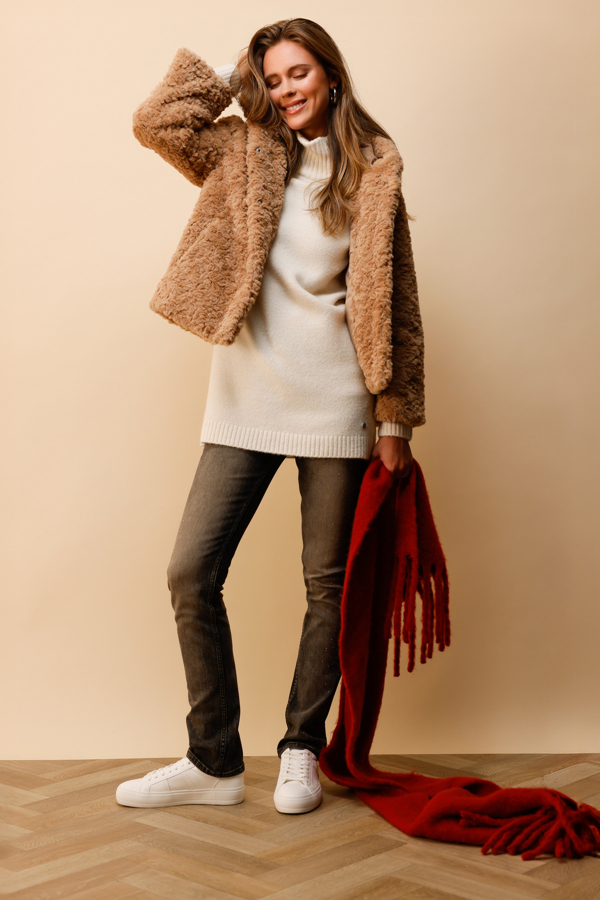 Táto štýlová bunda z umelej kožušiny s kapucňou očarí svojím nadýchaným pocitom a elegantnými trojštvrťovými rukávmi.