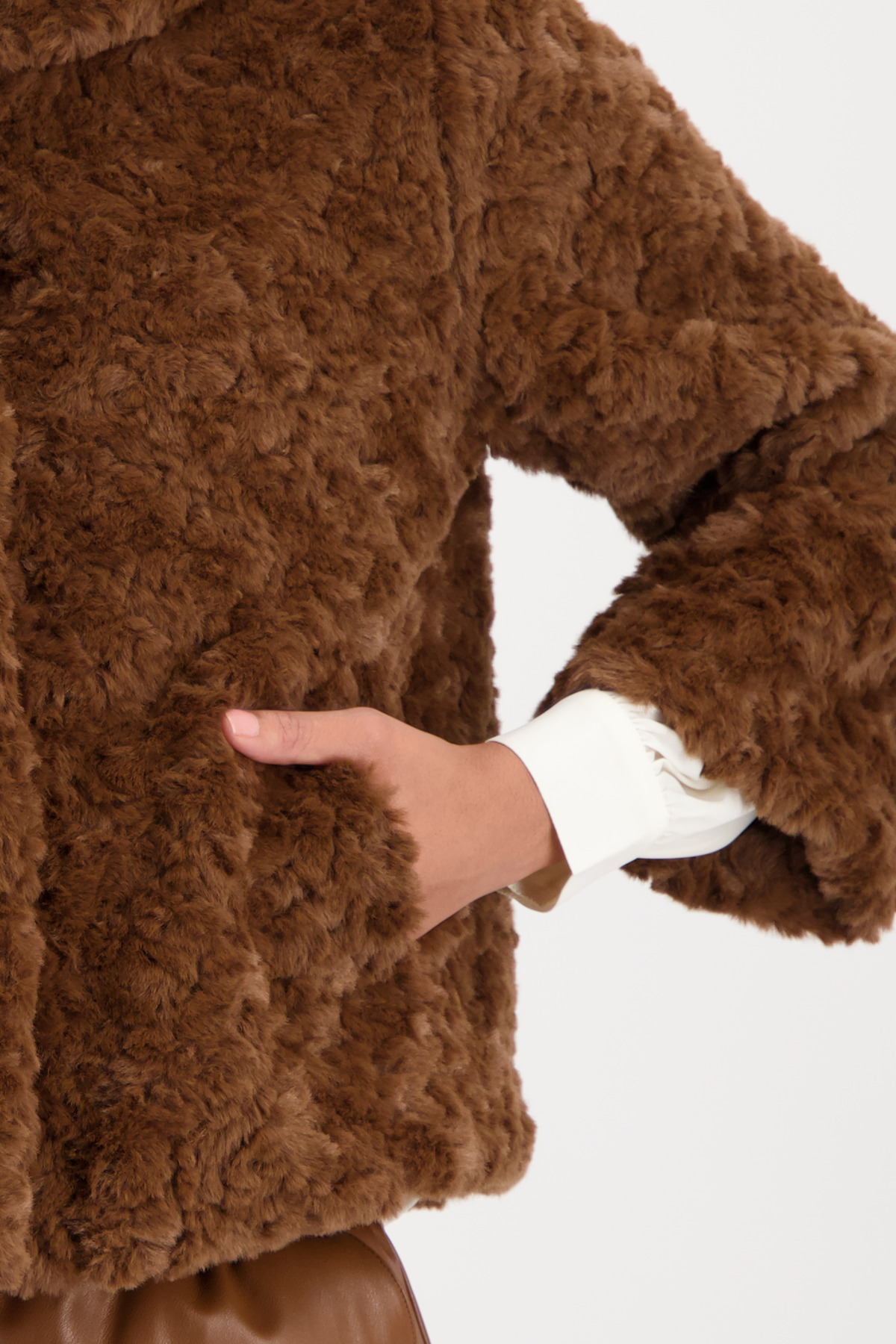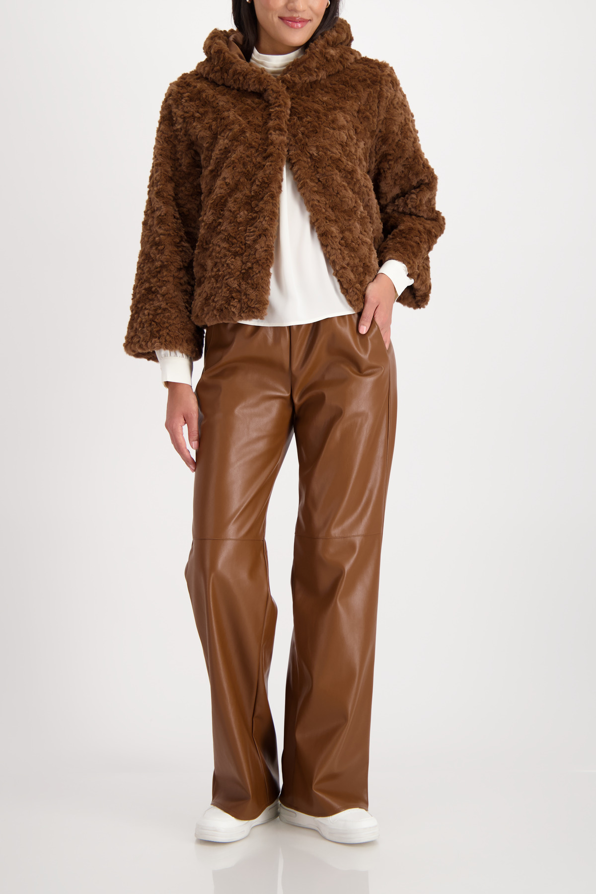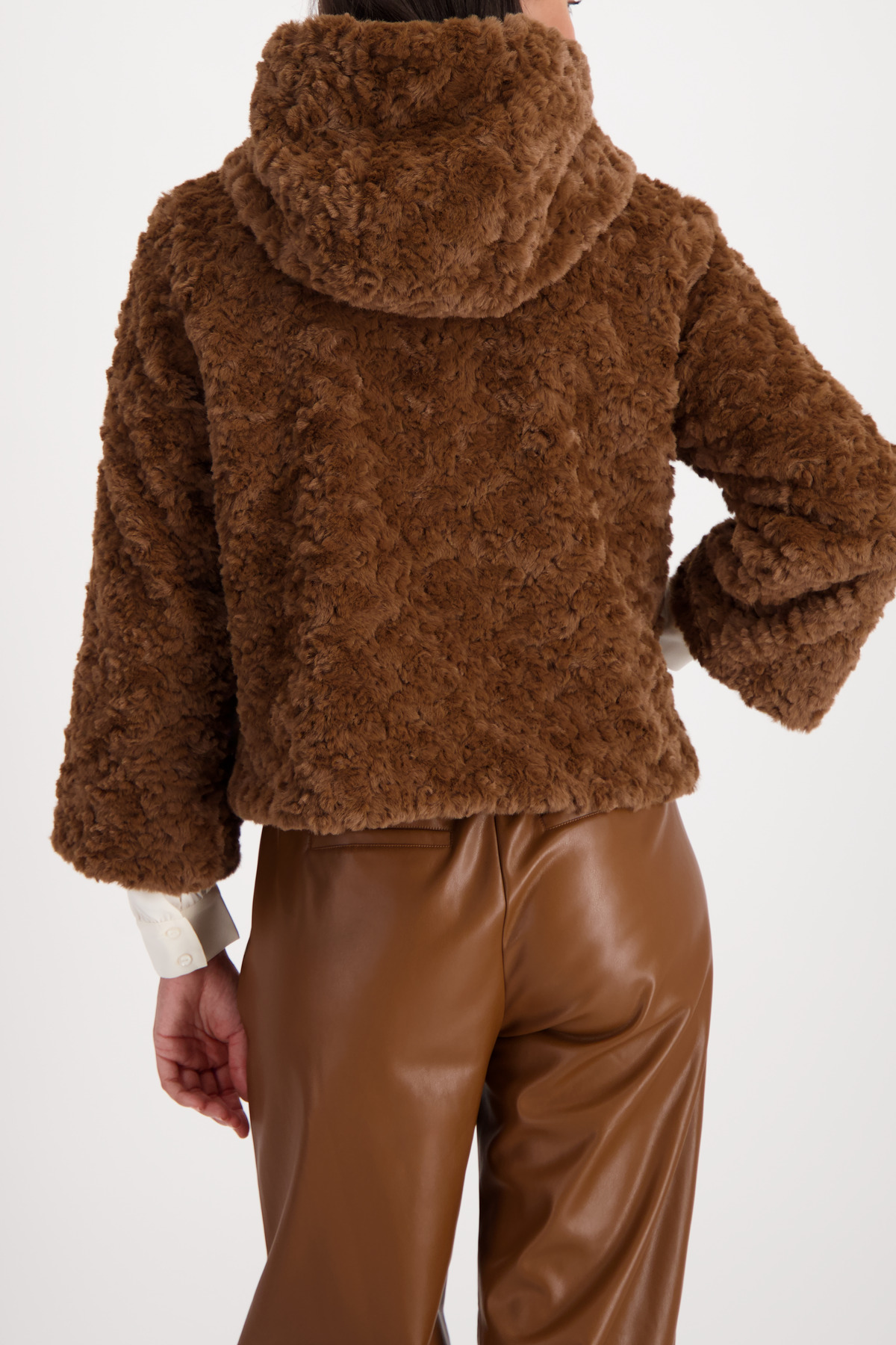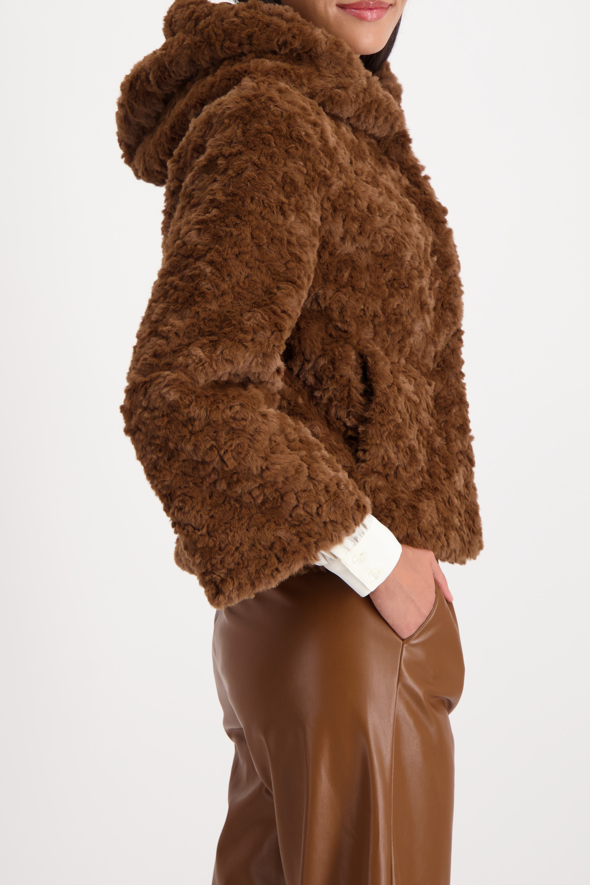 Táto štýlová bunda z umelej kožušiny s kapucňou očarí svojím nadýchaným pocitom a elegantnými trojštvrťovými rukávmi.