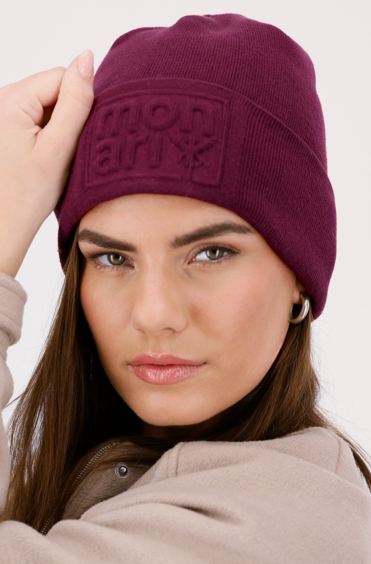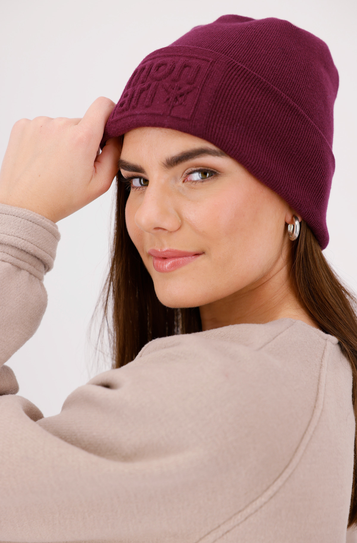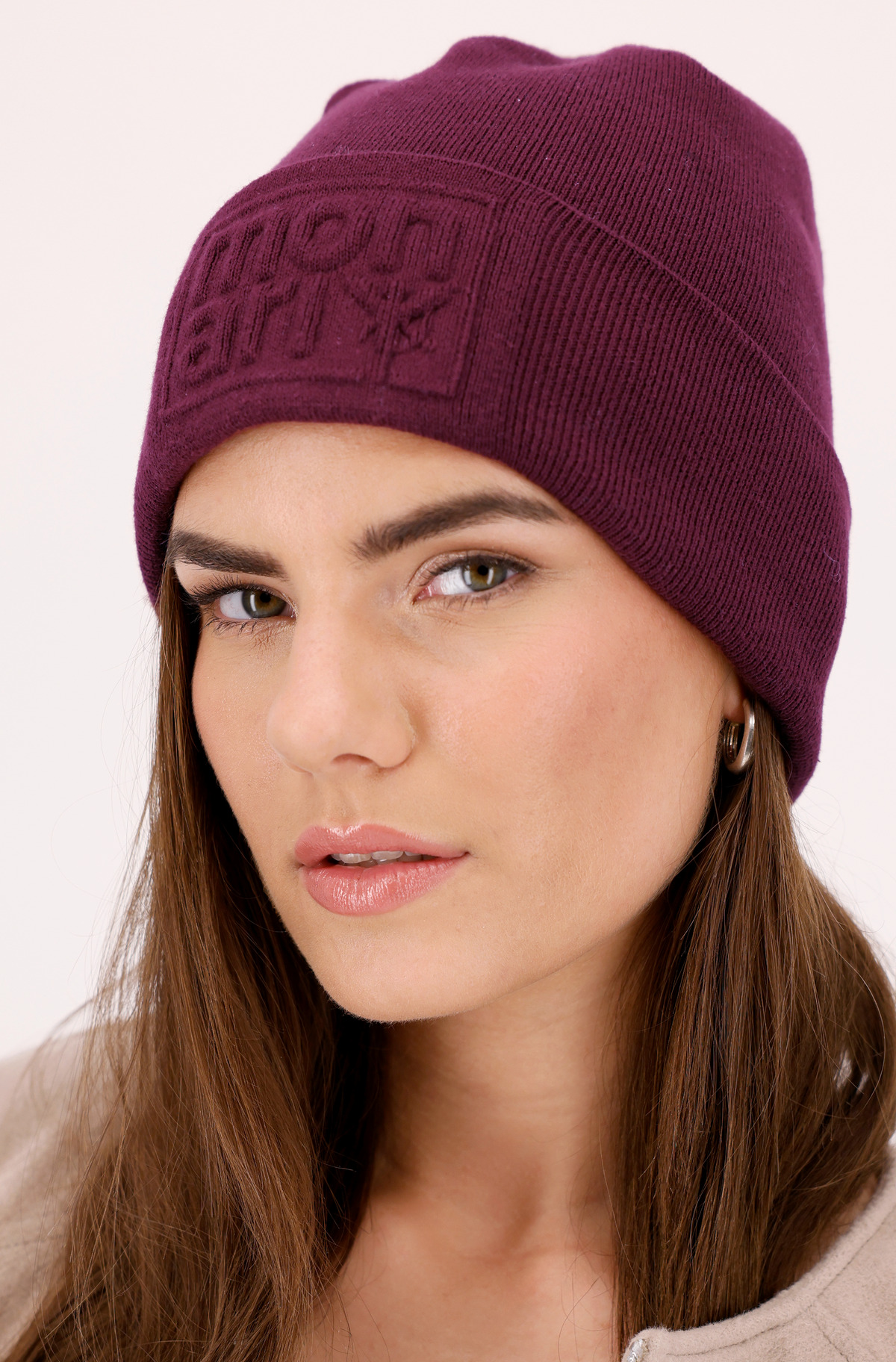Elegantná pletená čiapka beanie s reliéfnym dizajnom a štýlovým zrolovaným lemom – dodá každému outfitu moderný nádych.