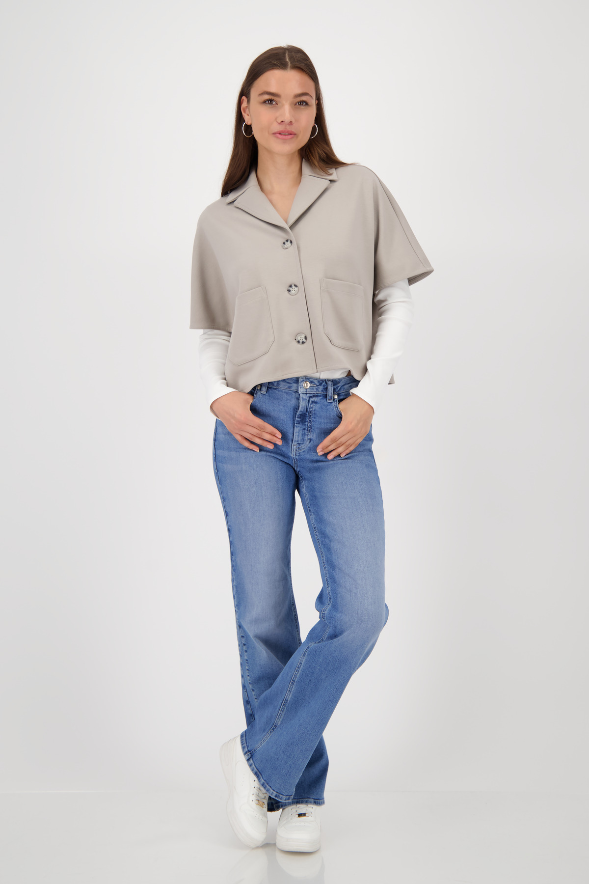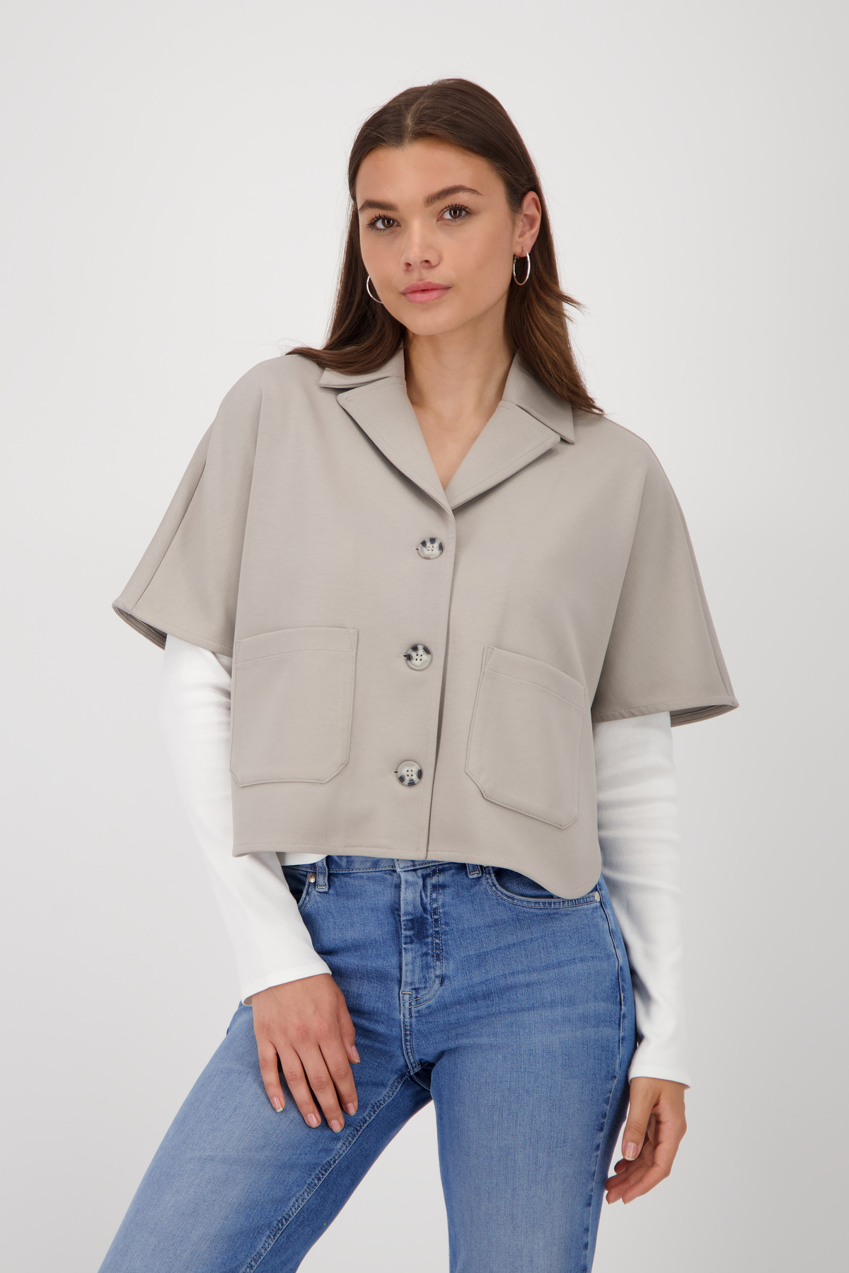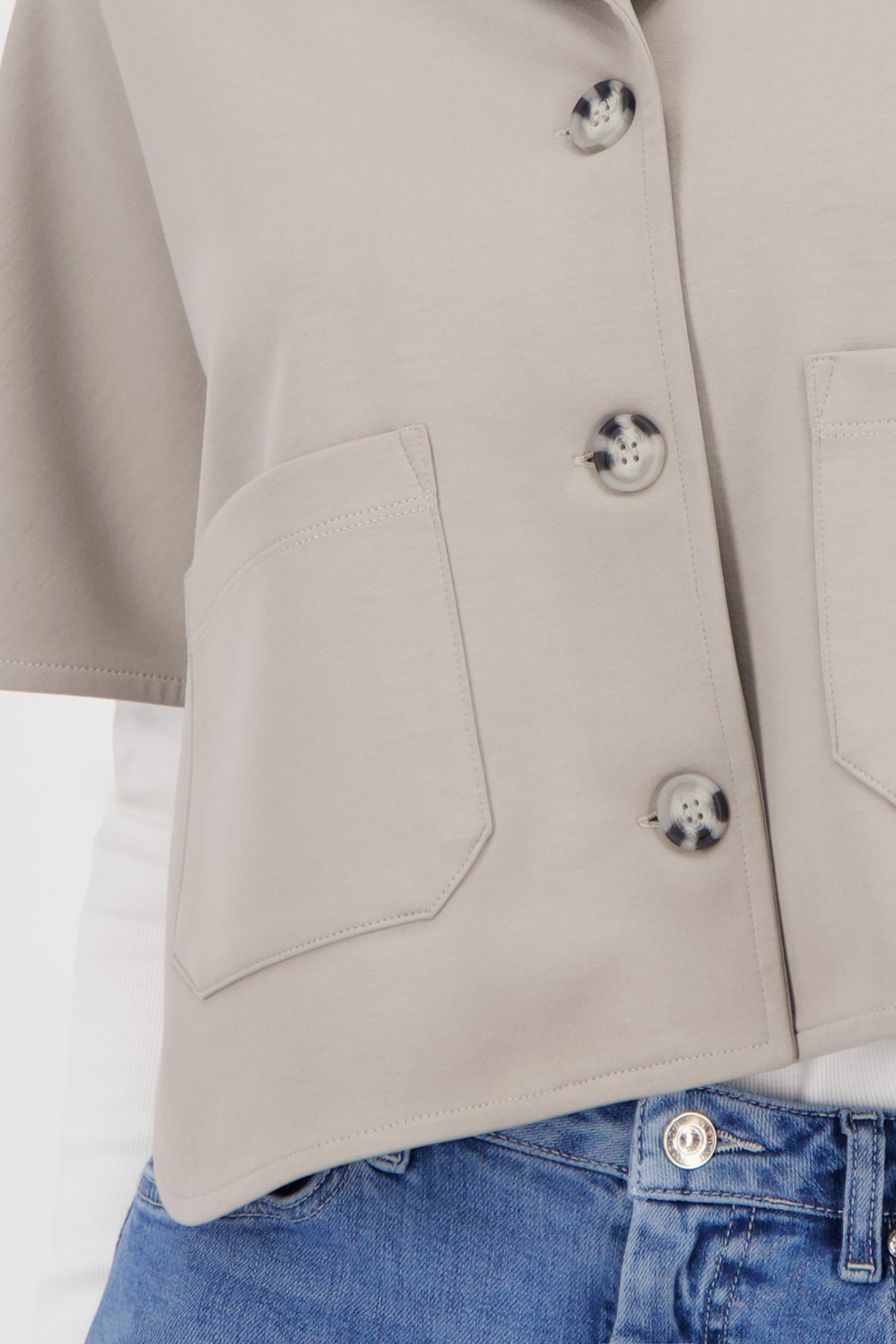 Klopový golier a našité vrecká dodávajú vzhľadu elegantný, nadčasový vzhľad.