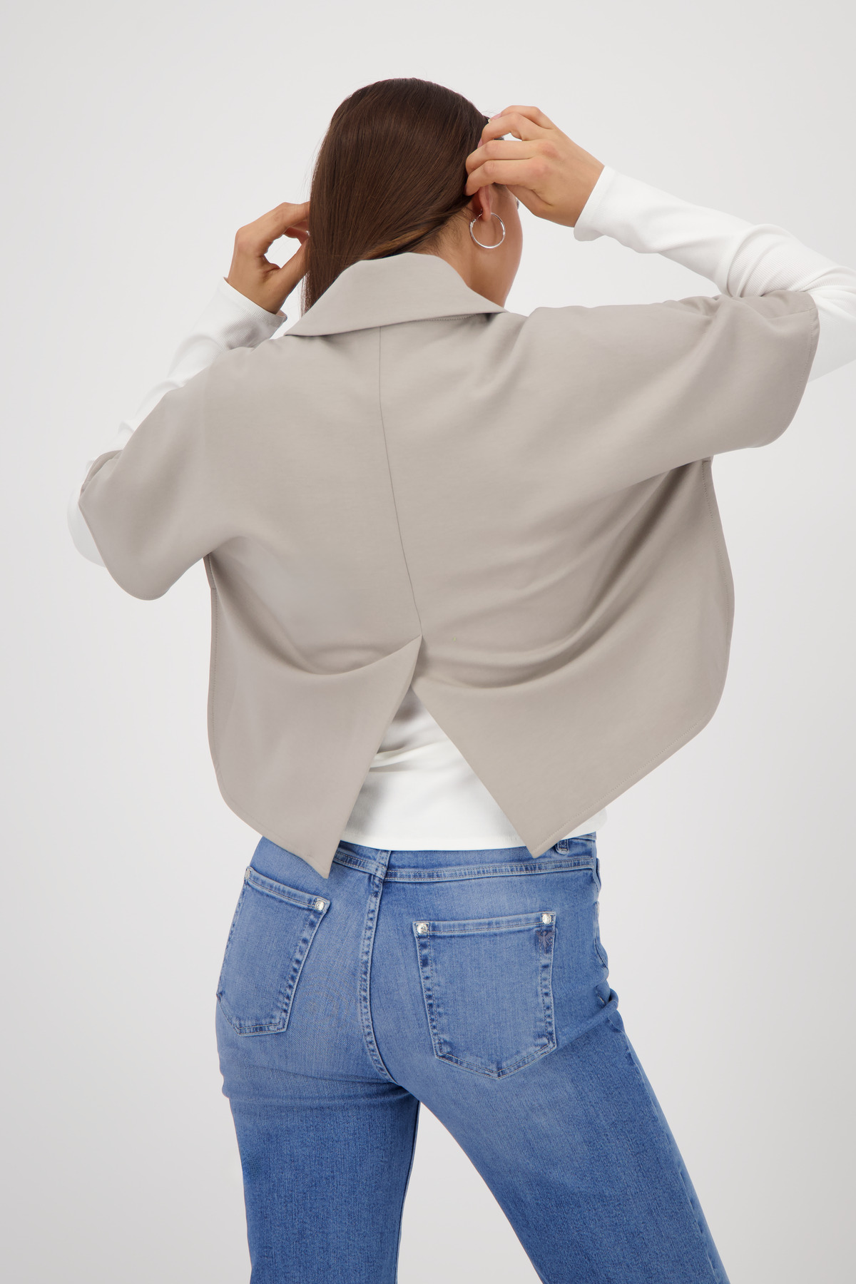 Moderný plášť zo splývavej viskózy s elastickým materiálom pre pohodlné nosenie.