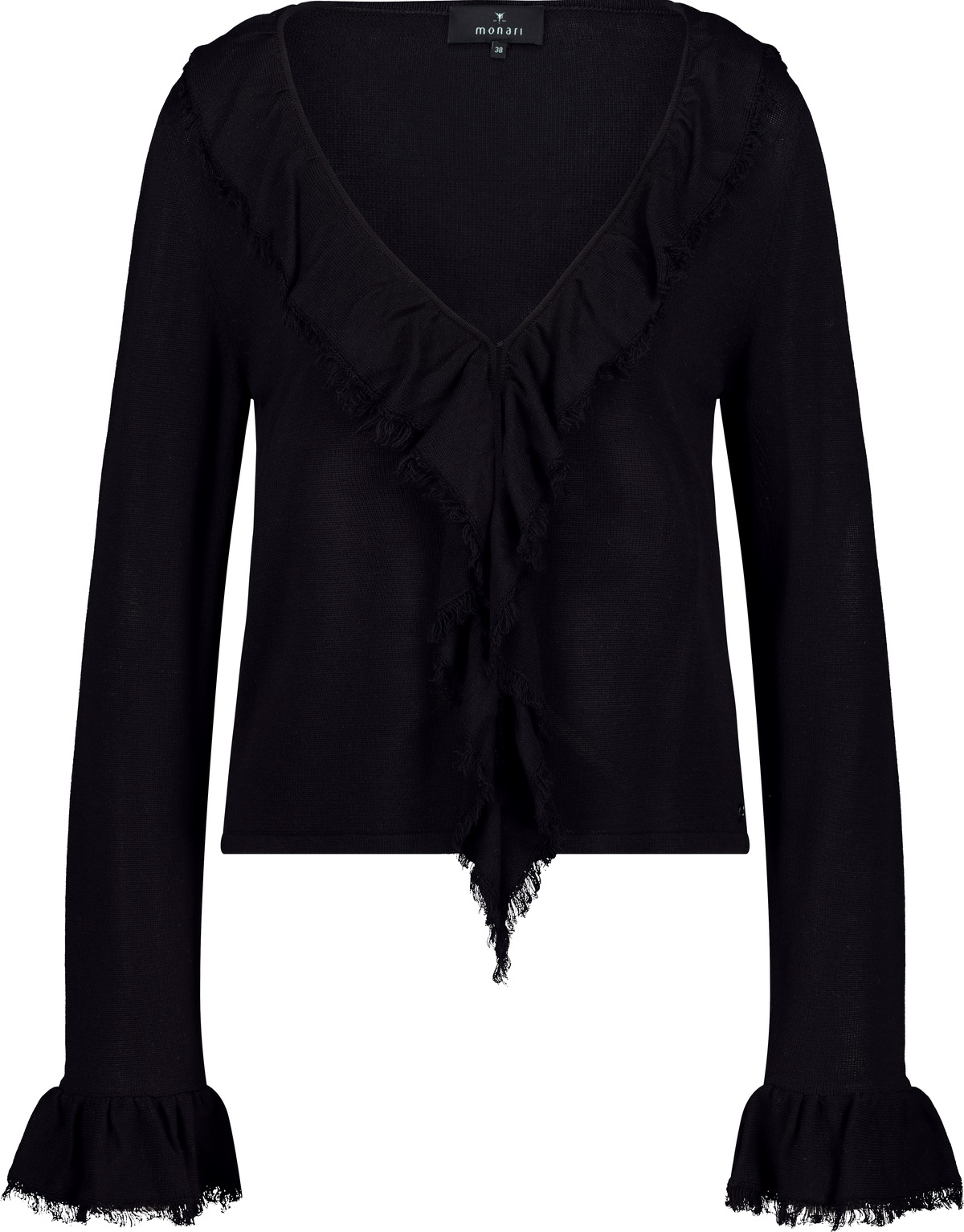 Tento štýlový kardigán zo splývavej viskózy očarí rozstrapkanými volánmi, výstrihom do V a elegantným zapínaním na háčik.