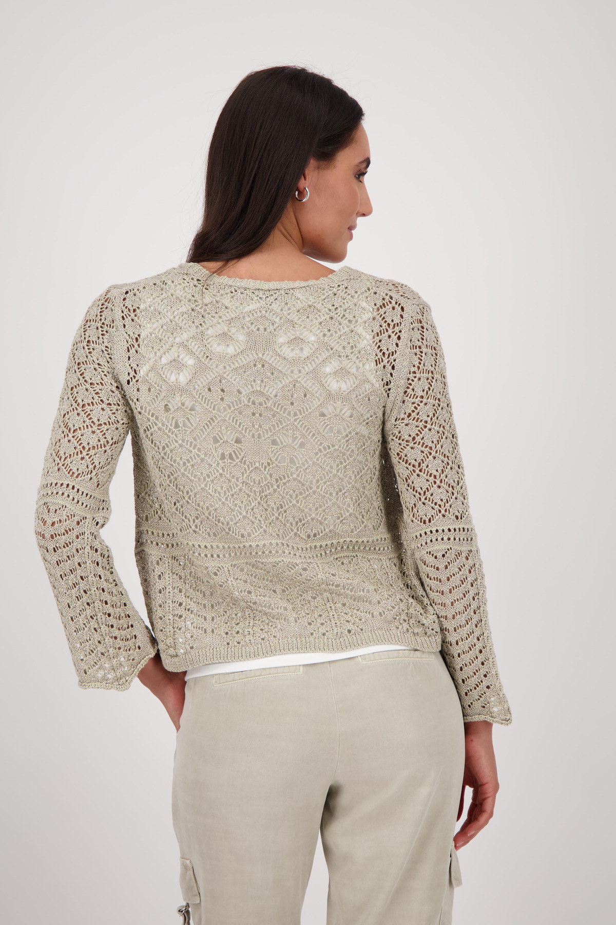 Kardigán s prelamovaným vzorom zaujme výstrihom do V a elegantnou gombíkovou légou so stuhou. Návleky mu dodávajú moderný nádych.