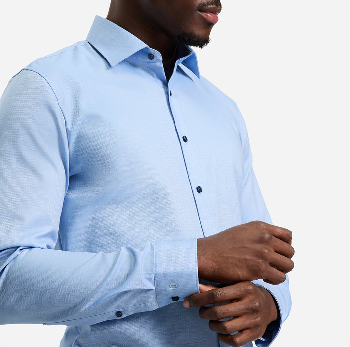 Biznis klasika pre super štíhlych mužov – OLYMP No. Six vyrobený z jemnej textúrovanej látky v modrej farbe. Vysokokvalitný Comfort Stretch sa vyznačuje elegantným leskom a kombinuje vynikajúce pohodlie s každodennou starostlivosťou a jednoduchým žehlením. V silne priliehavom super slim strihu s módnym golierom New York Kent.