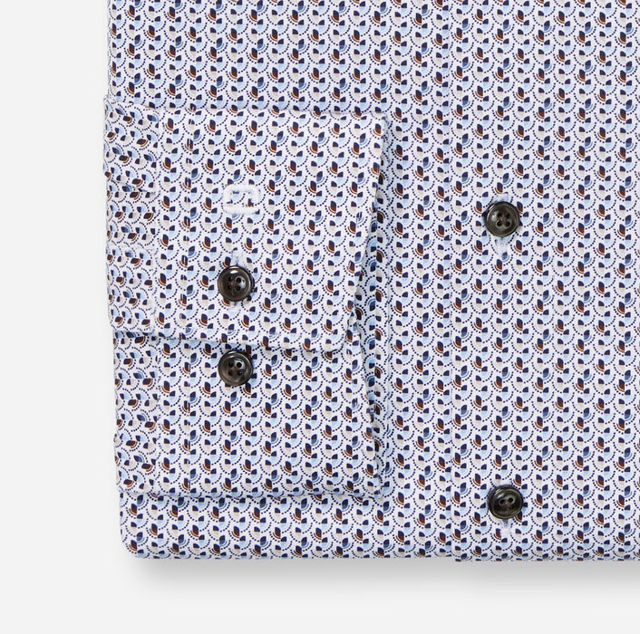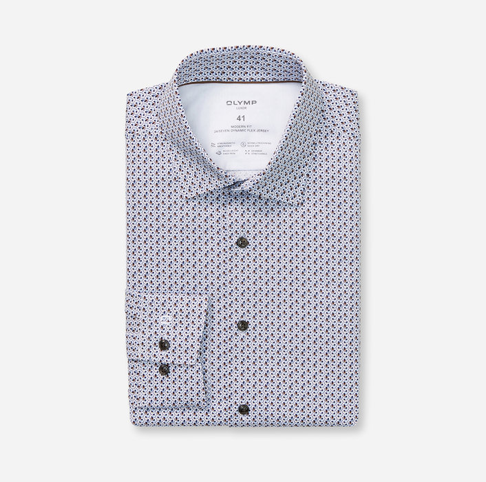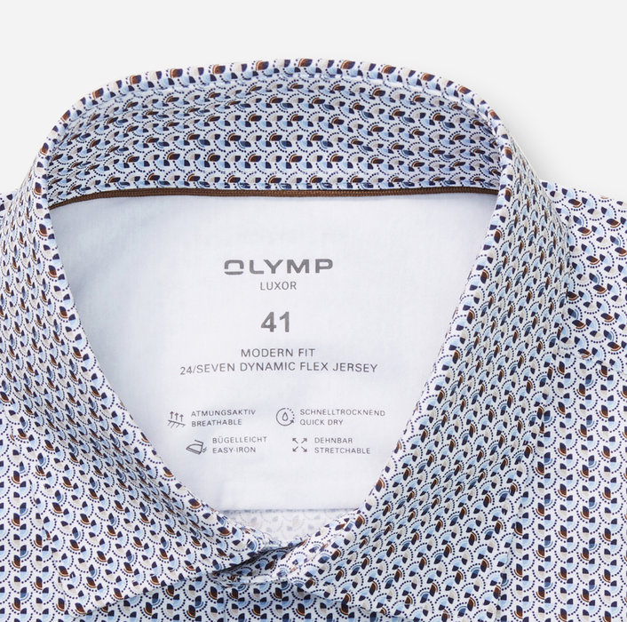 Elegantná potlač v ladených kľúčových farbách na bielom, atraktívny strih. Takto sa prezentuje táto inovatívna košeľa OLYMP Luxor 24/Seven z džerseja Dynamic Flex. Mäkká tkanina z bavlny a elastanu podčiarkuje športovú eleganciu s individuálnym nádychom. Harmonicky doplnená elegantným golierom New Kent. Priedušná, rýchloschnúca, ľahko sa žehlí.