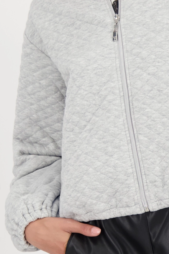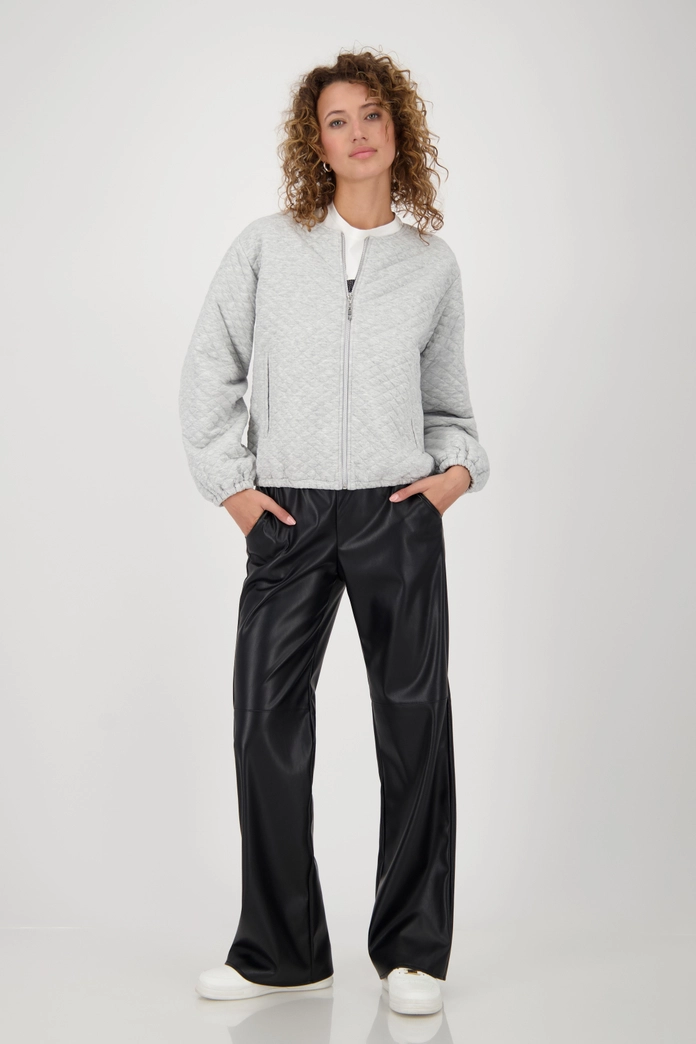 Moderná prešívaná bunda z padavej viskózy s elastickým materiálom, okrúhlym výstrihom a praktickými vreckami pre štýlový vzhľad.