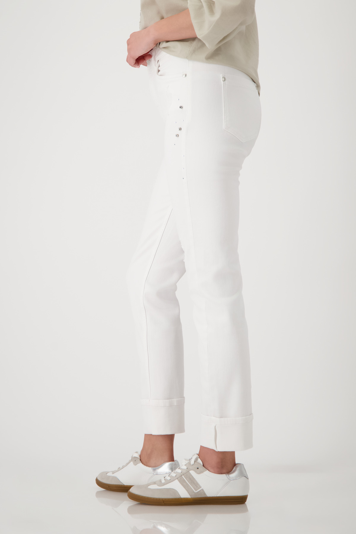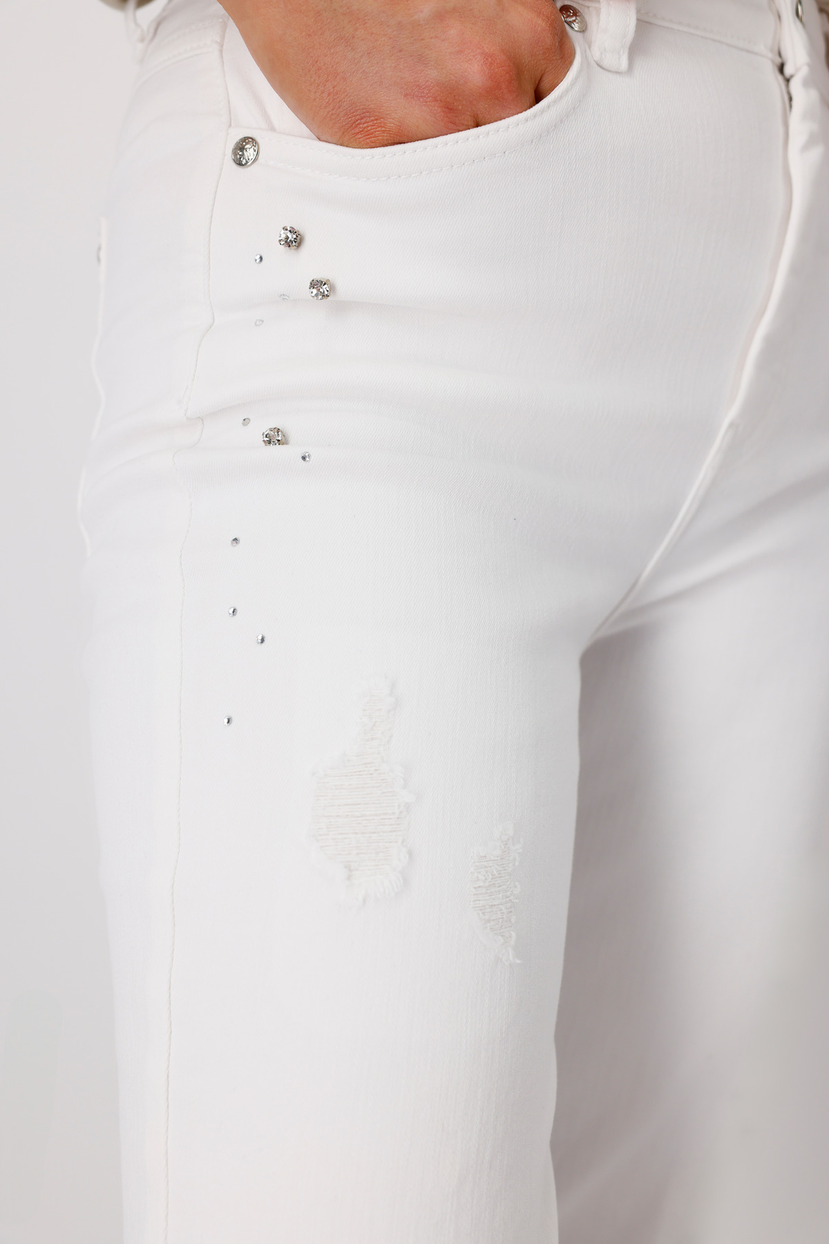 sú zdobené kamienkami rôznych veľkostí. Zničený vzhľad a manžety vytvárajú ležérny štýl.