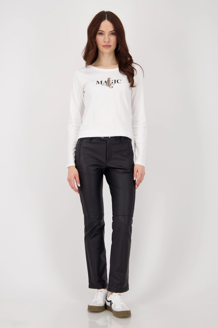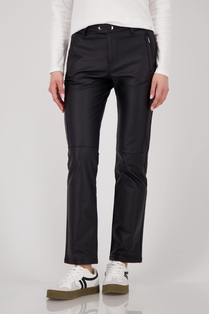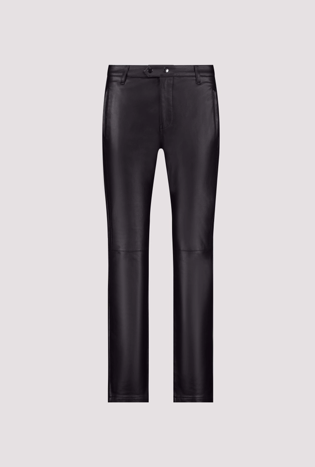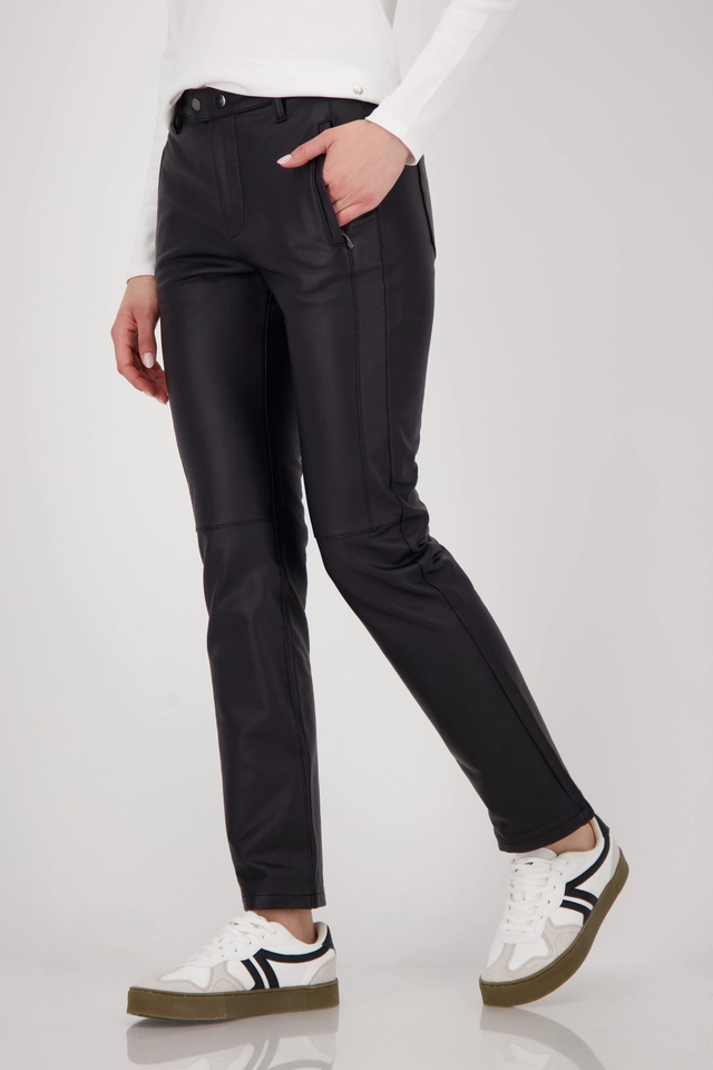 Módne kožené nohavice rovného strihu vyrobené z vysoko kvalitnej bavlnenej zmesi s elastickým materiálom, praktické bočné vrecká so zipsom a zapínaním na patentný gombík pre moderný strih.