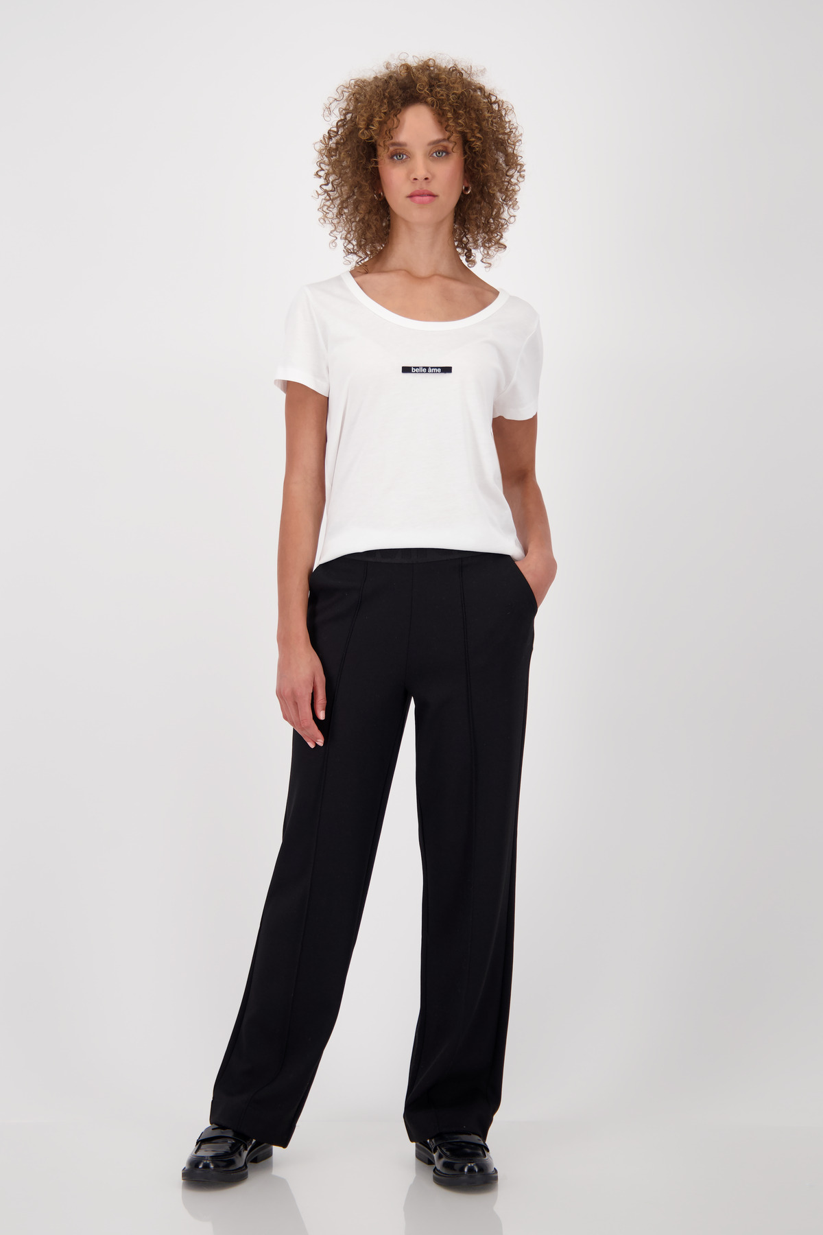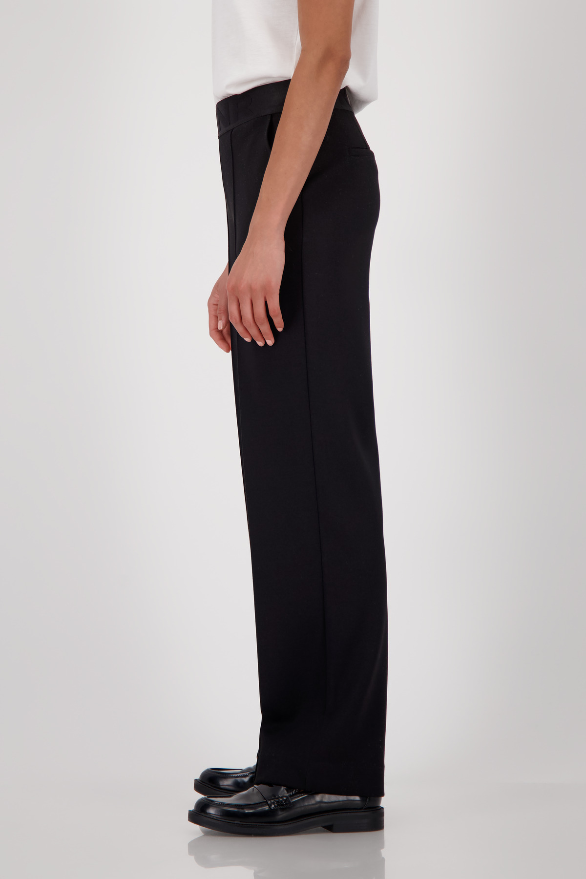 Rovný strih je umocnený jemným záhybom, zatiaľ čo bočné vrecká a imitácia zadných vreciek dodávajú praktické a štýlové detaily.