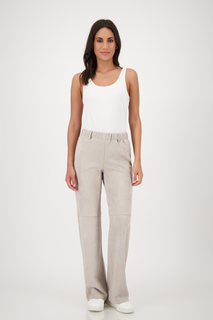 Pohodlné nohavice rovného strihu z elastického velúrového materiálu s elastickým pásom, bočnými vreckami a našitými zadnými vreckami pre štýlový a pohodlný vzhľad.
