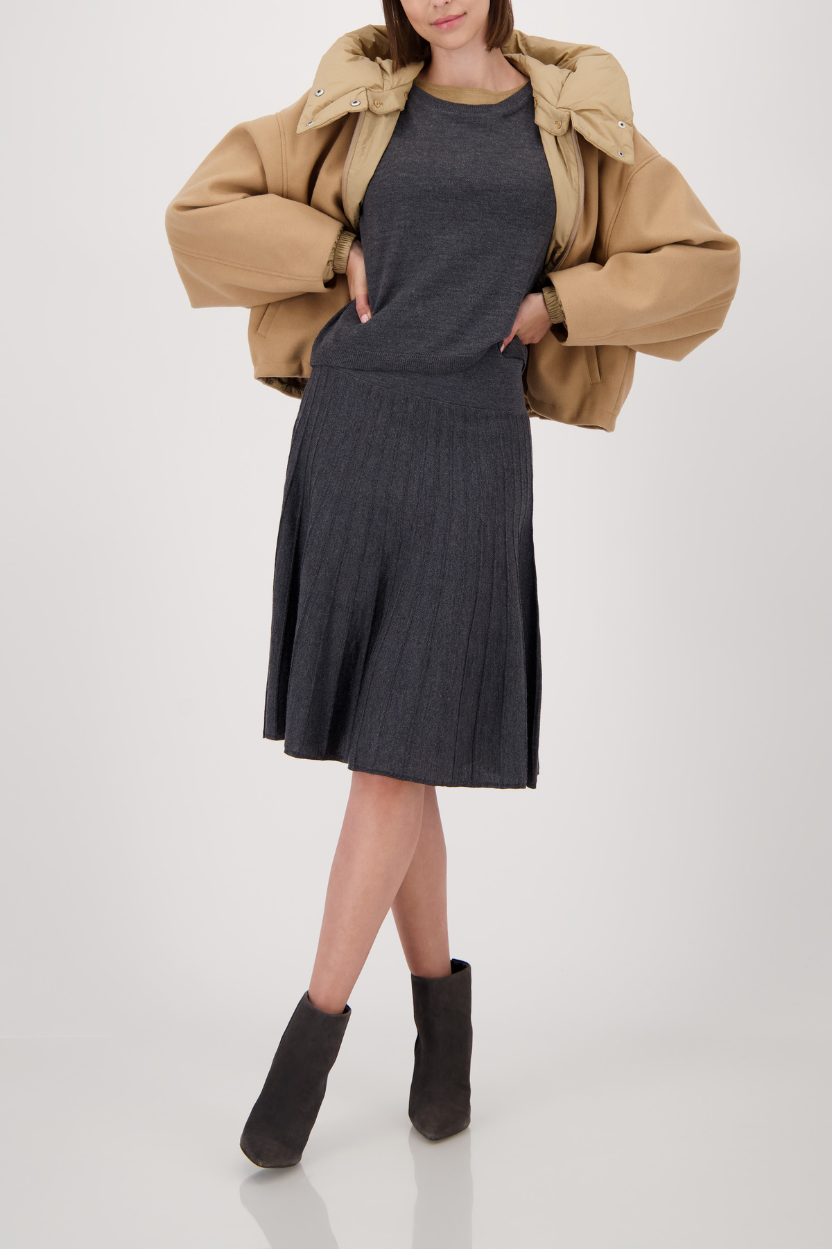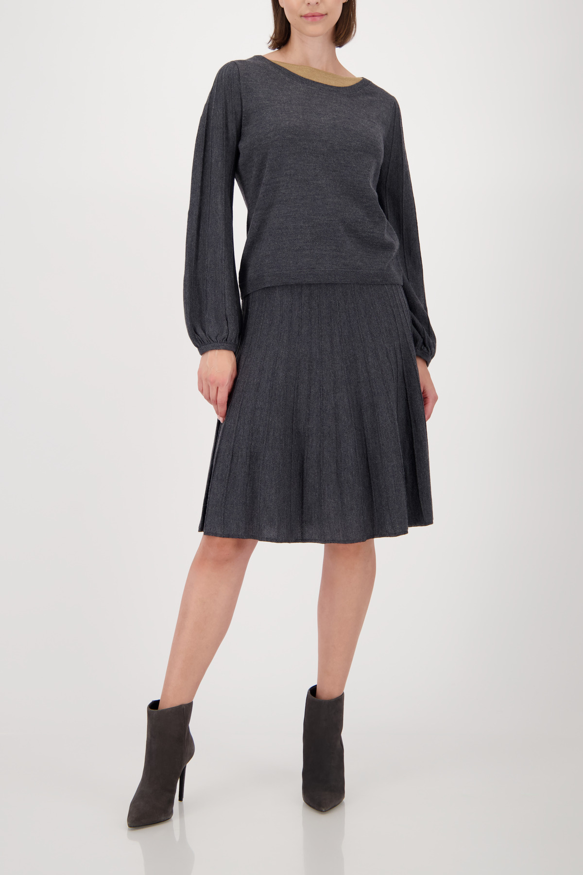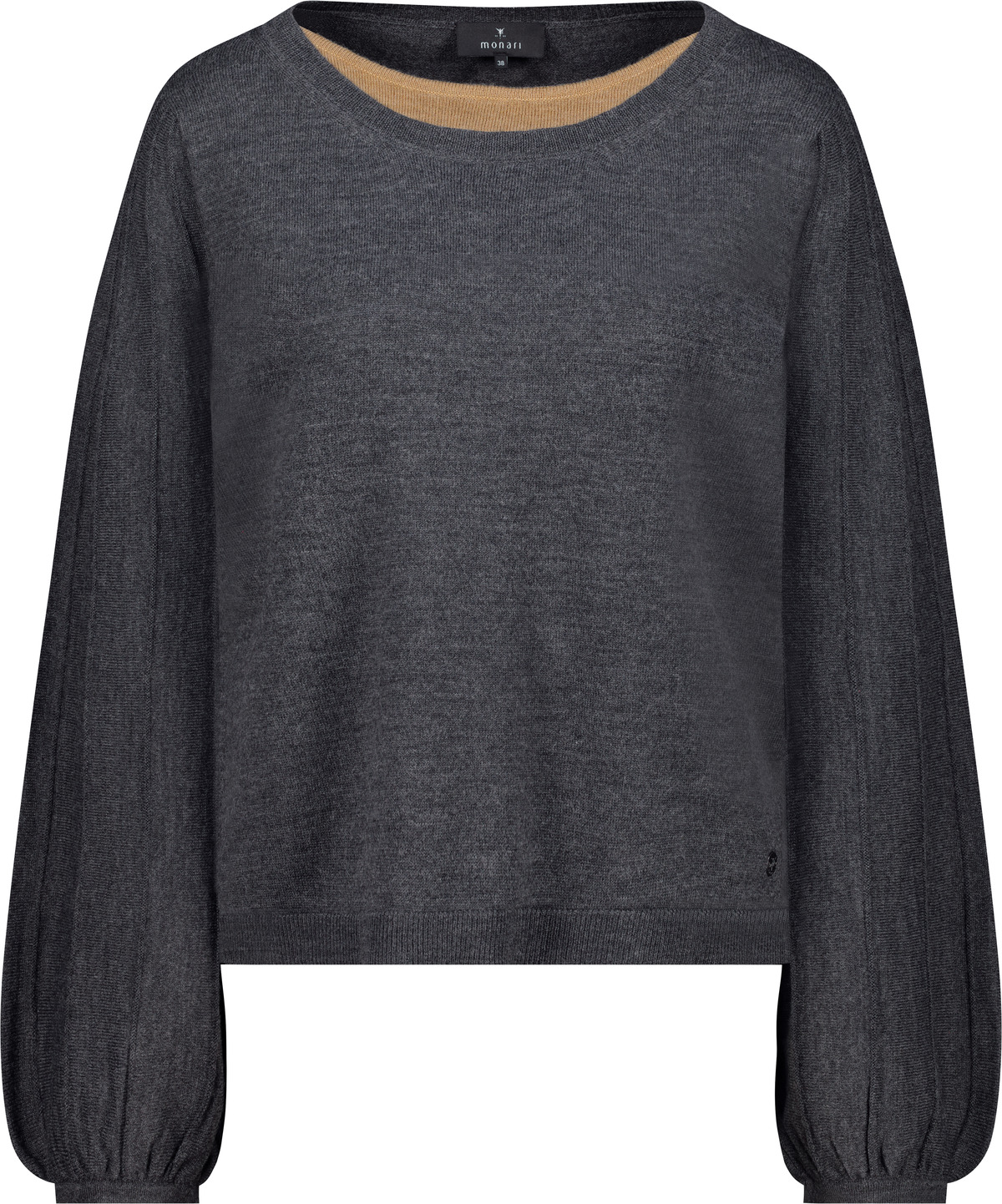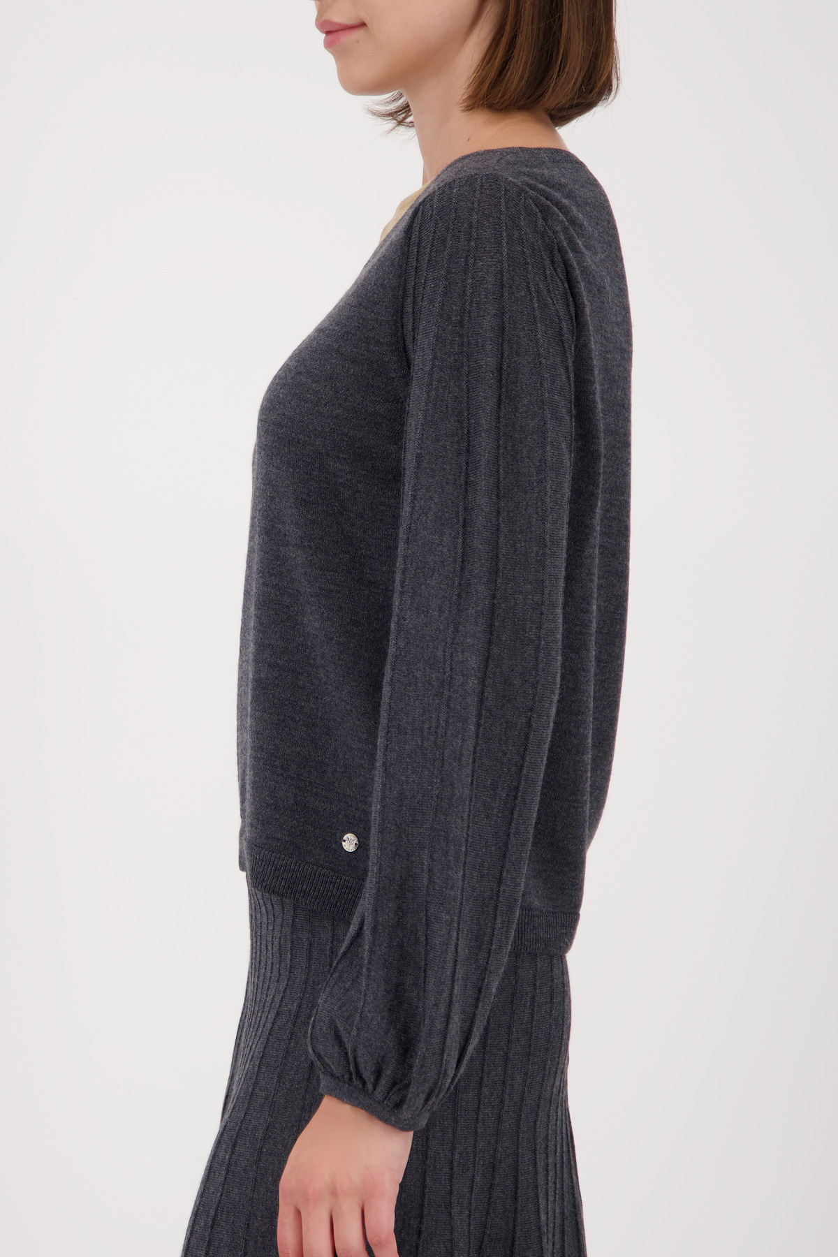 Všestranný pletený sveter vyrobený z vysoko kvalitnej vlnenej zmesi s módnymi balónovými rukávmi a lemovaním pre štýlový vzhľad.