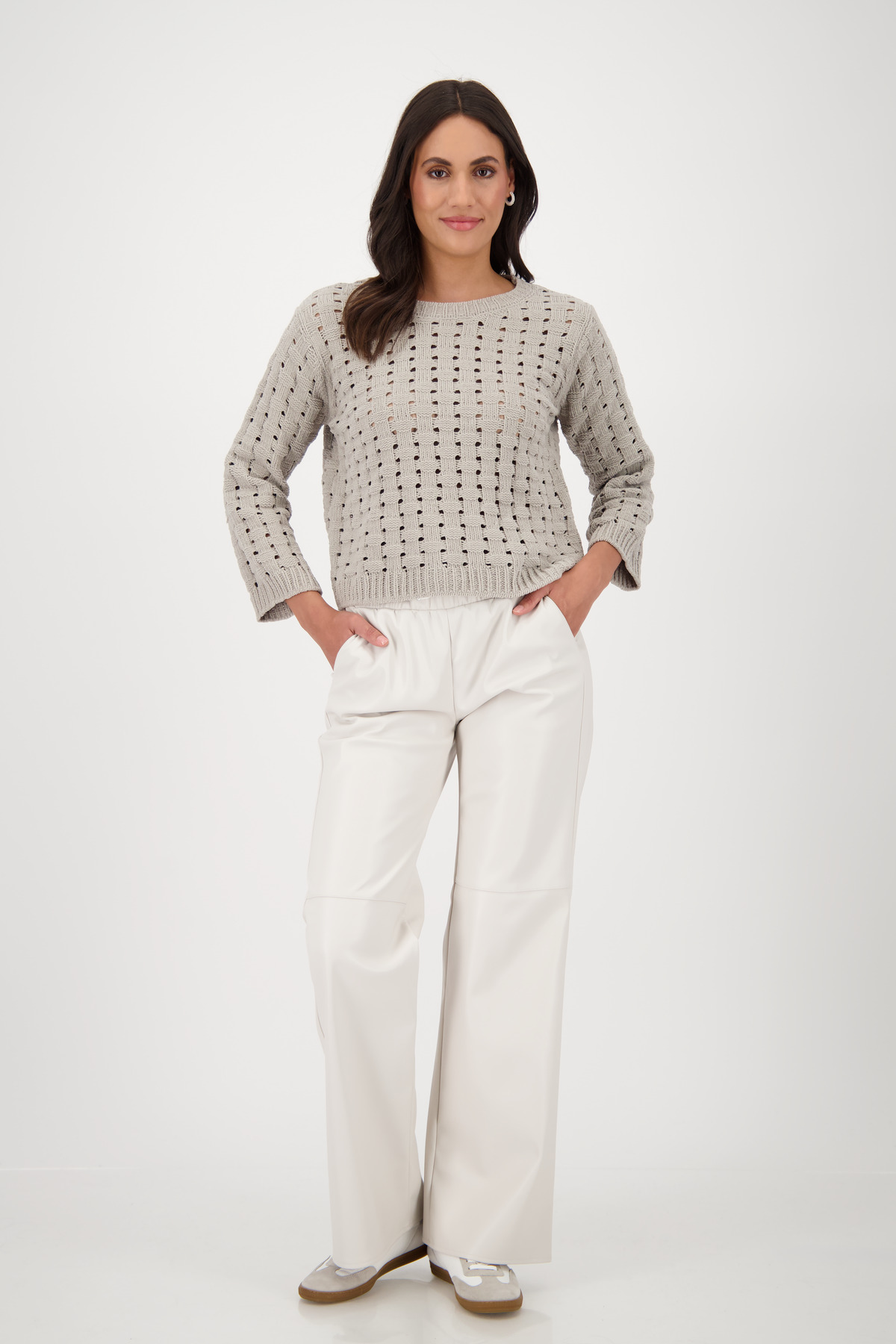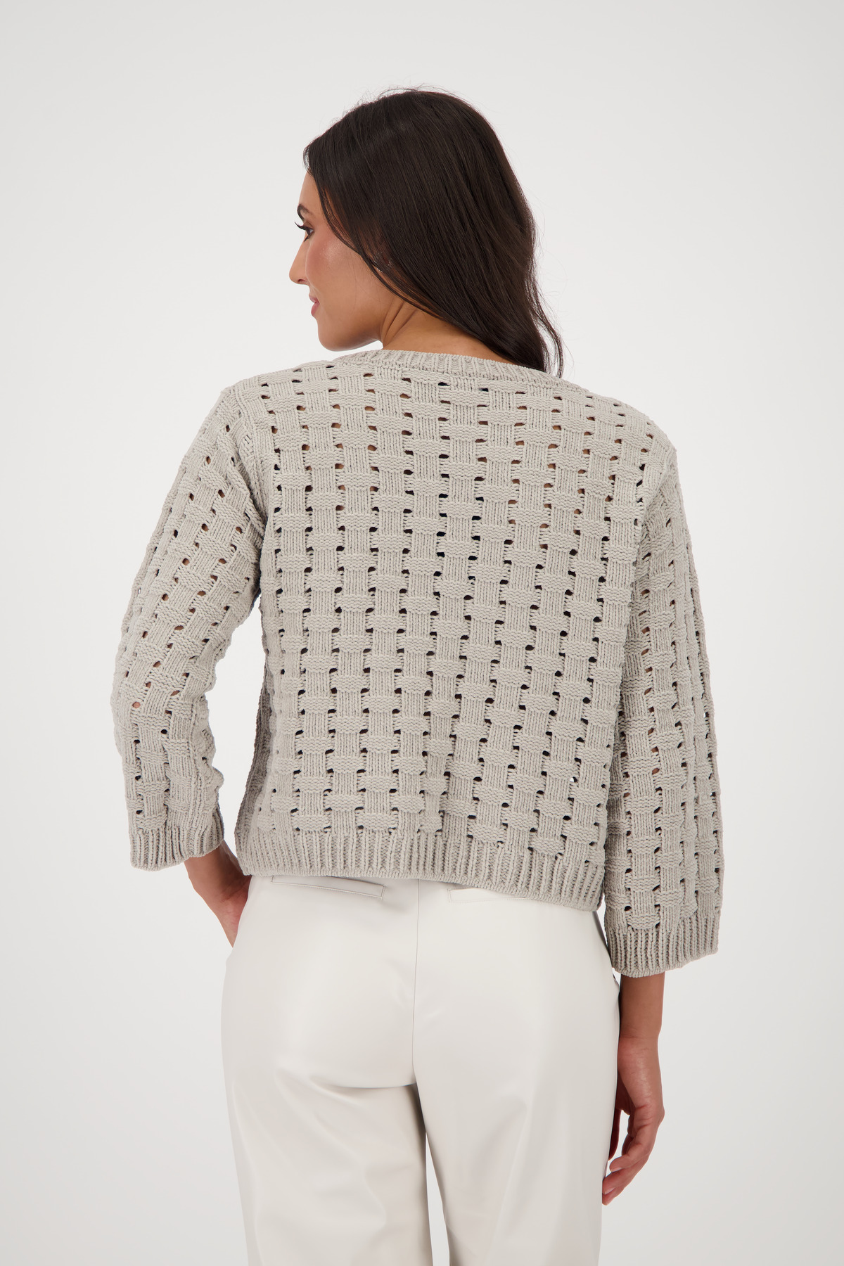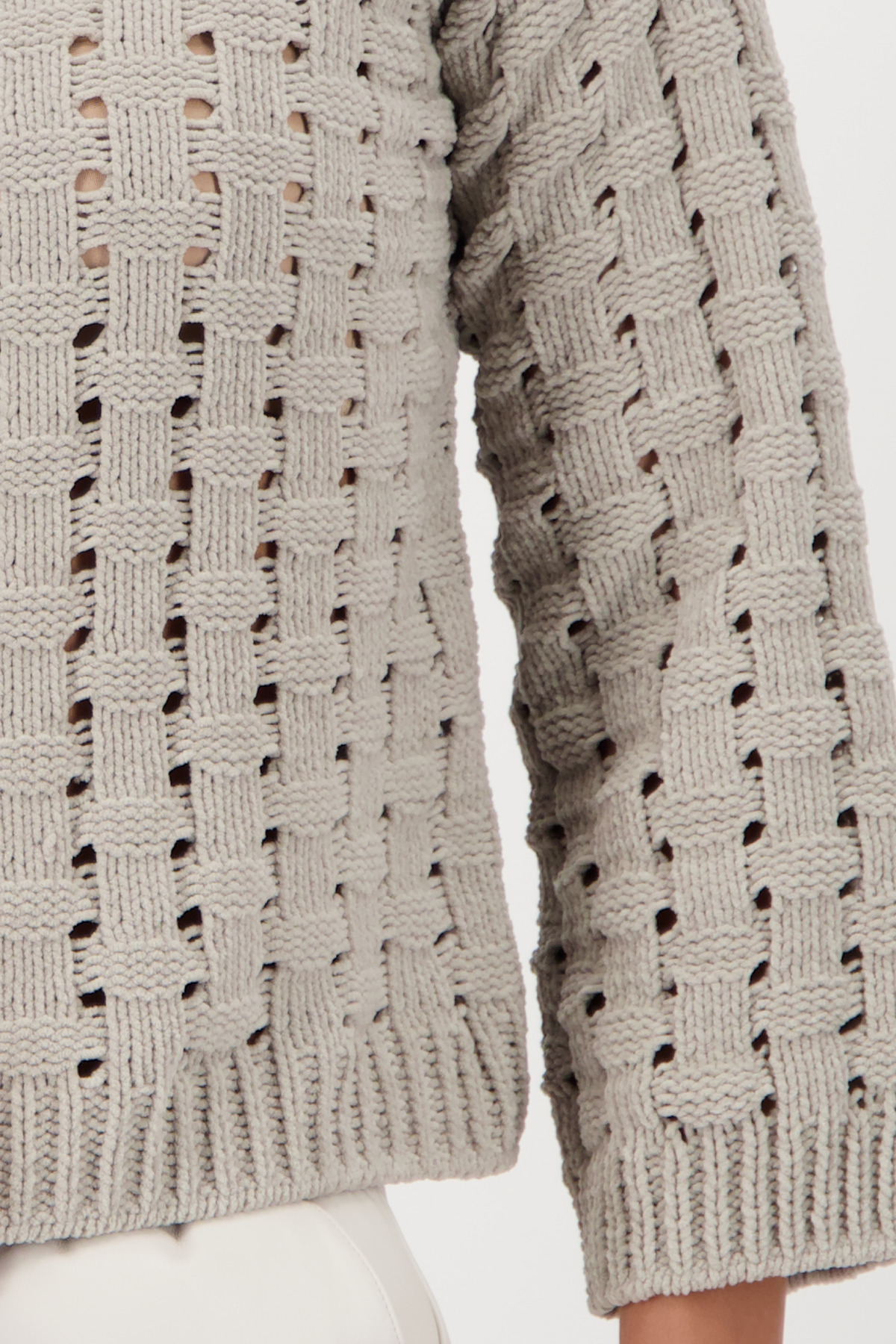 Sveter vyrobený z mäkkej ženilkovej priadze s mäkkým pocitom, voľným košíkovým vzorom a mierne zníženými ramenami.