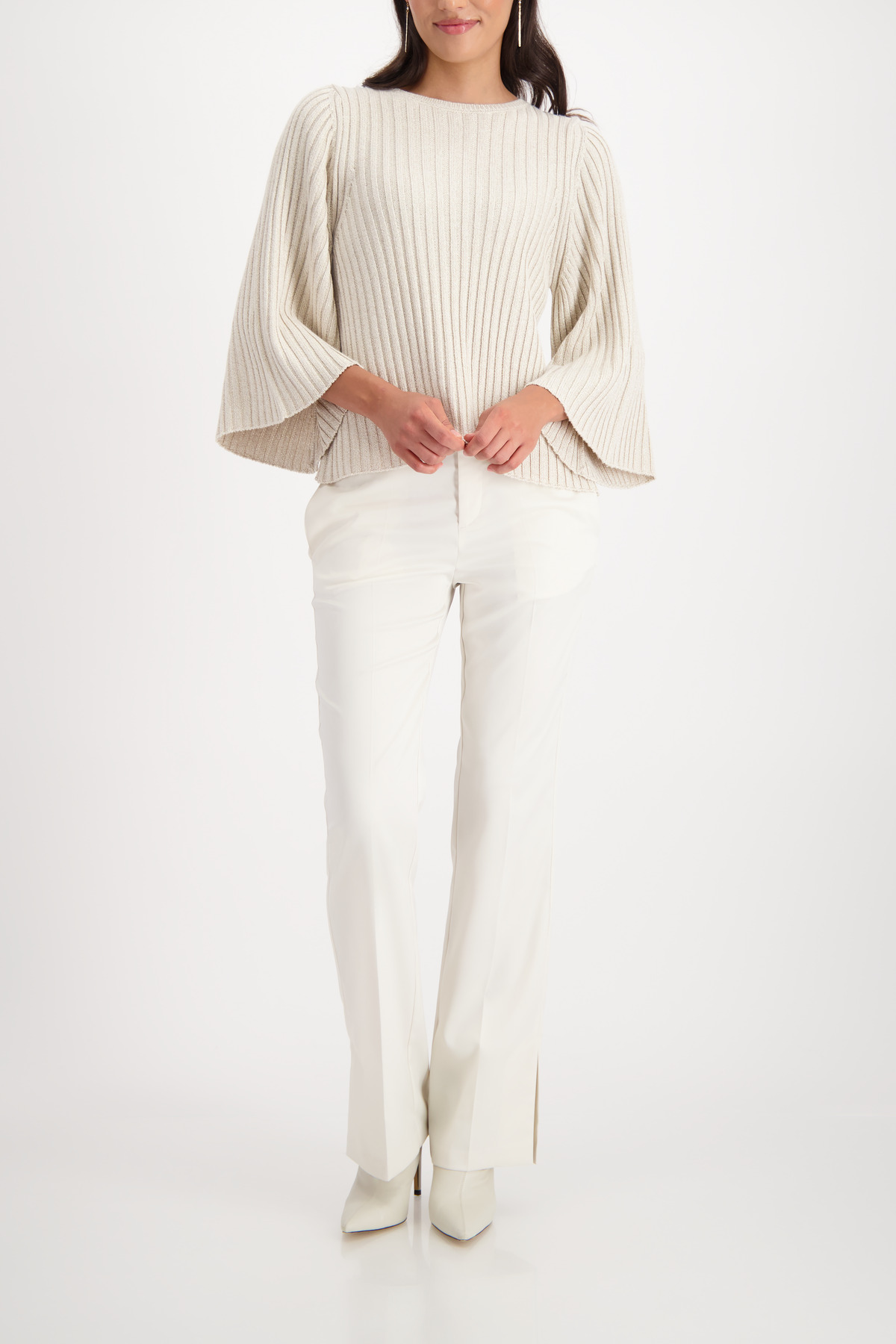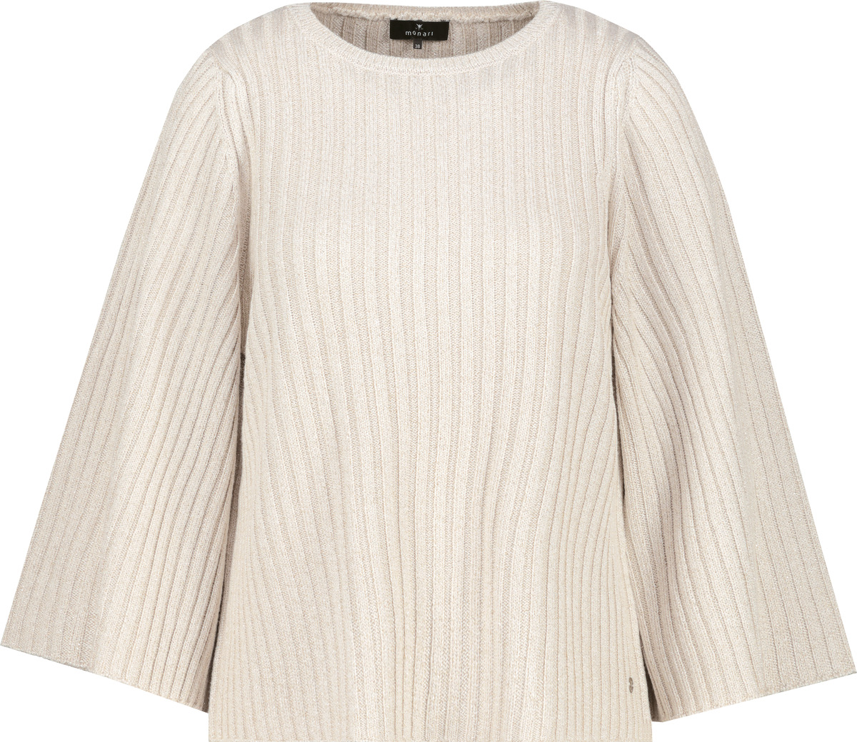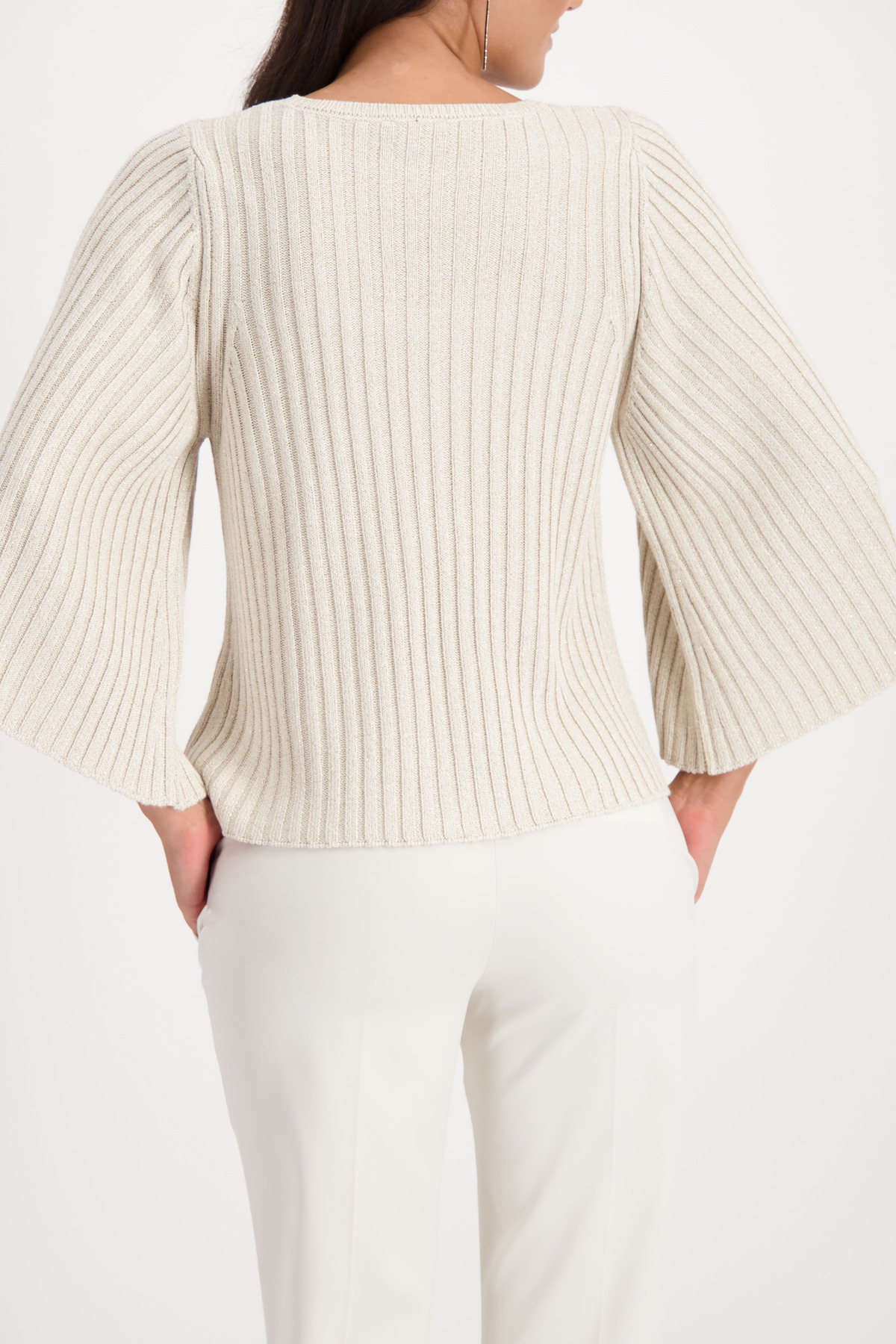 Elegantný pletený sveter vyrobený zo splývavej viskózy s lesklým lurexom, elegantnou rebrovanou textúrou a ¾ rozšírenými rukávmi pre moderný vzhľad.