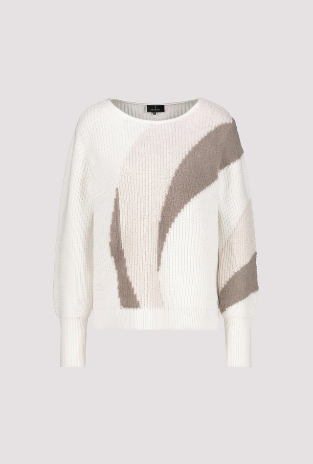 Intarzívny vzor a znížené ramená vytvárajú moderný a útulný vzhľad.