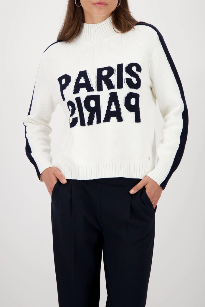 Elegantný sveter s dlhým rukávom vyrobený z vysoko kvalitnej bavlnenej zmesi so štýlovým nápisom „Paris“, zapínaním na gombíky, stojačikom a módnymi pruhmi.