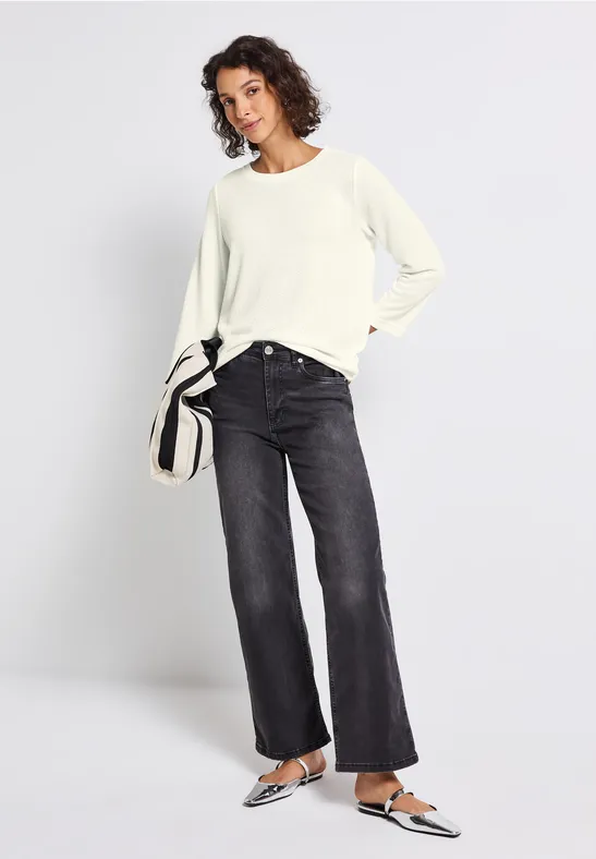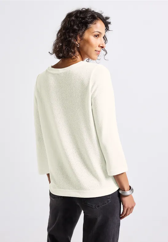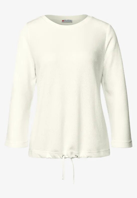 Táto košeľa od Street One zaujme svojím pleteným vzhľadom a mäkkým pocitom na dotyk. Rebrované detaily na okrúhlom výstrihu a sťahovací lem so šnúrkou dodávajú módne akcenty. 3/4 rukávy s manžetami dotvárajú ležérny dizajn.