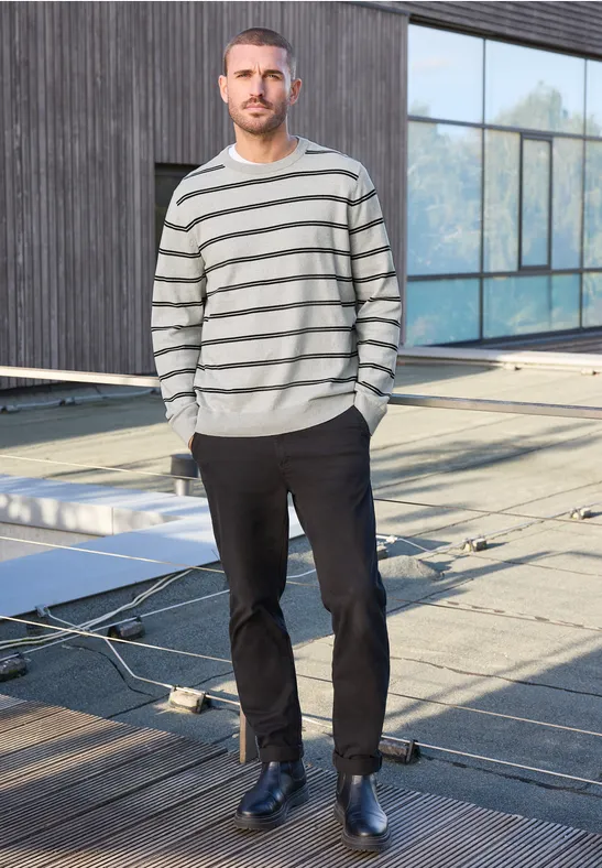 Tento pruhovaný sveter od Street One MEN dodá vášmu každodennému šatníku svieži nádych. Výrazný pruhovaný vzor je kombinovaný s čistou bavlnou pre pohodlný pocit. Okrúhly výstrih a rebrované manžety dotvárajú ležérny vzhľad.