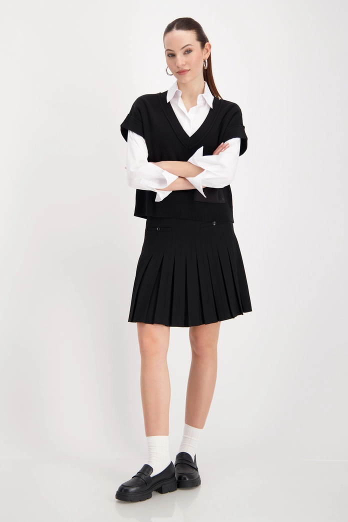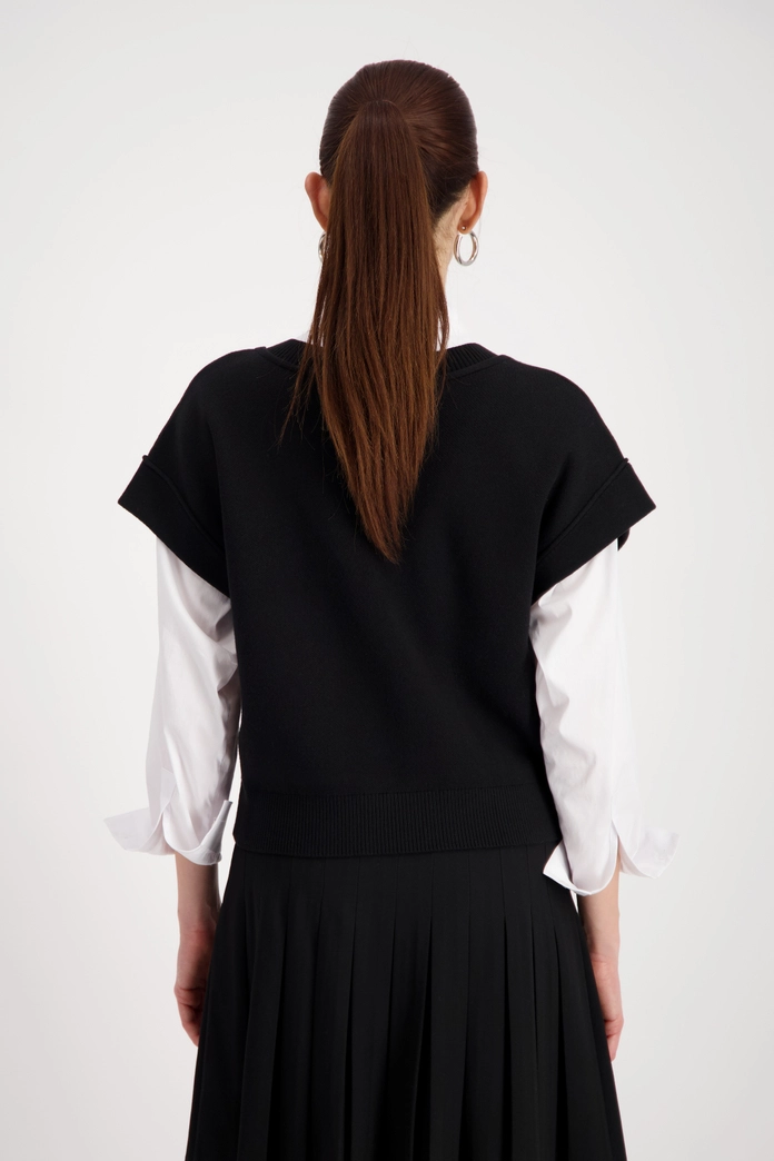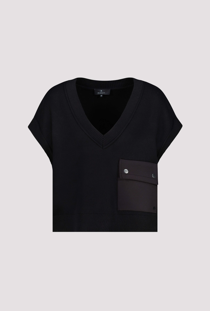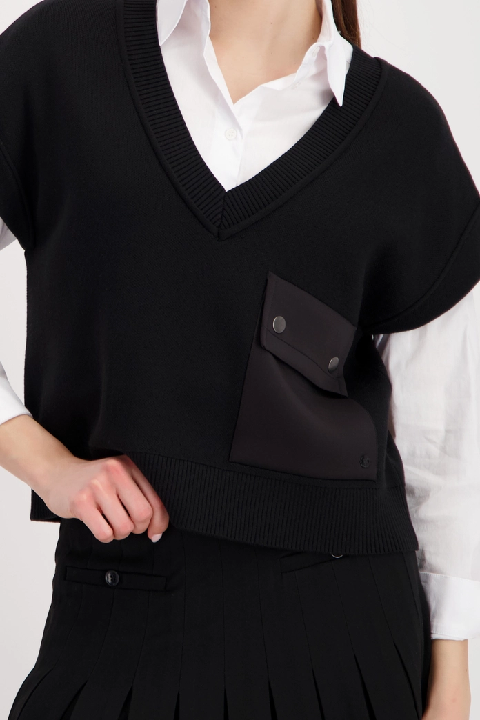 Elegantný pletený pulóver z vysoko kvalitnej bavlnenej zmesi so zníženými ramenami, výstrihom do V a praktickým vreckom s klopou. Perfektný spoločník.