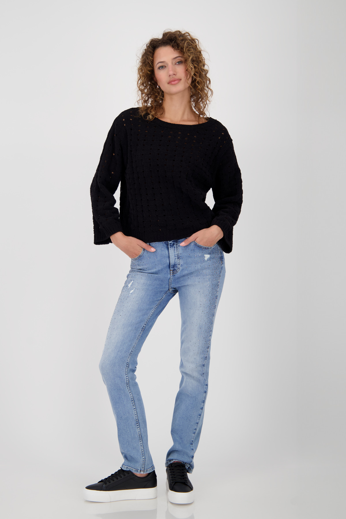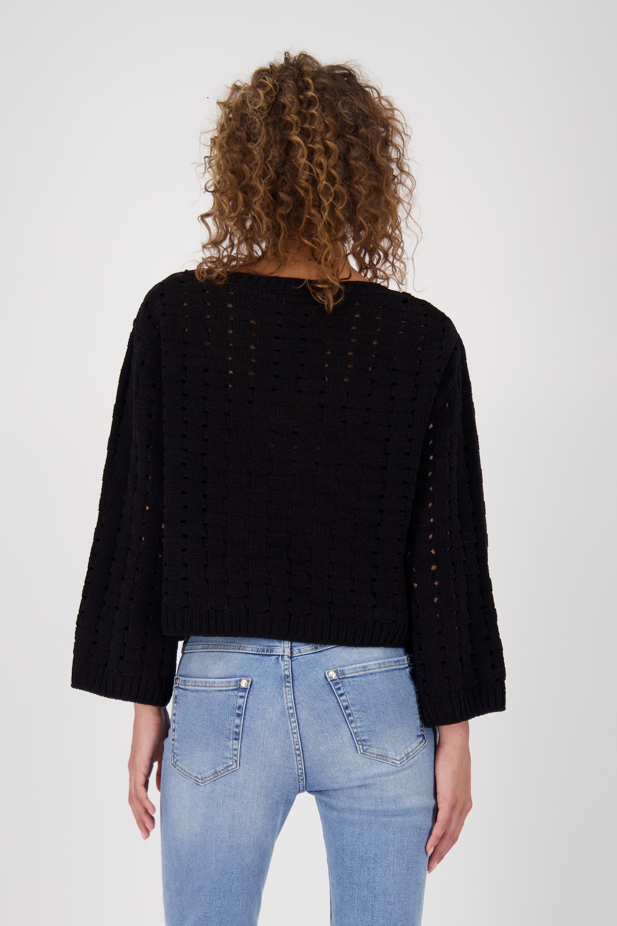 Sveter vyrobený z mäkkej ženilkovej priadze s mäkkým pocitom, voľným košíkovým vzorom a mierne zníženými ramenami.