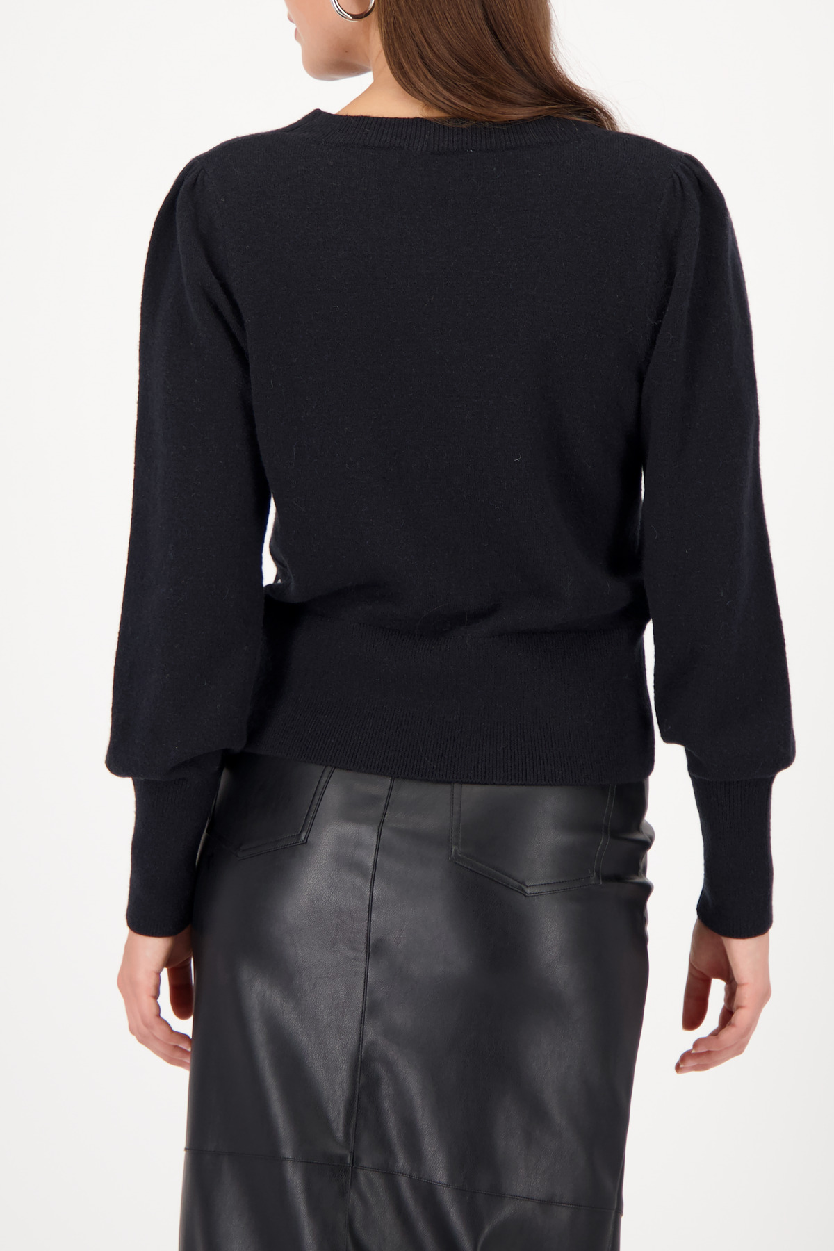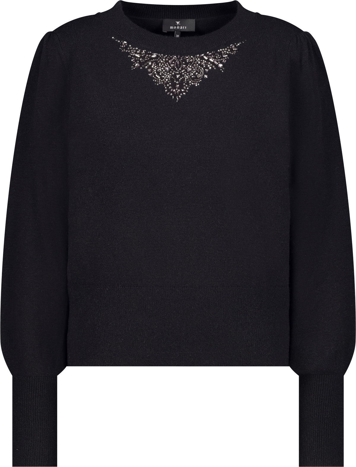 Mäkký sveter s detailmi šperkov a vypchávkami na ramenách pre štýlový a moderný vzhľad.