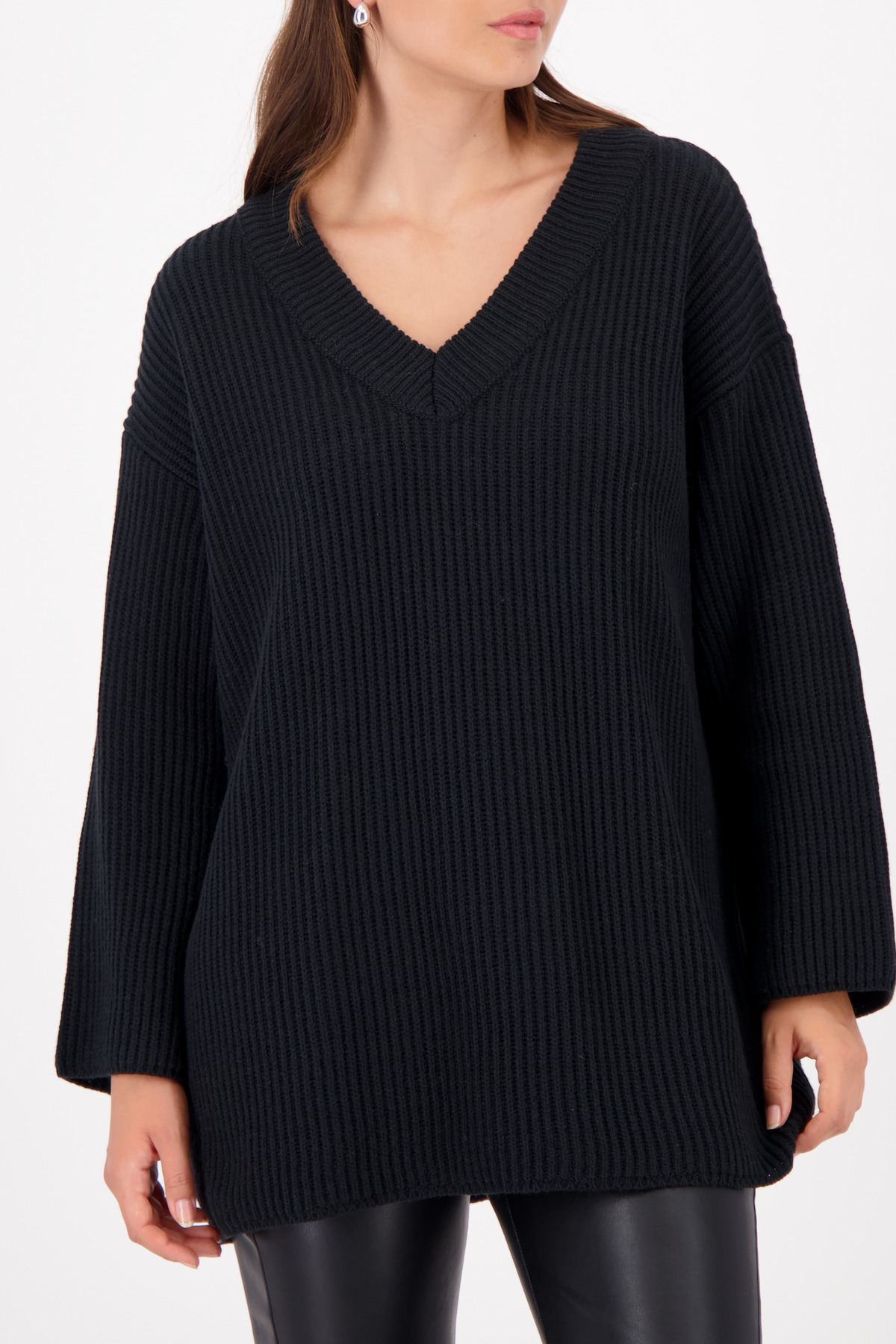 Dlhý pletený sveter vyrobený z vysoko kvalitnej vlnenej zmesi s výstrihom do V a perleťovým strapcovým vzorom – pre elegantný a moderný vzhľad.