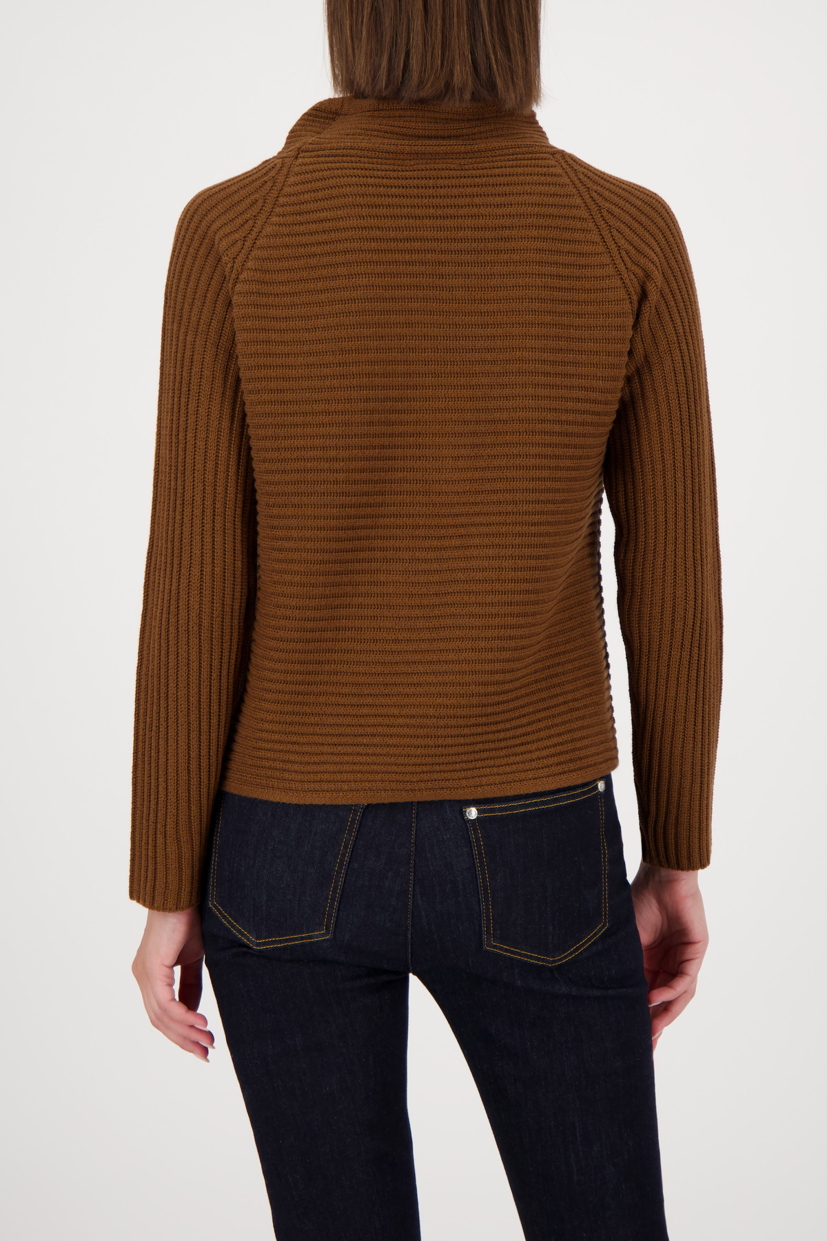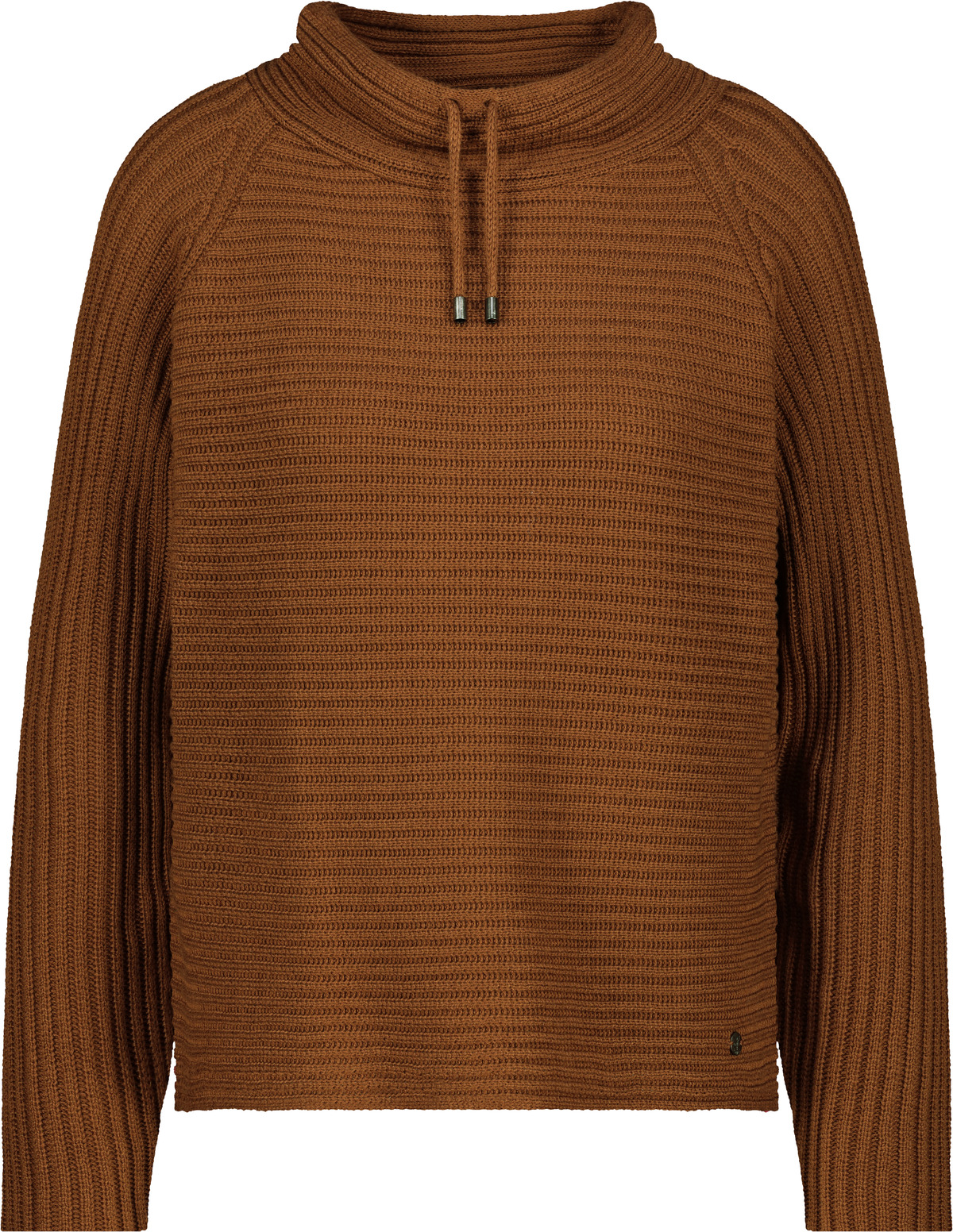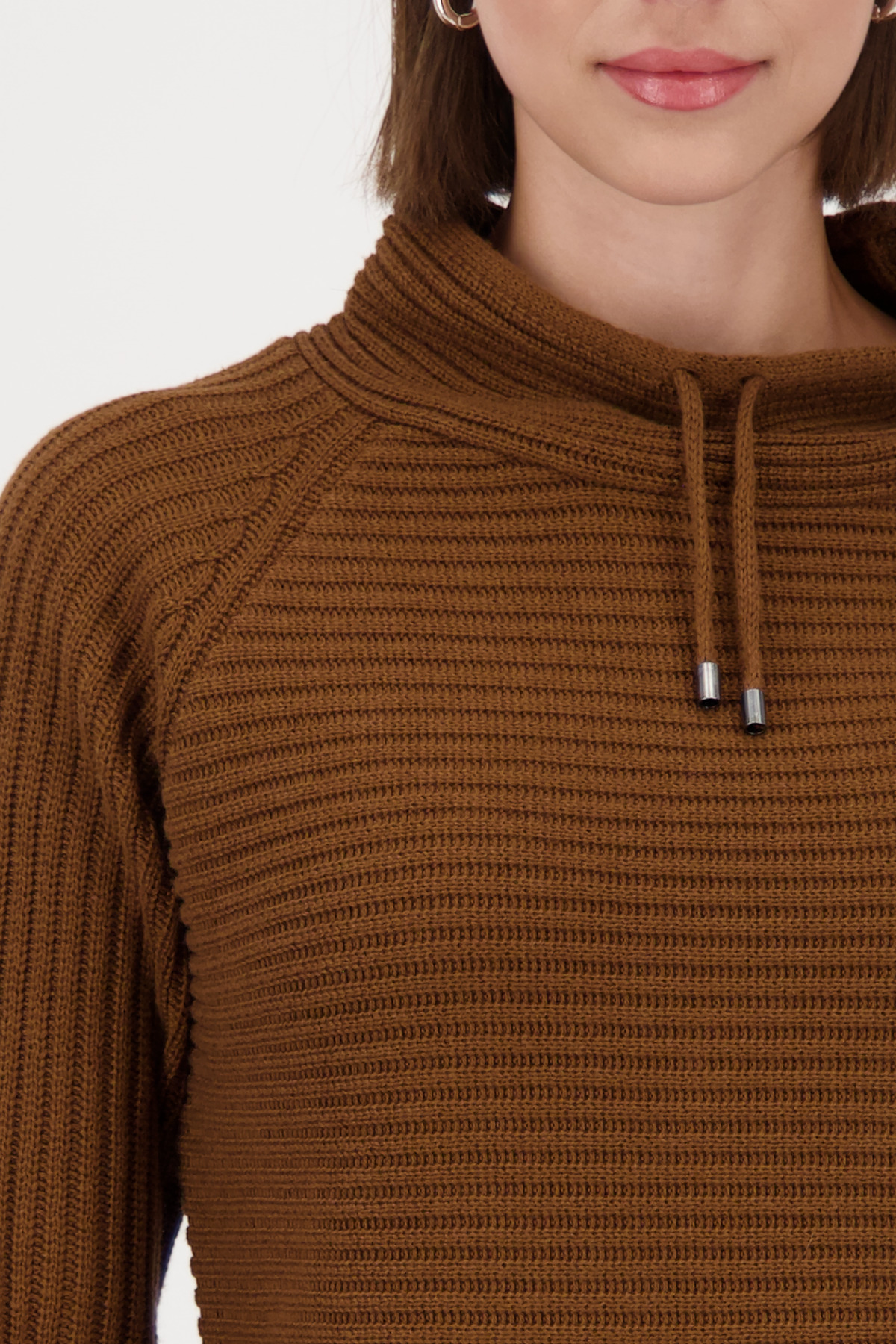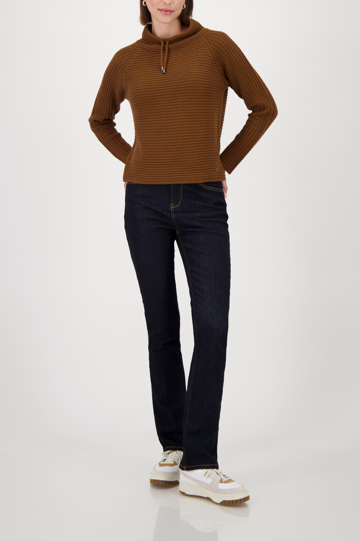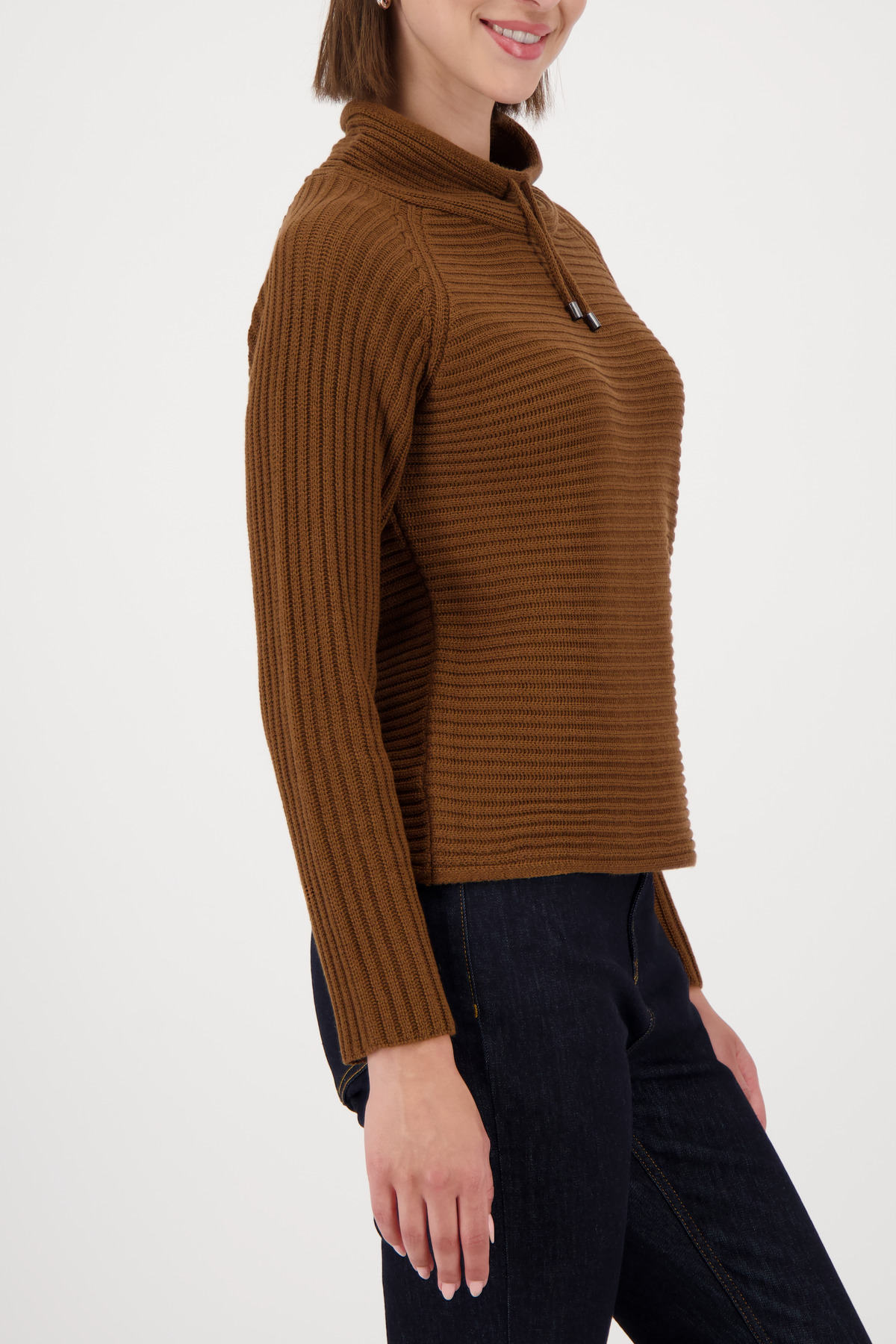 Sveter zaujme svojím nadčasovým dizajnom s rebrovanou textúrou a módnym stojačikom so sťahovacou šnúrkou.
