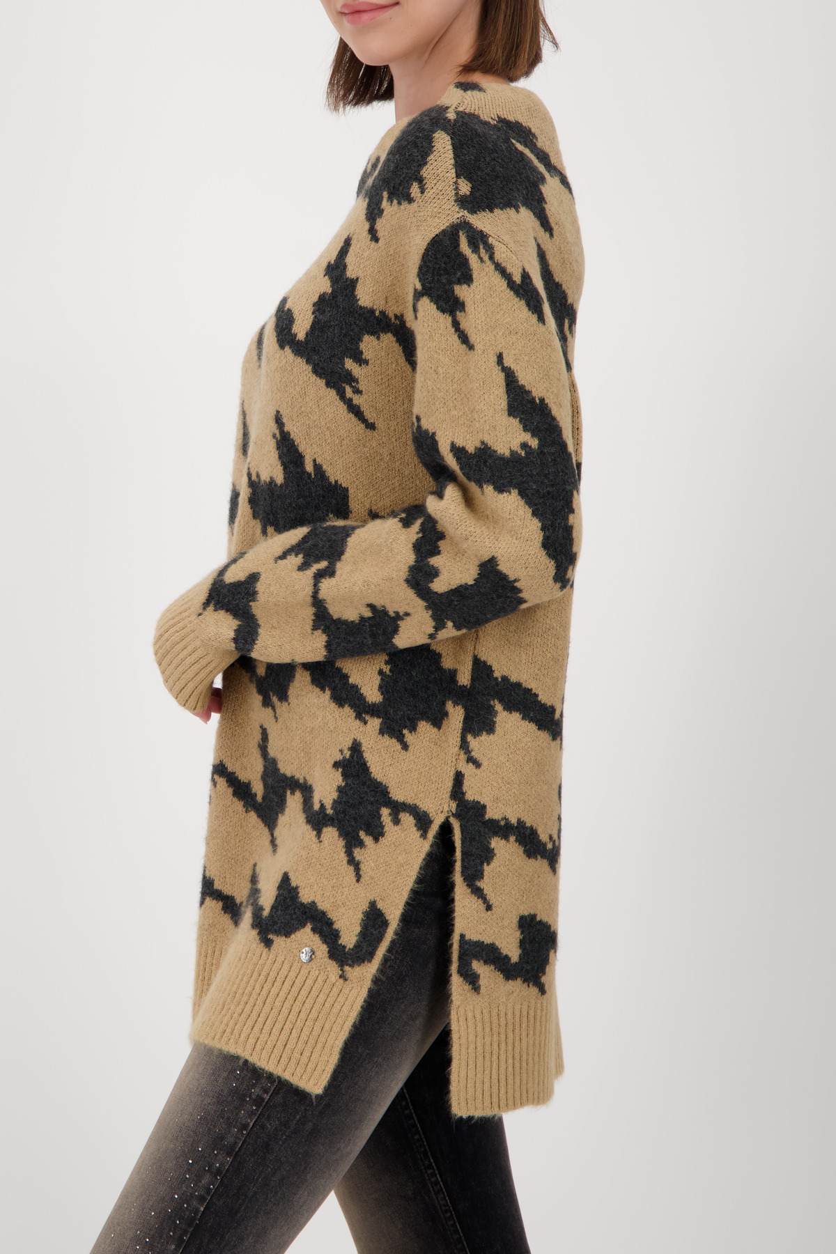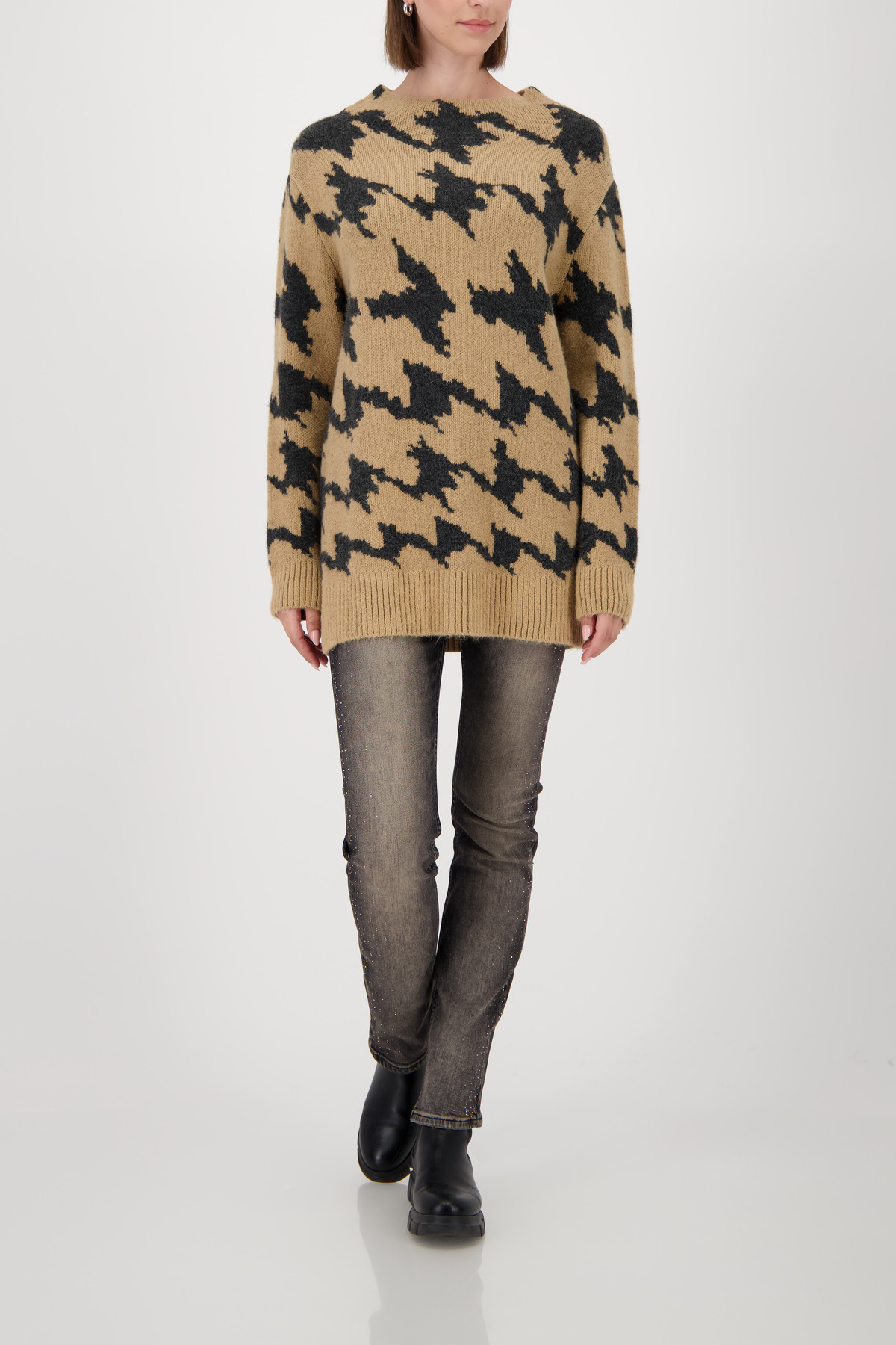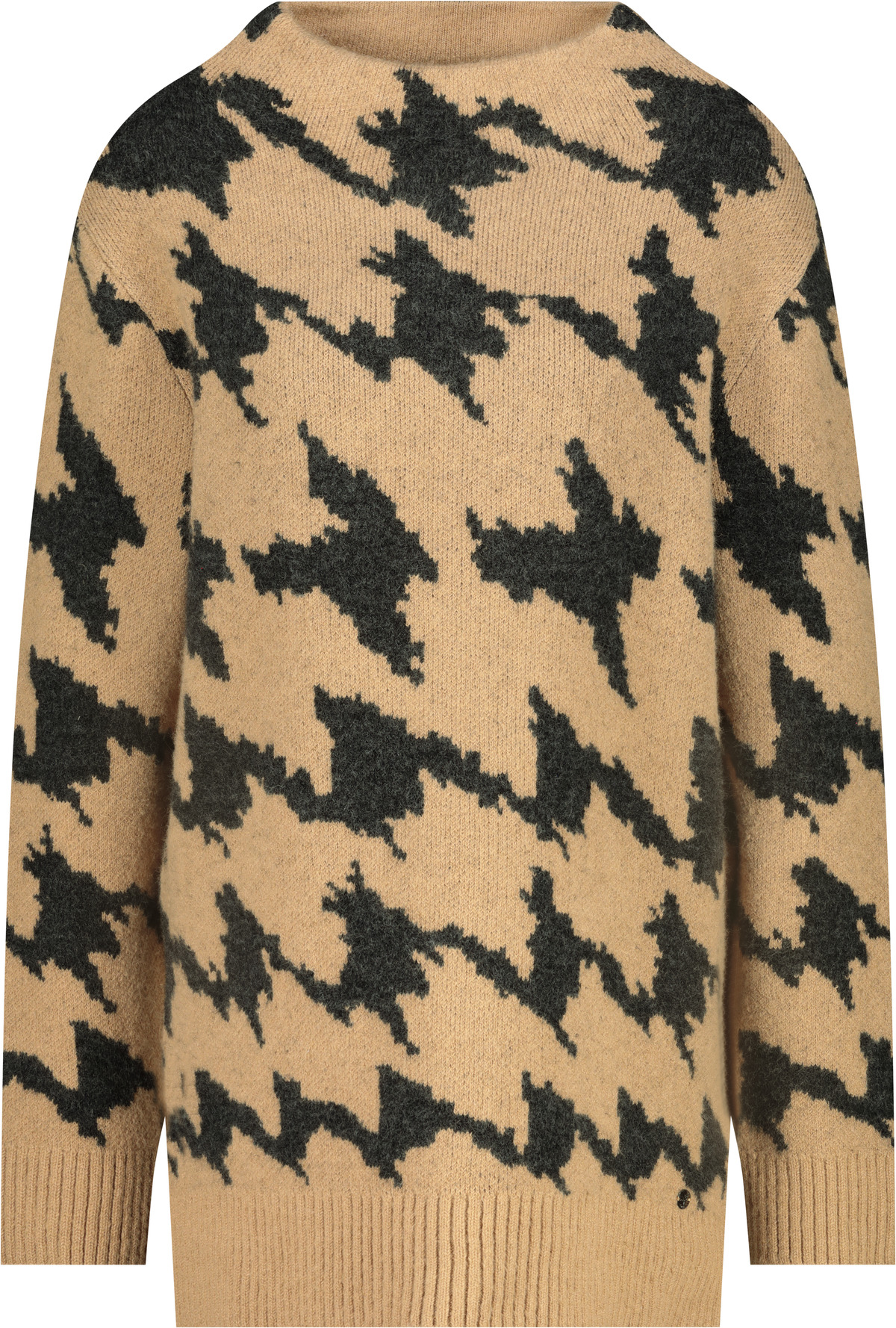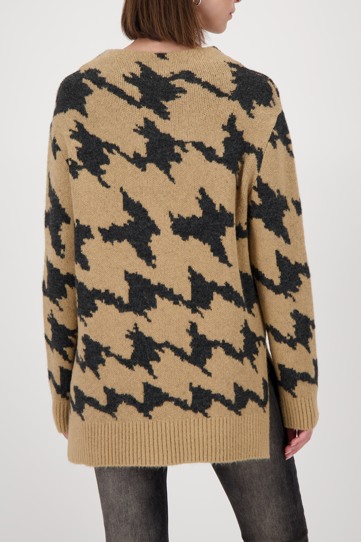 Tento štýlový pletený sveter vyrobený z vysoko kvalitnej vlnenej zmesi kombinuje mäkký pocit a splývavú viskózu v modernom vzore pepita.