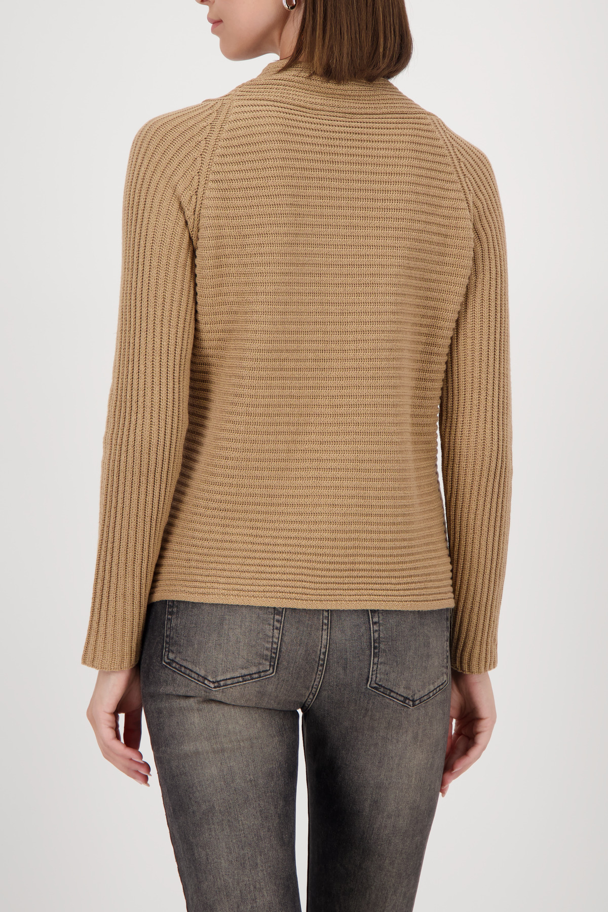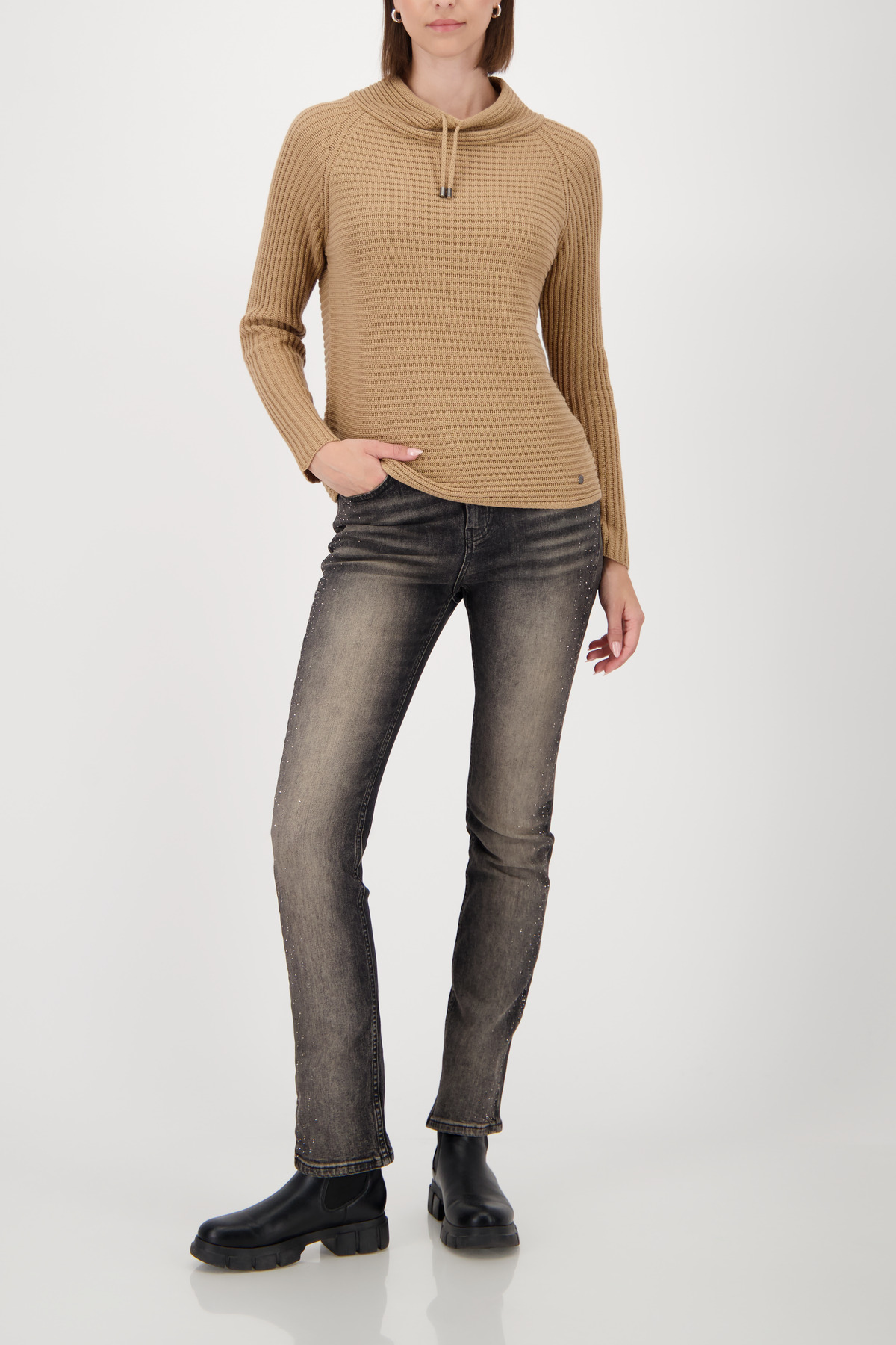 Sveter zaujme svojím nadčasovým dizajnom s rebrovanou textúrou a módnym stojačikom so sťahovacou šnúrkou.