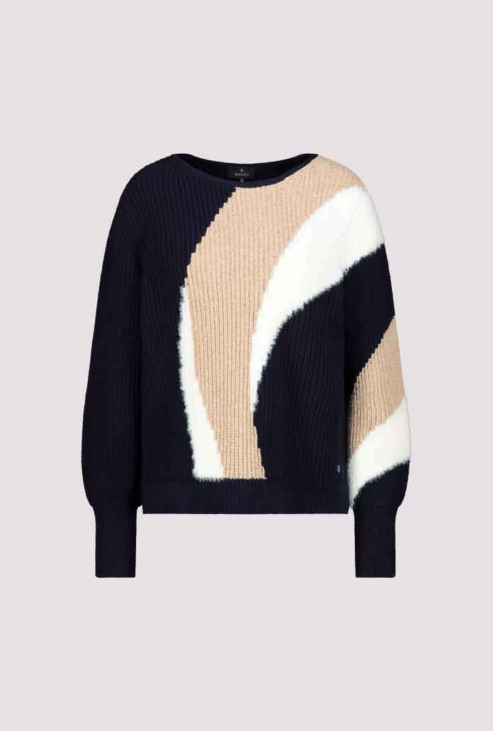 Intarzívny vzor a znížené ramená vytvárajú moderný a útulný vzhľad.