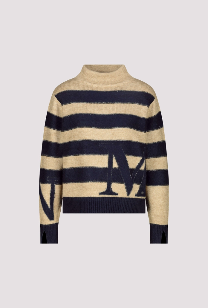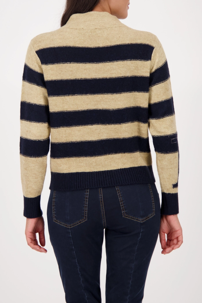 Elegantný sveter zo splývavej viskózy s pruhovaným vzorom, zdobený kamienkami, stojačikom a intarzívnym vzorom – to je nevyhnutnosť!