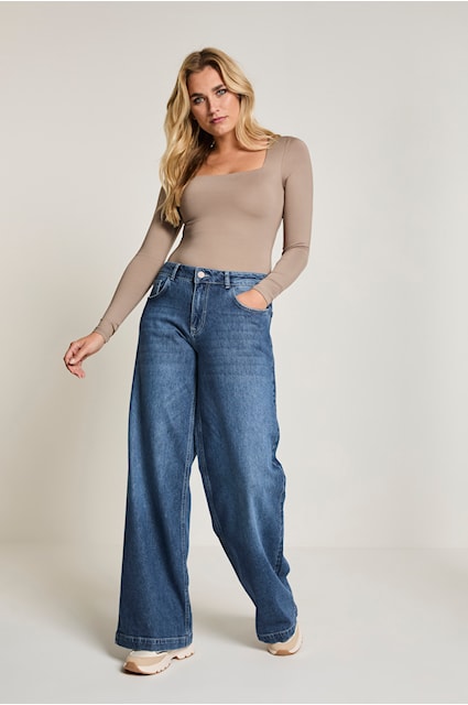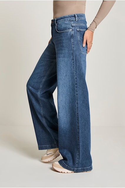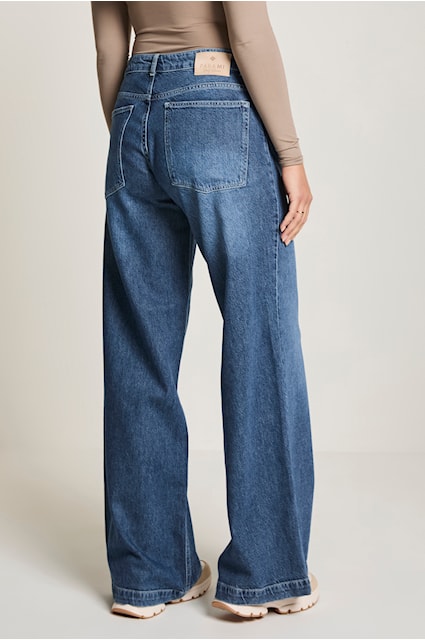 Modelka  Cloë z Para Mi má vysoký pás. Nohavice sú vypasované na bokoch a majú extra široké rozšírené nohavice .Tieto jednoduché dámske džínsy ponúkajú pohodlie a všestrannosť na každú príležitosť, ideálne pre módny a prístupný vzhľad.