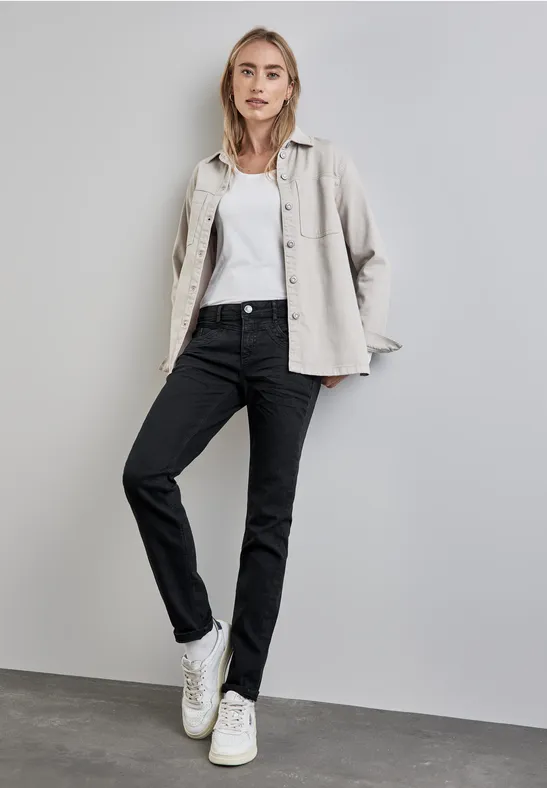 Tieto slim fit džínsy od Street One pre ženy majú stredne vysoký pás a úzke nohavice pre elegantnú siluetu.