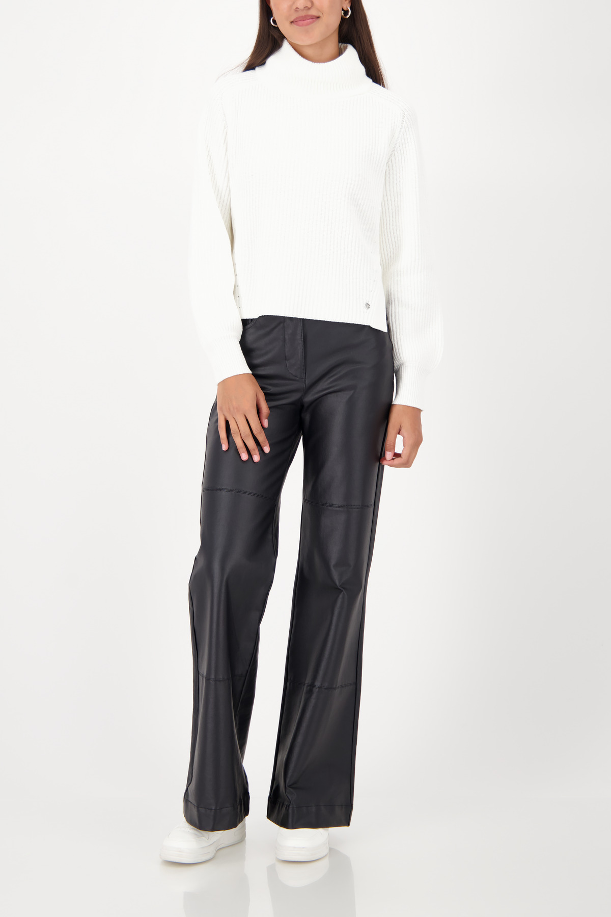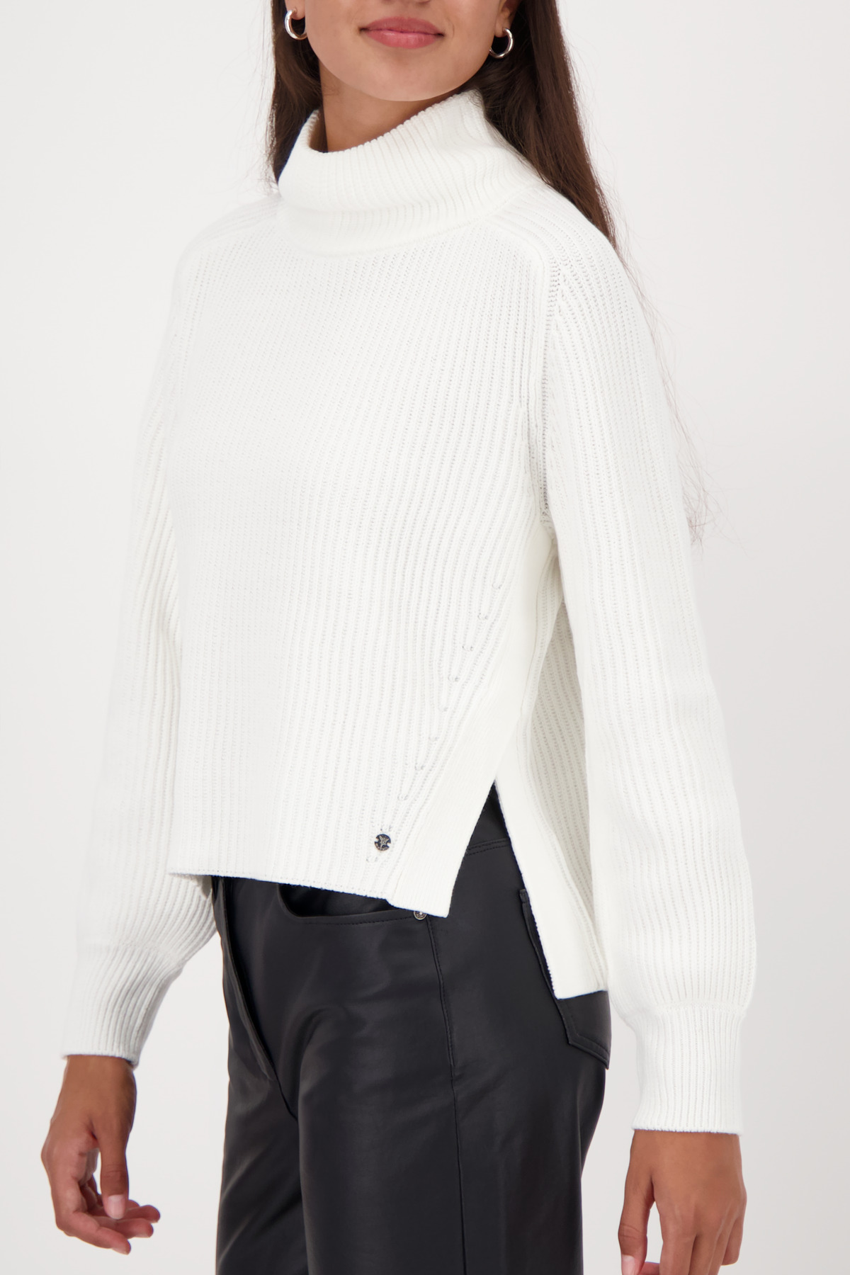 Tento elegantný pletený sveter s dlhým rukávom vyrobený z vysoko kvalitnej bavlnenej zmesi s bočnými rozparkami kombinuje štýl a pohodlie.