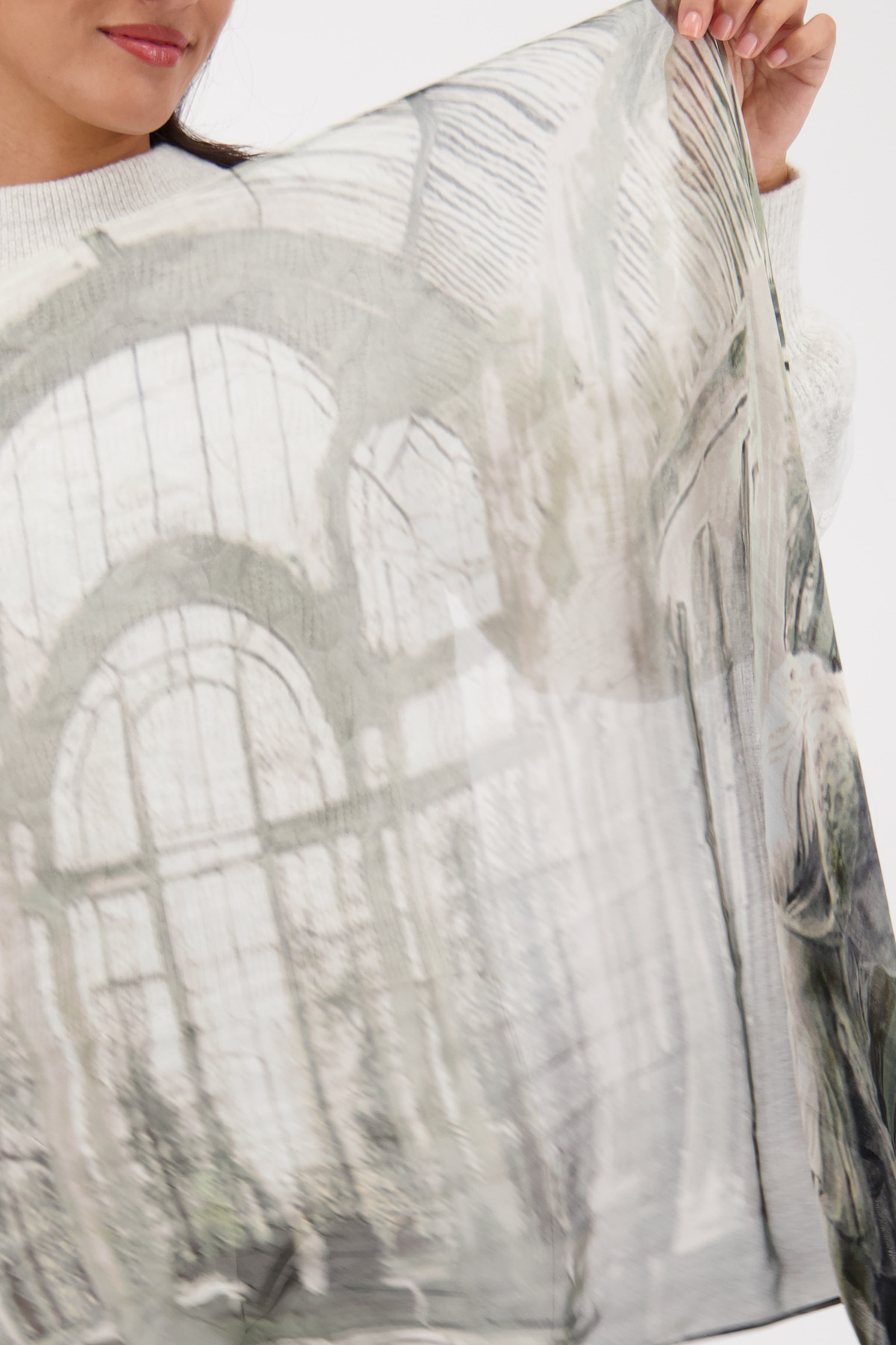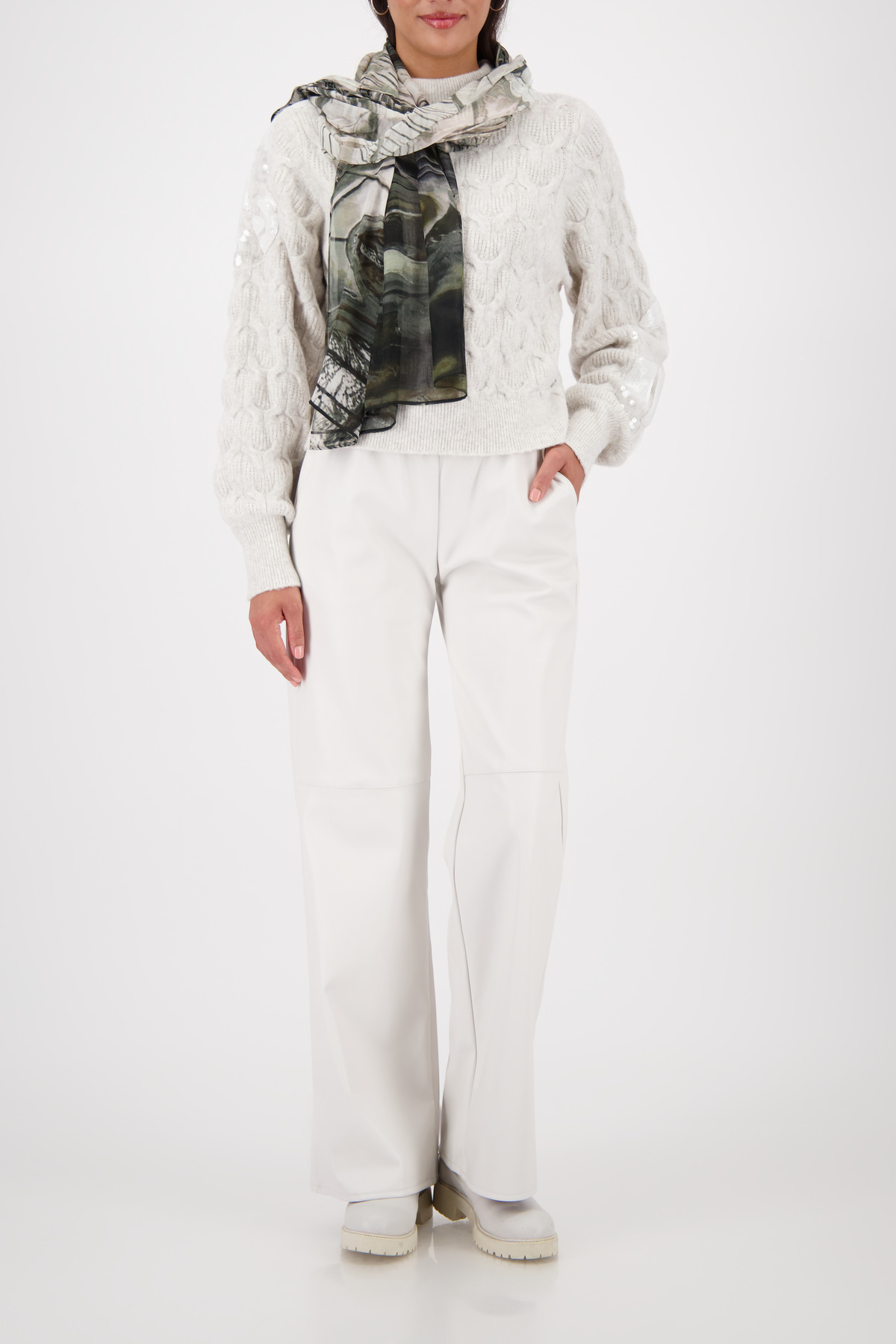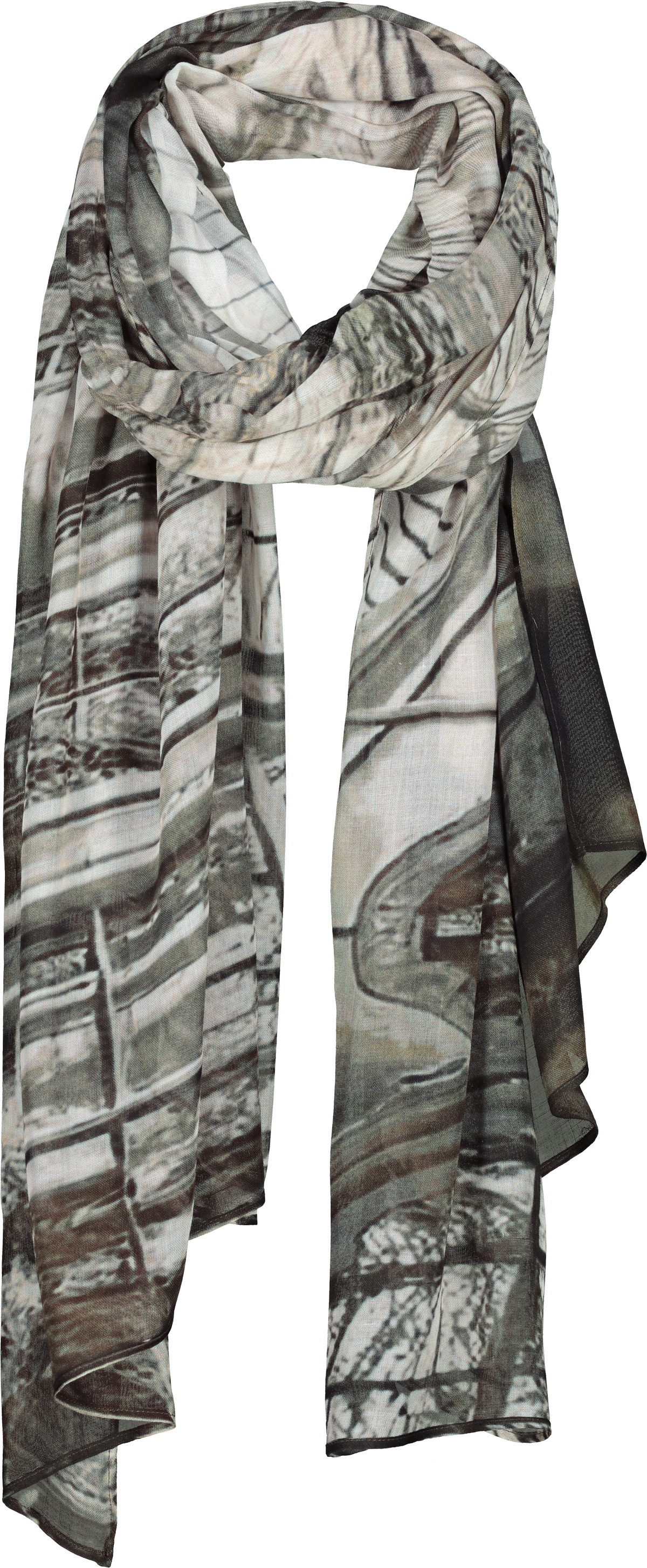 Táto módna šatka vyrobená z vlnitej viskózy zaujme výrazným celoplošným galériovým vzorom. Obdĺžnikový tvar umožňuje všestranné možnosti štýlu – či už ležérne prehodená okolo krku, ako čelenka alebo ako dekoratívny doplnok.