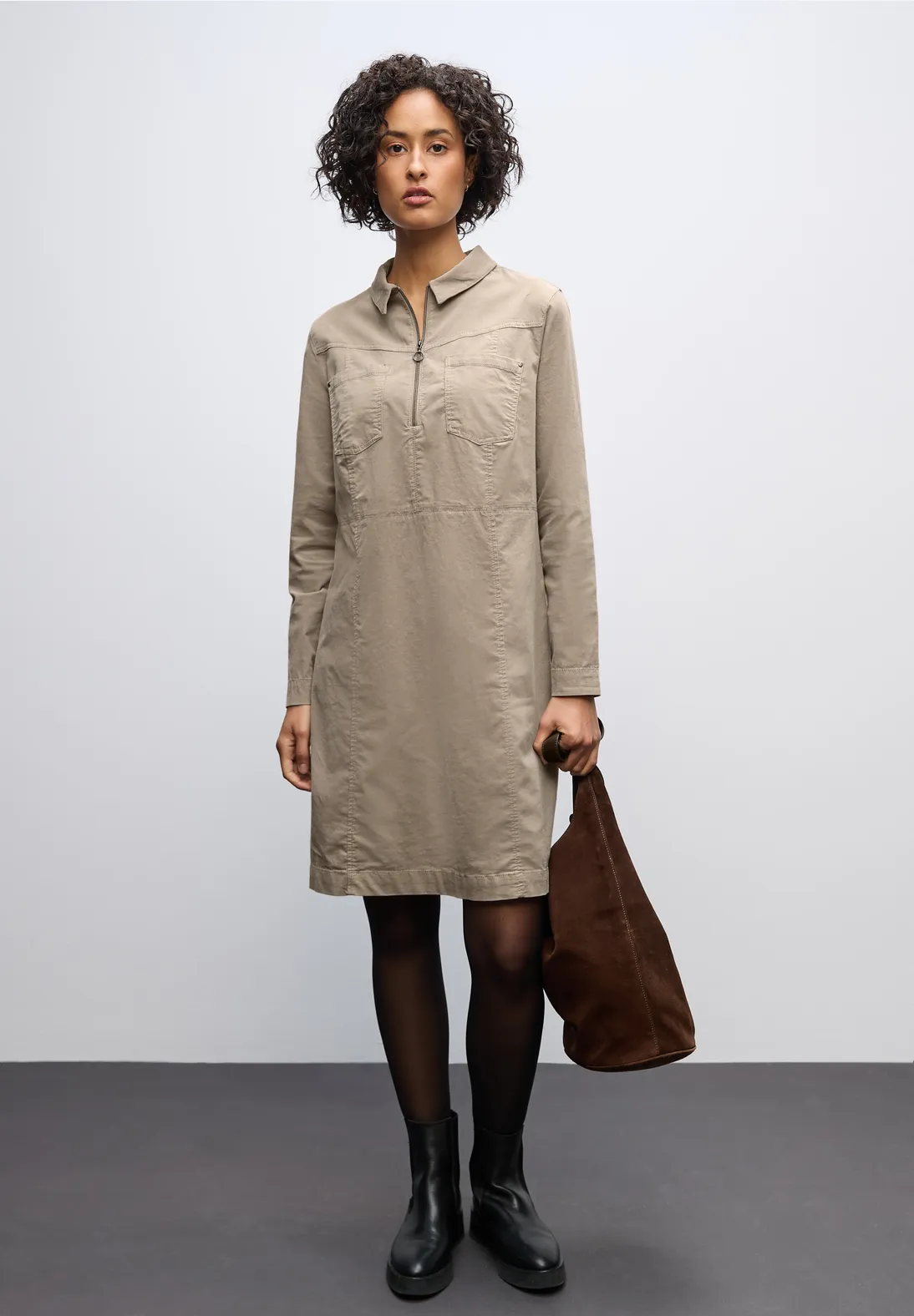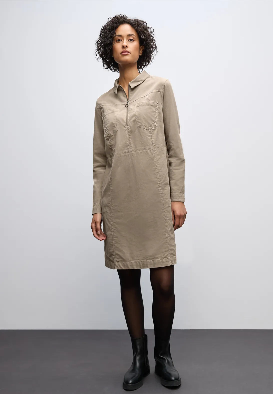 Ozdobný zips a našité náprsné vrecká dodávajú týmto šatám po kolená s košeľovým golierom moderný vzhľad.