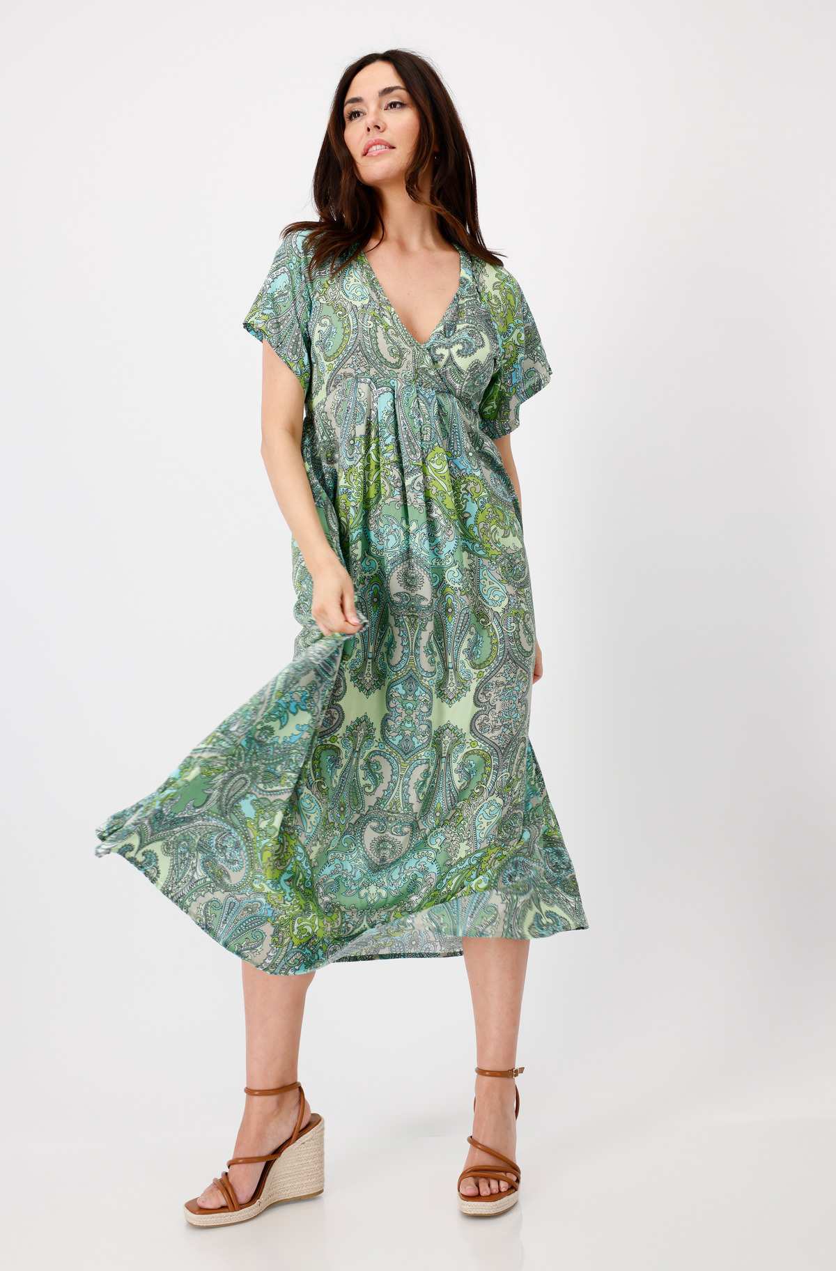 Maxi šaty zo 100% viskózy s paisley vzorom,výstrihom do V a krátkymi rukávmi.