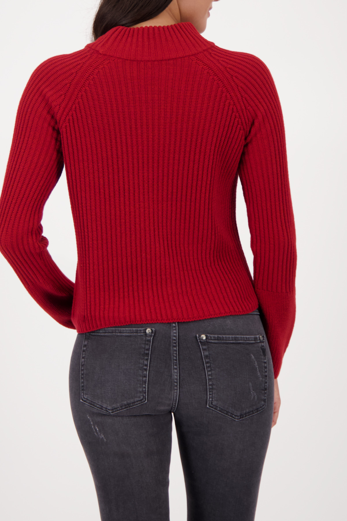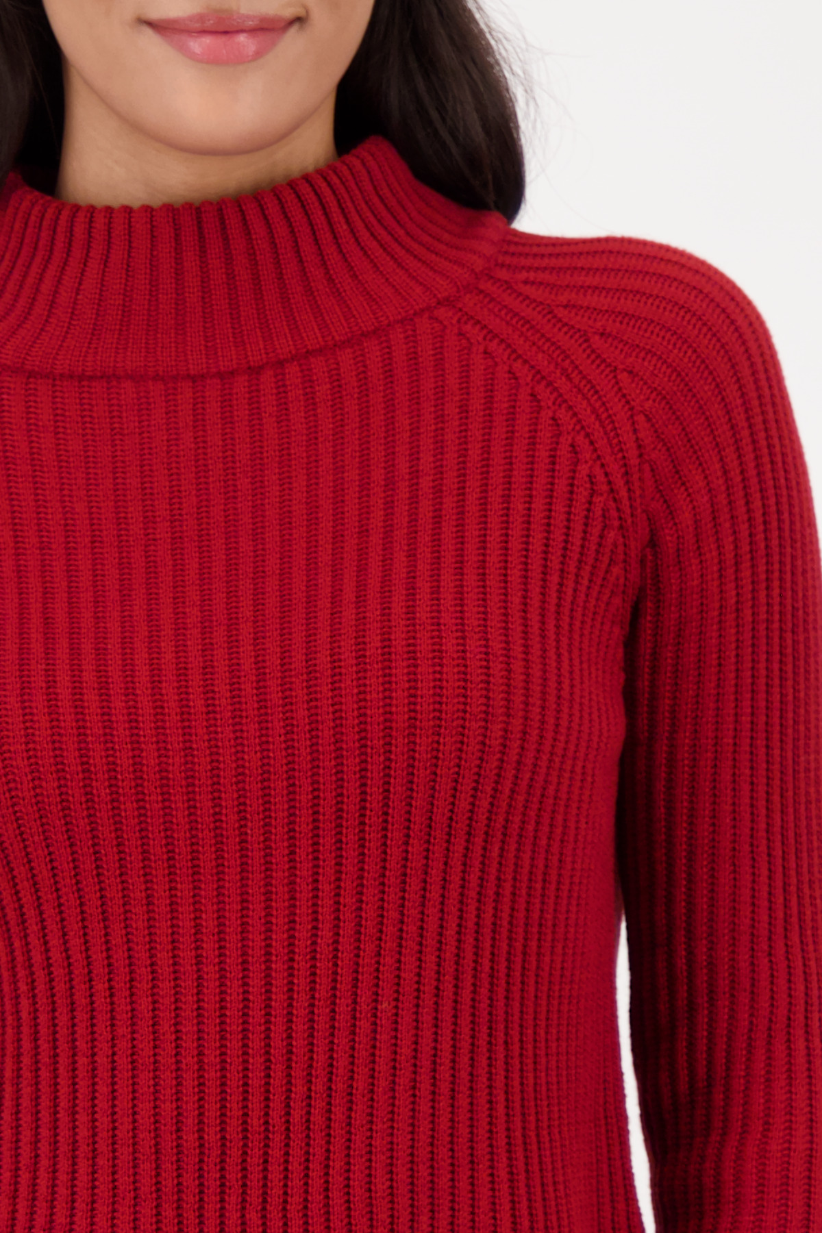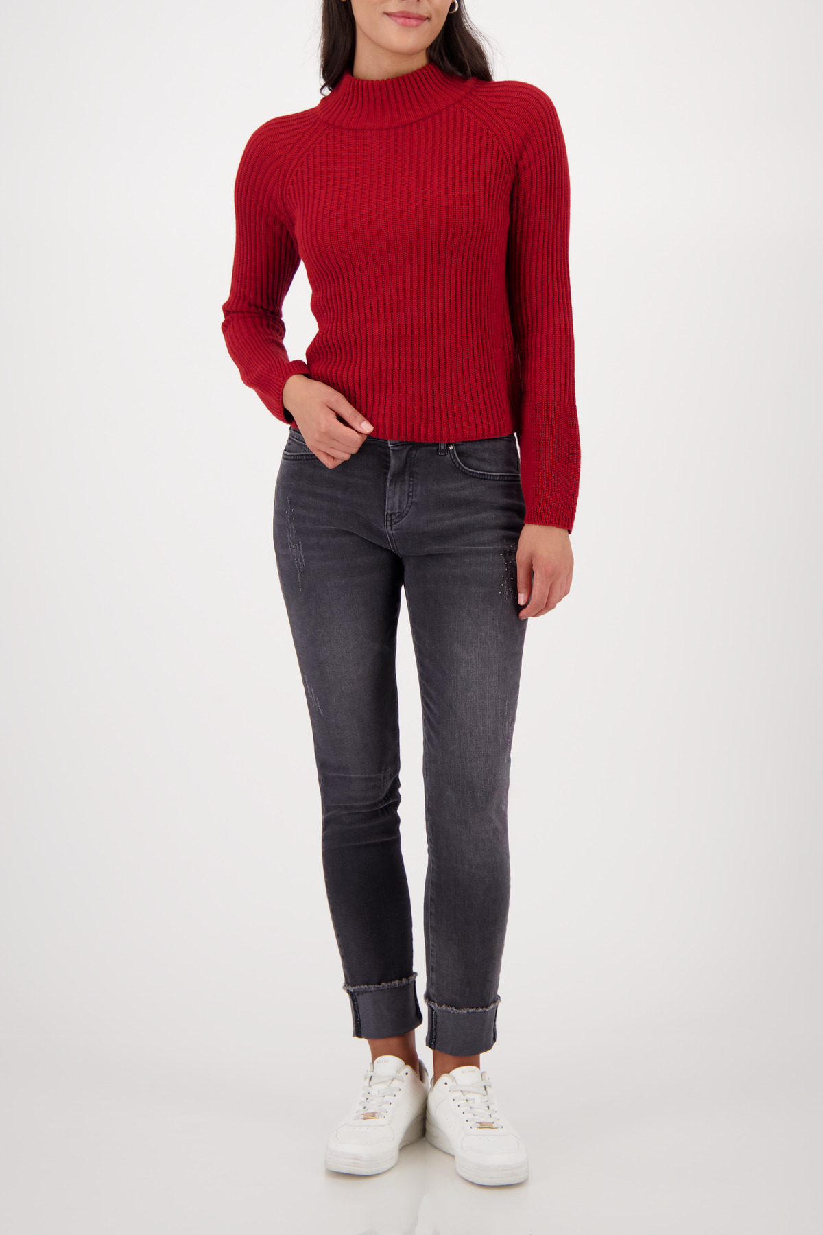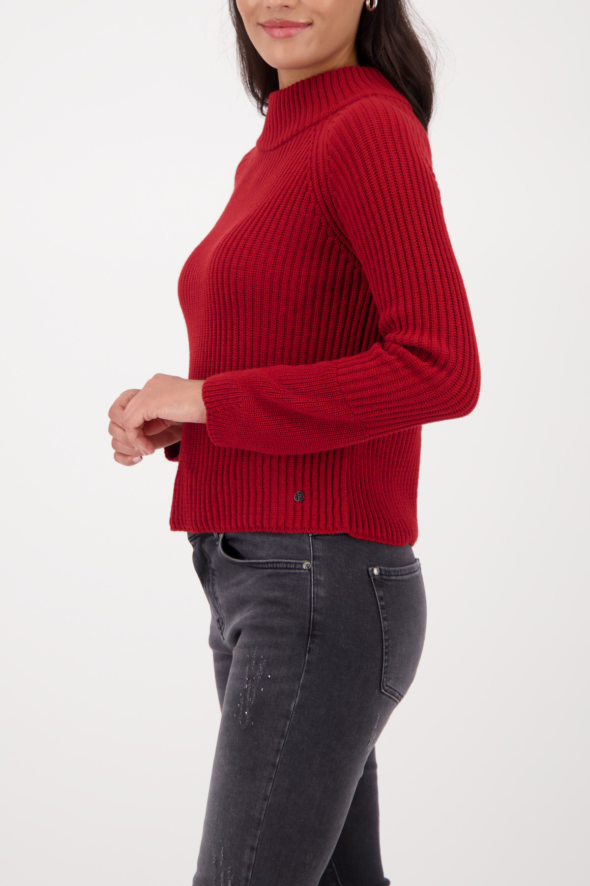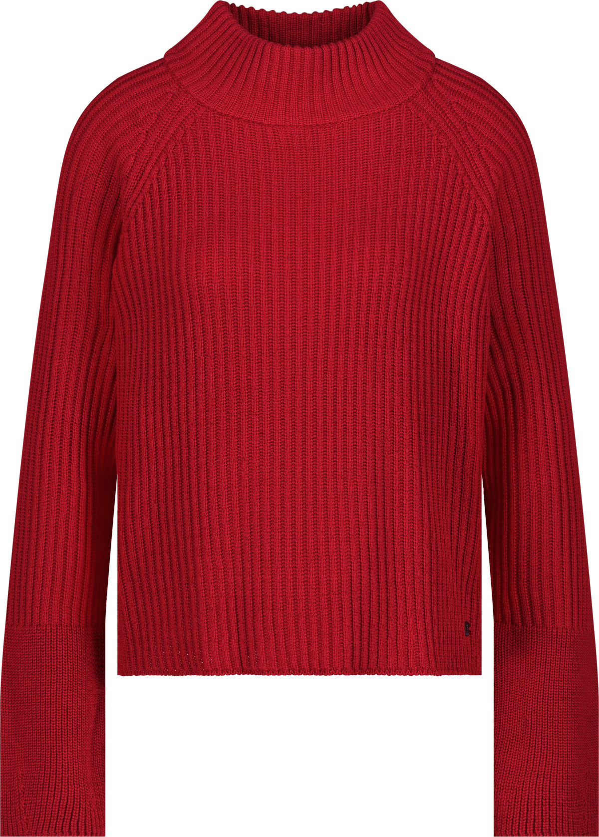 Tento štýlový pletený sveter vyrobený z vysoko kvalitnej bavlny zaujme elegantnou rebrovanou textúrou a širokým lemom rukávov.