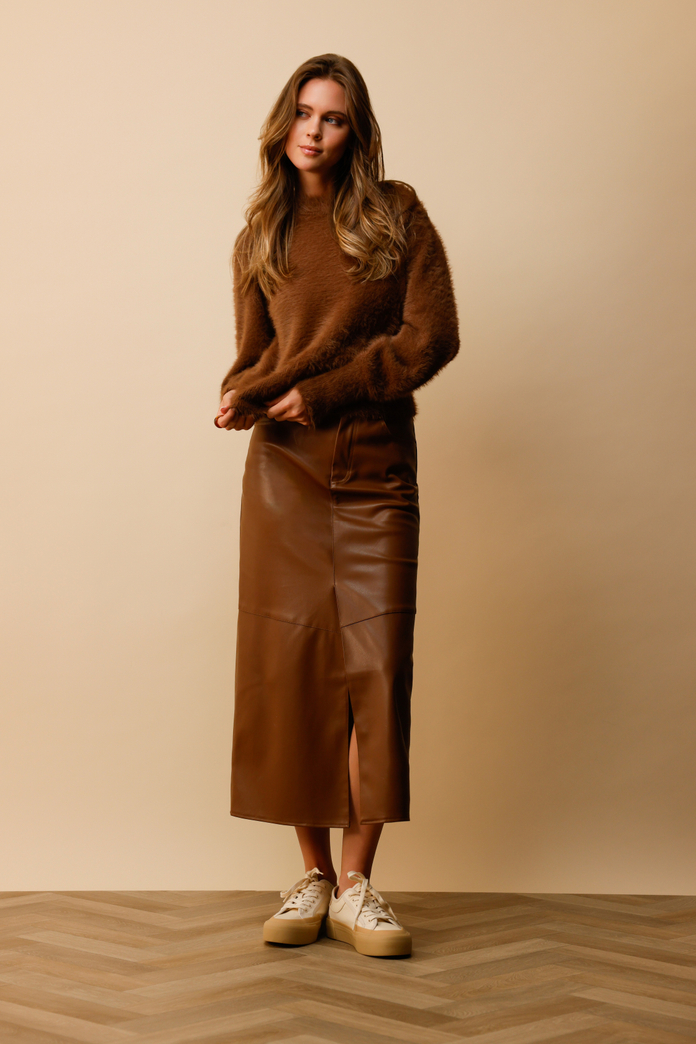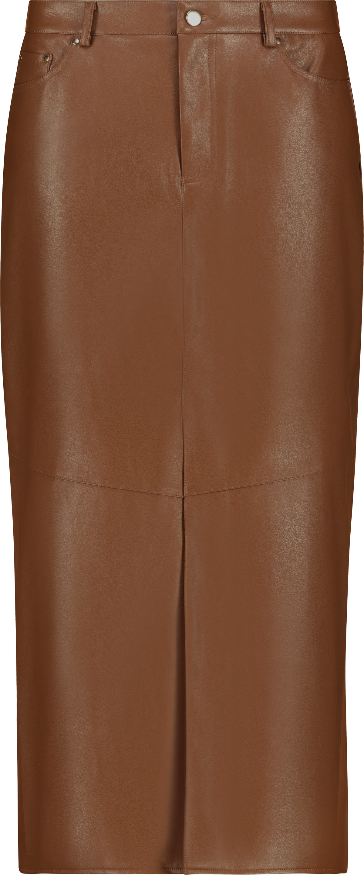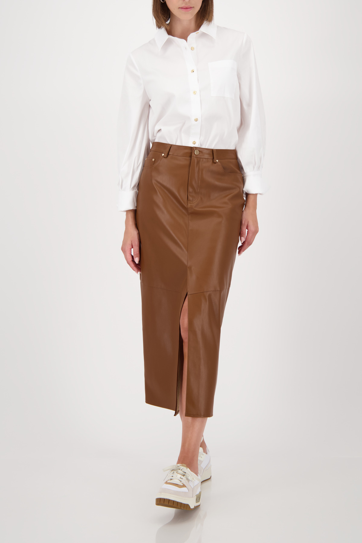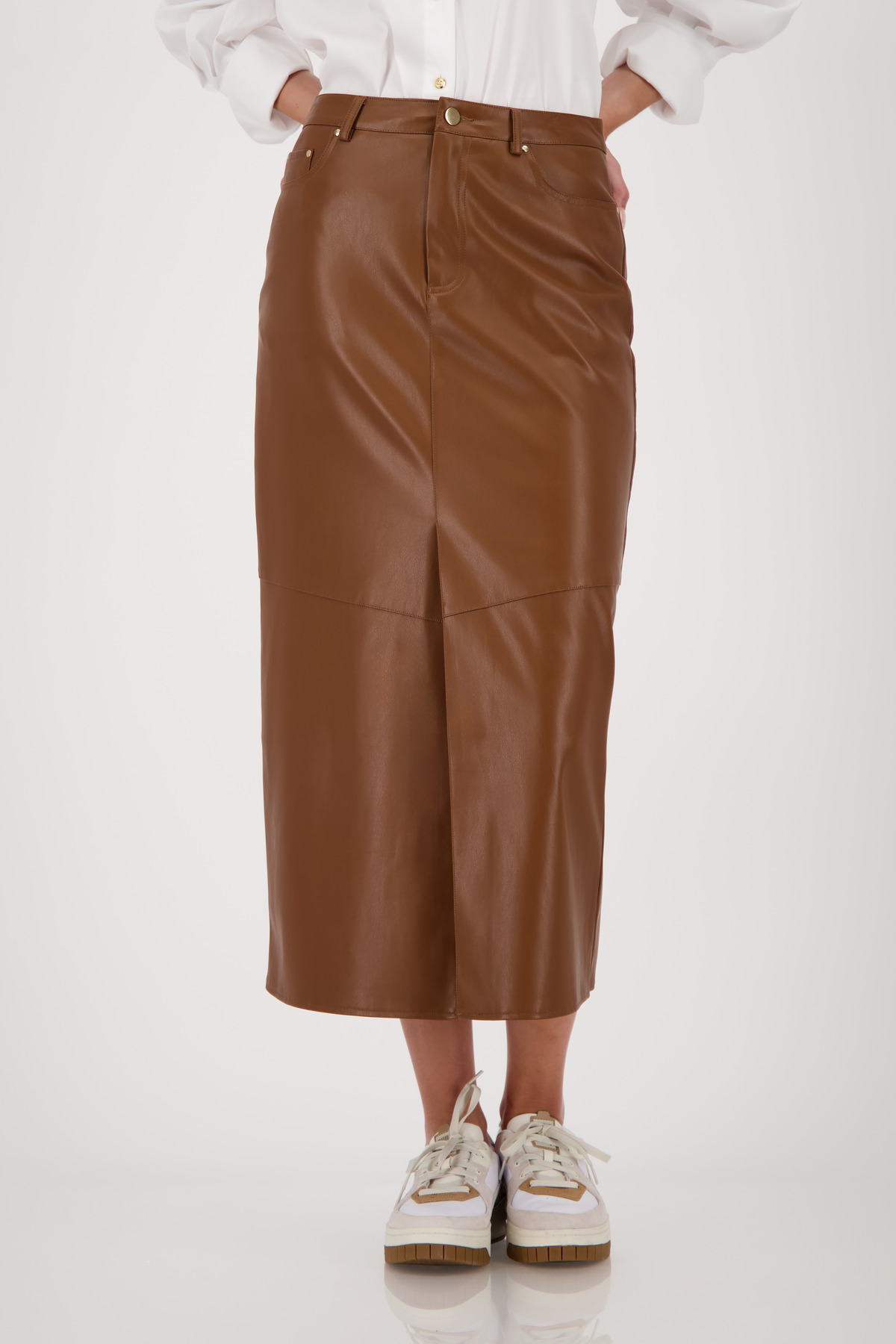 Štýlová midi sukňa v sofistikovanom koženom vzhľade s predným rozparkom a viacerými vreckami pre výrazný vzhľad.