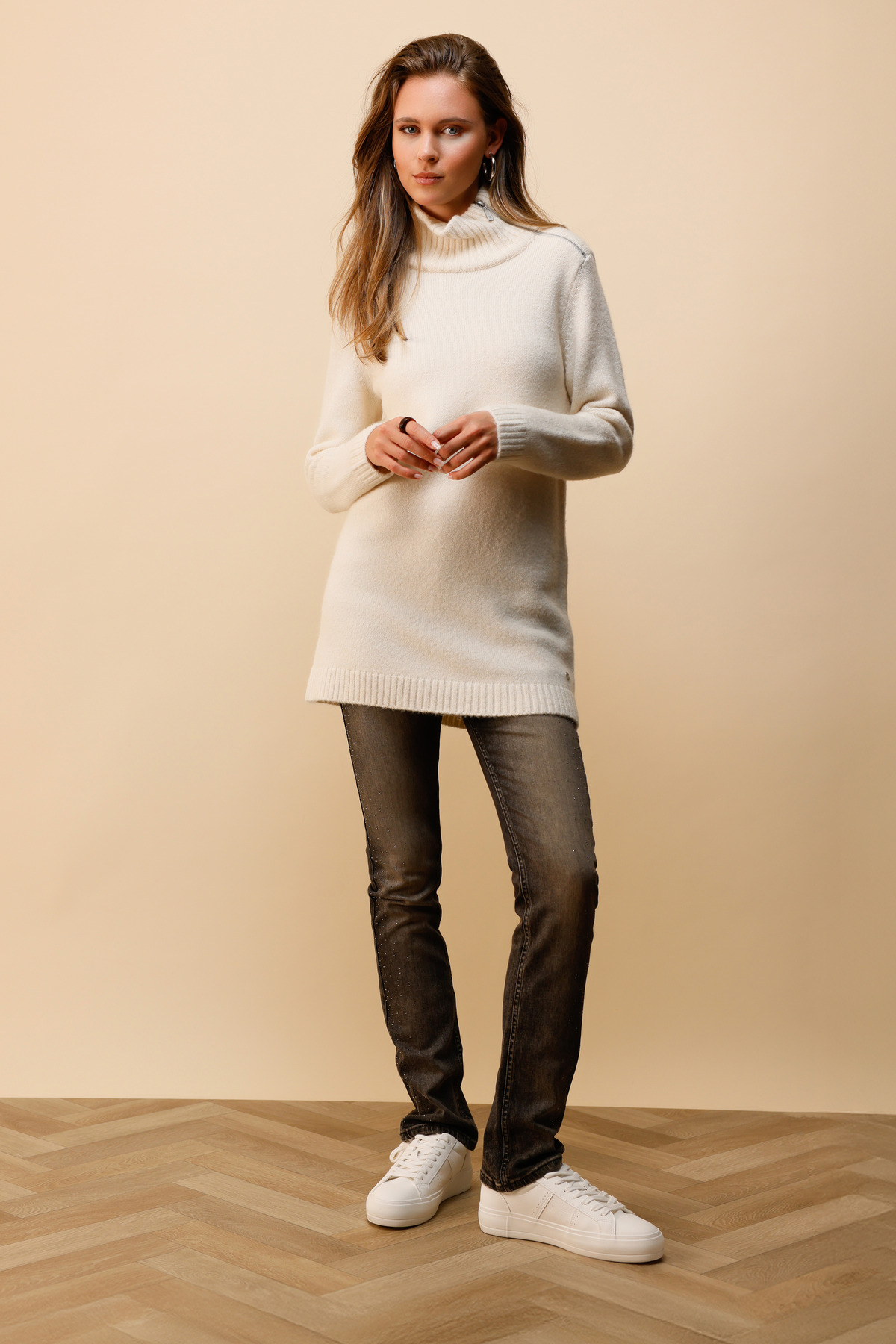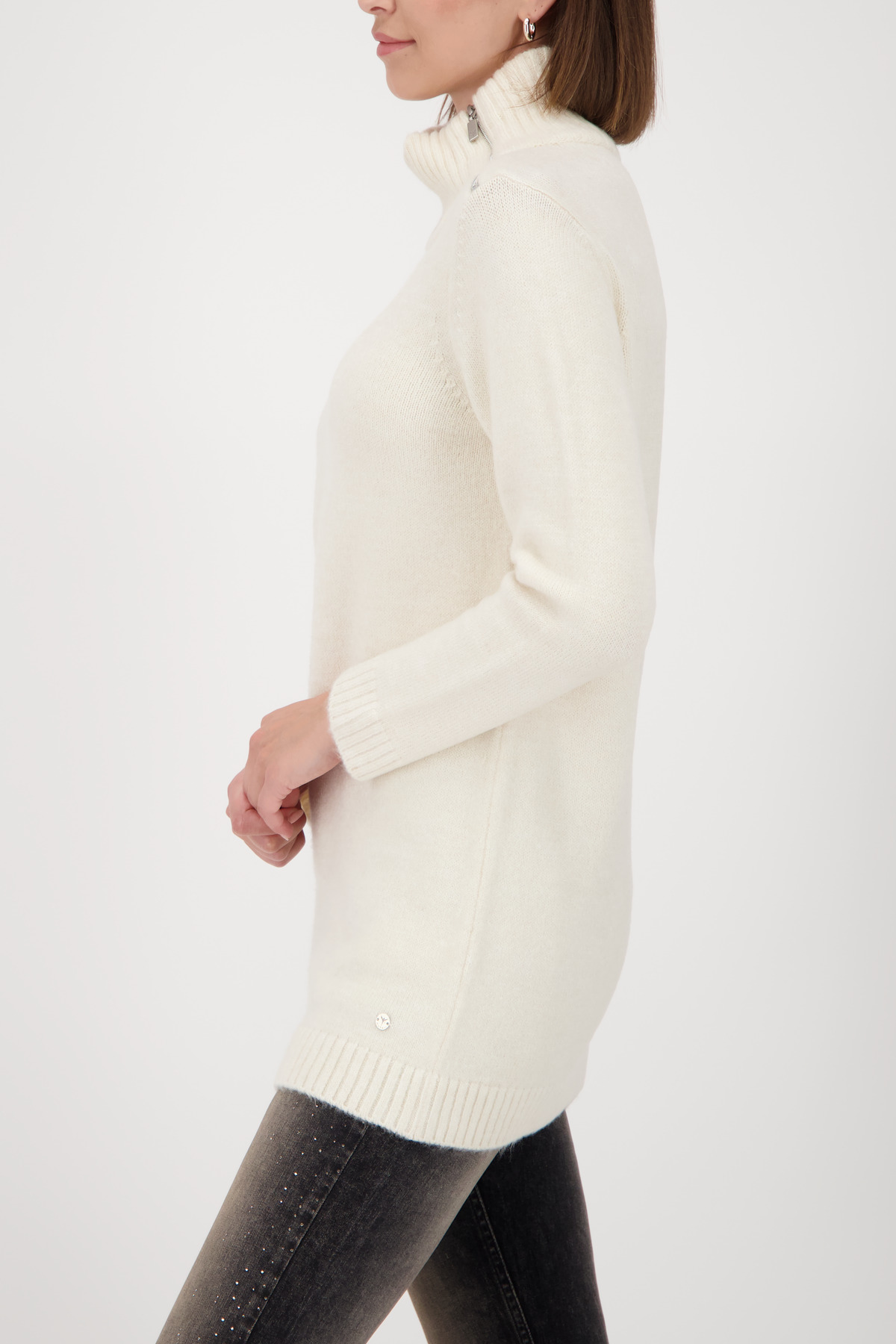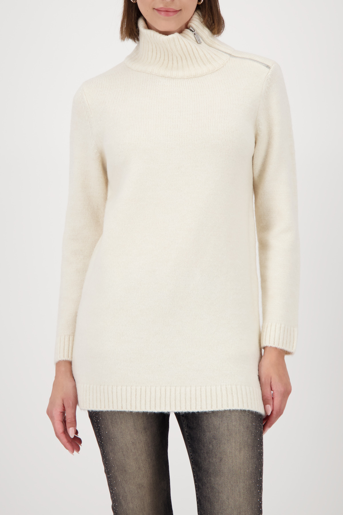 Štýlový pletený sveter z padavej viskózy, dlhého strihu a so zipsom na stojačiku.