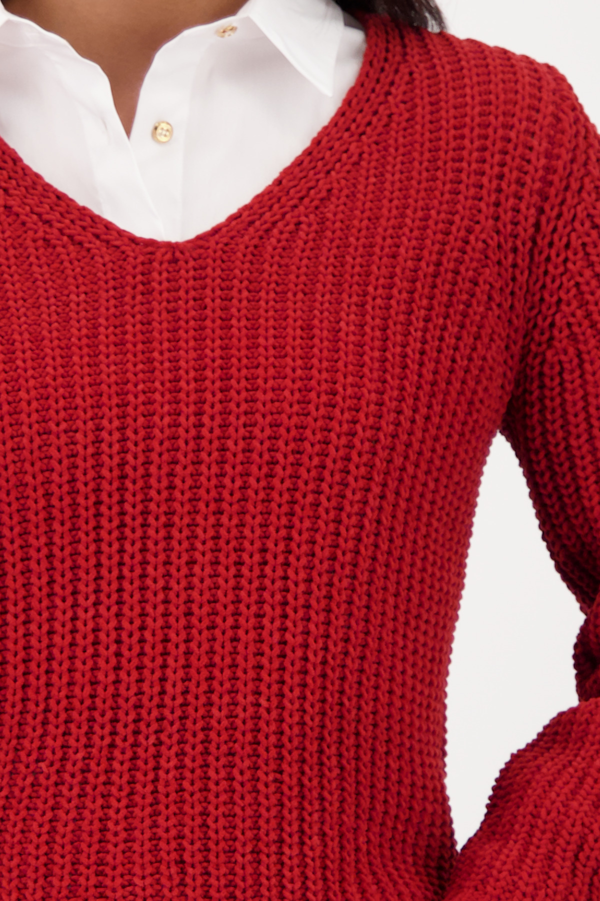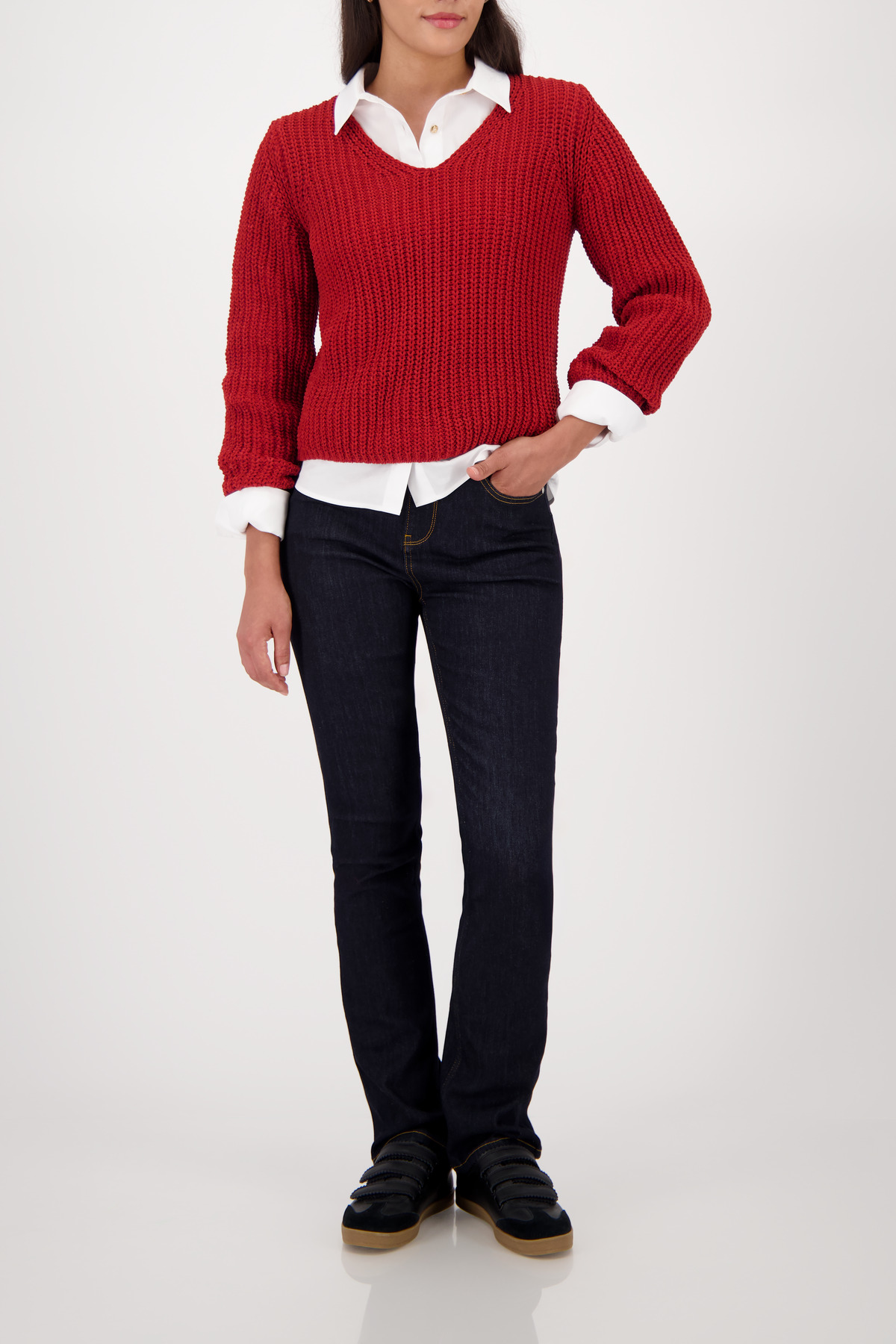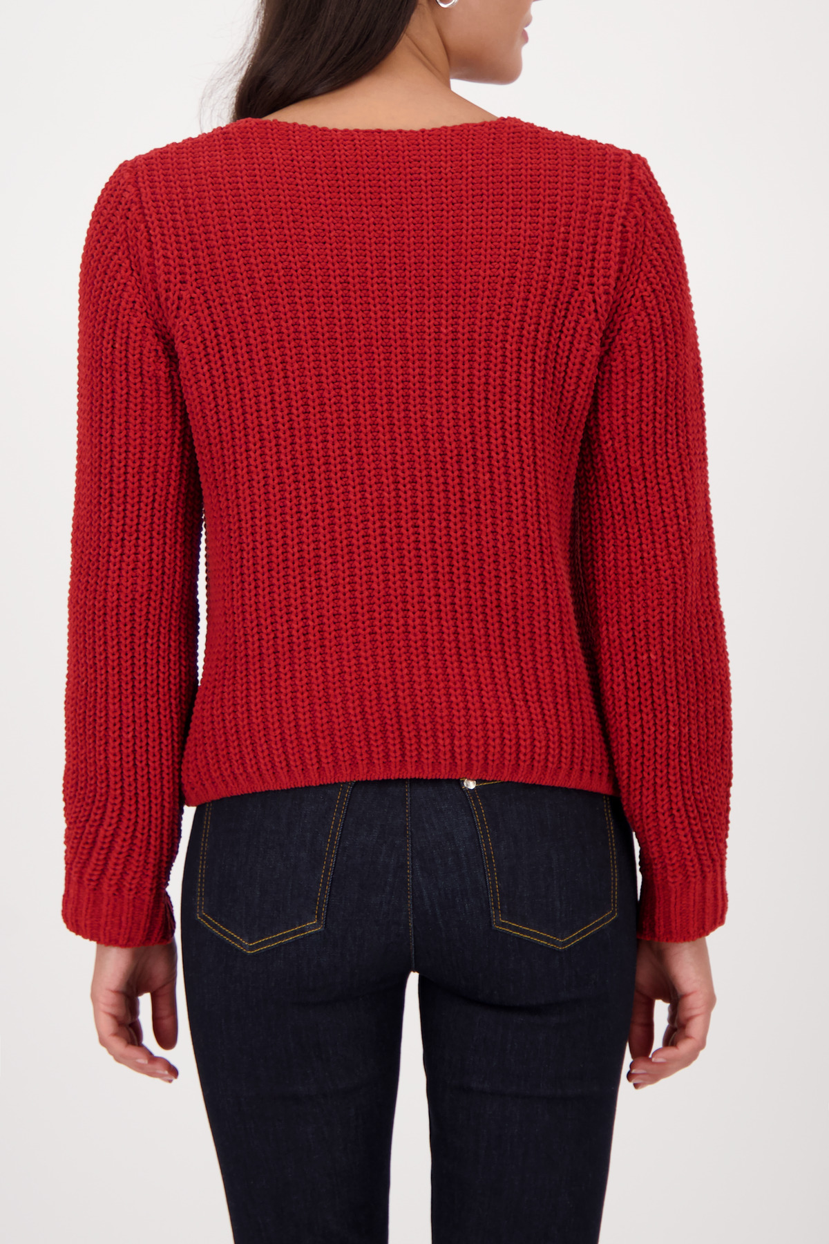 Tento sveter vyrobený z mäkkej ženilkovej priadze zaujme výrazným perleťovým strapcovým vzorom a klasickým výstrihom do V.